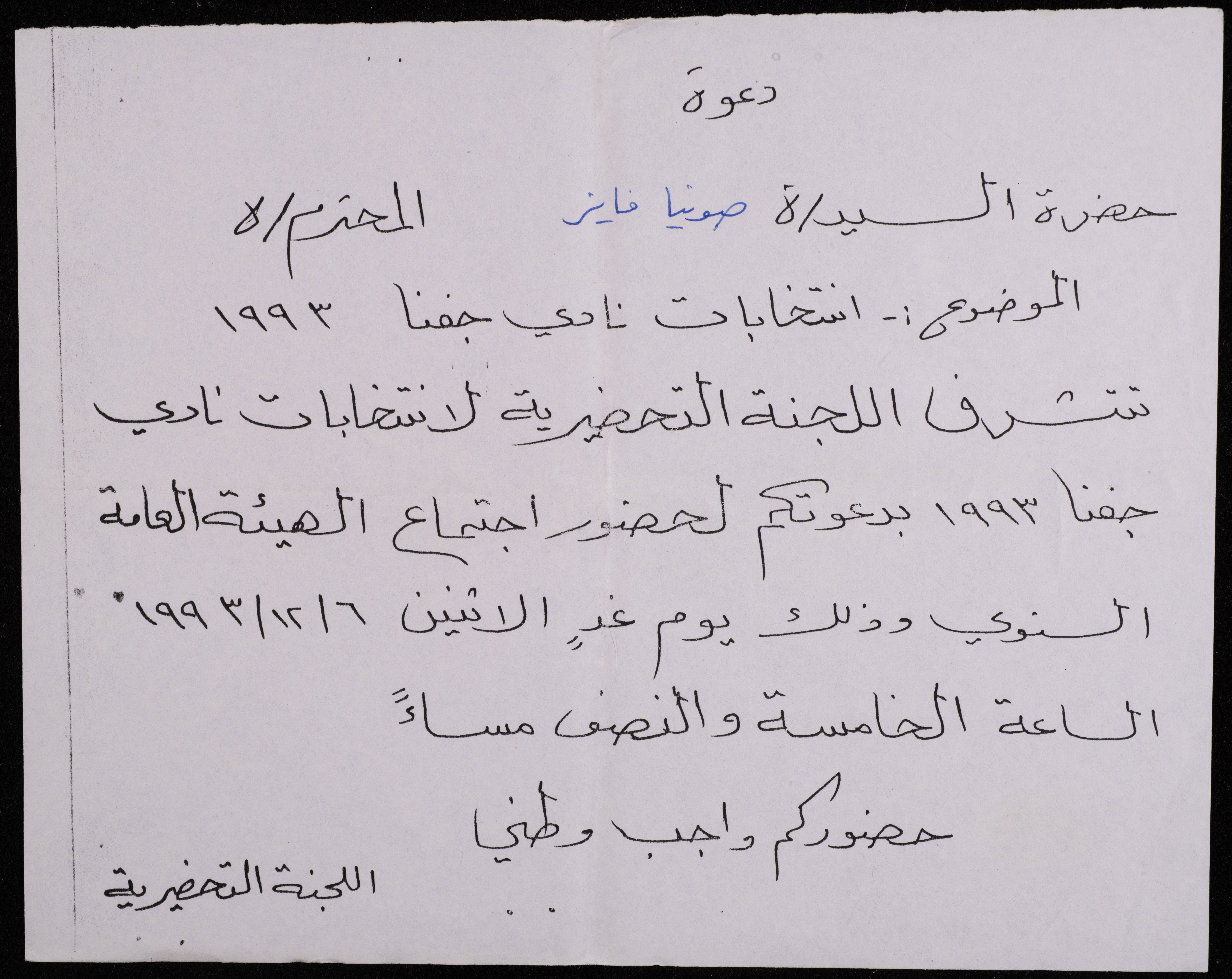 An Invitation to Attend the Jifna Club Elections Sent to Sofia Makhlouf, 5 December 1993
