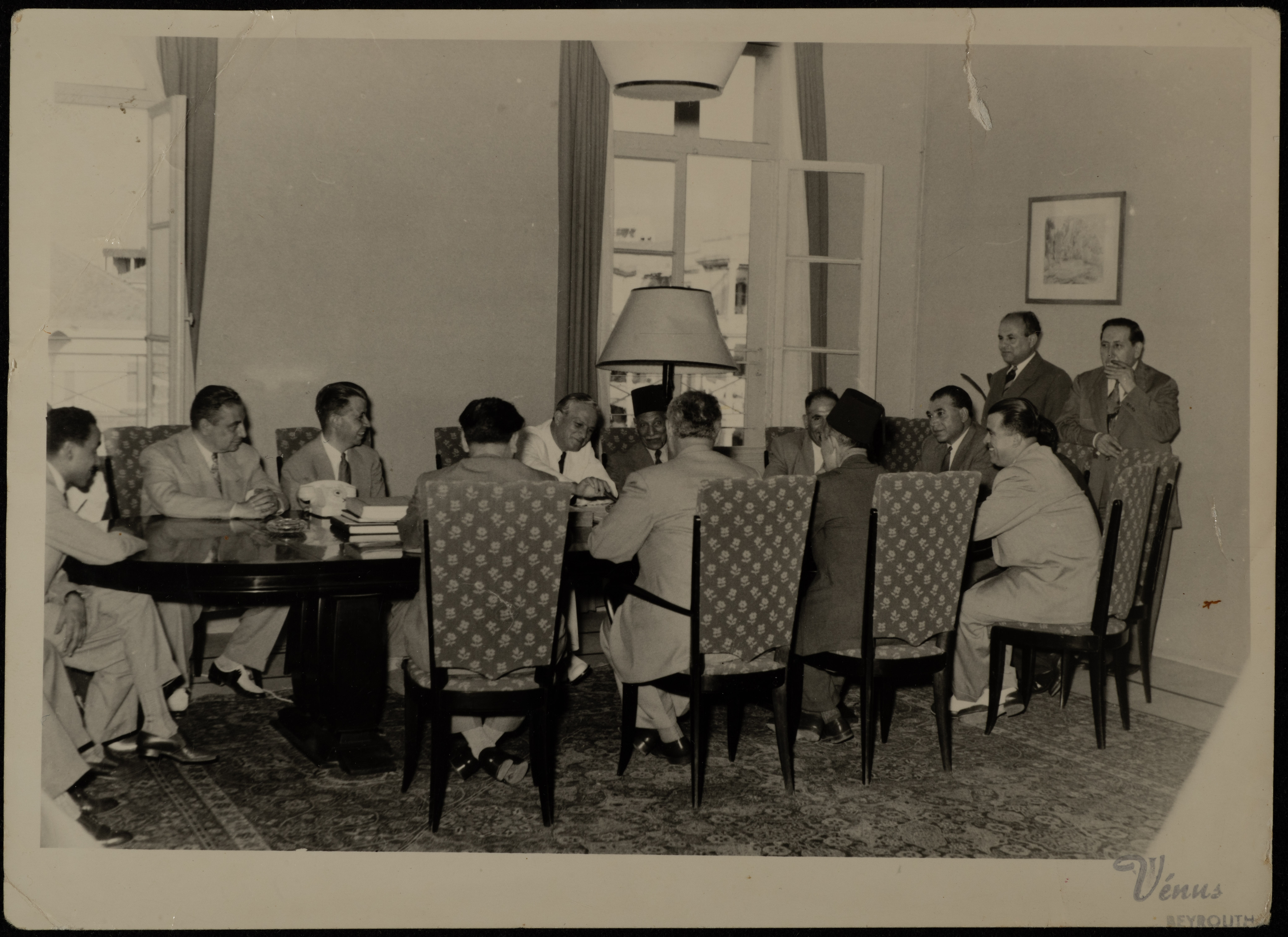 يحيى حمودة في اجتماع لكميل شمعون، رئيس الجمهورية اللبنانية، مع عدد من الشخصيات العربية، في الفترة ما بين عامي 1953 و1954.