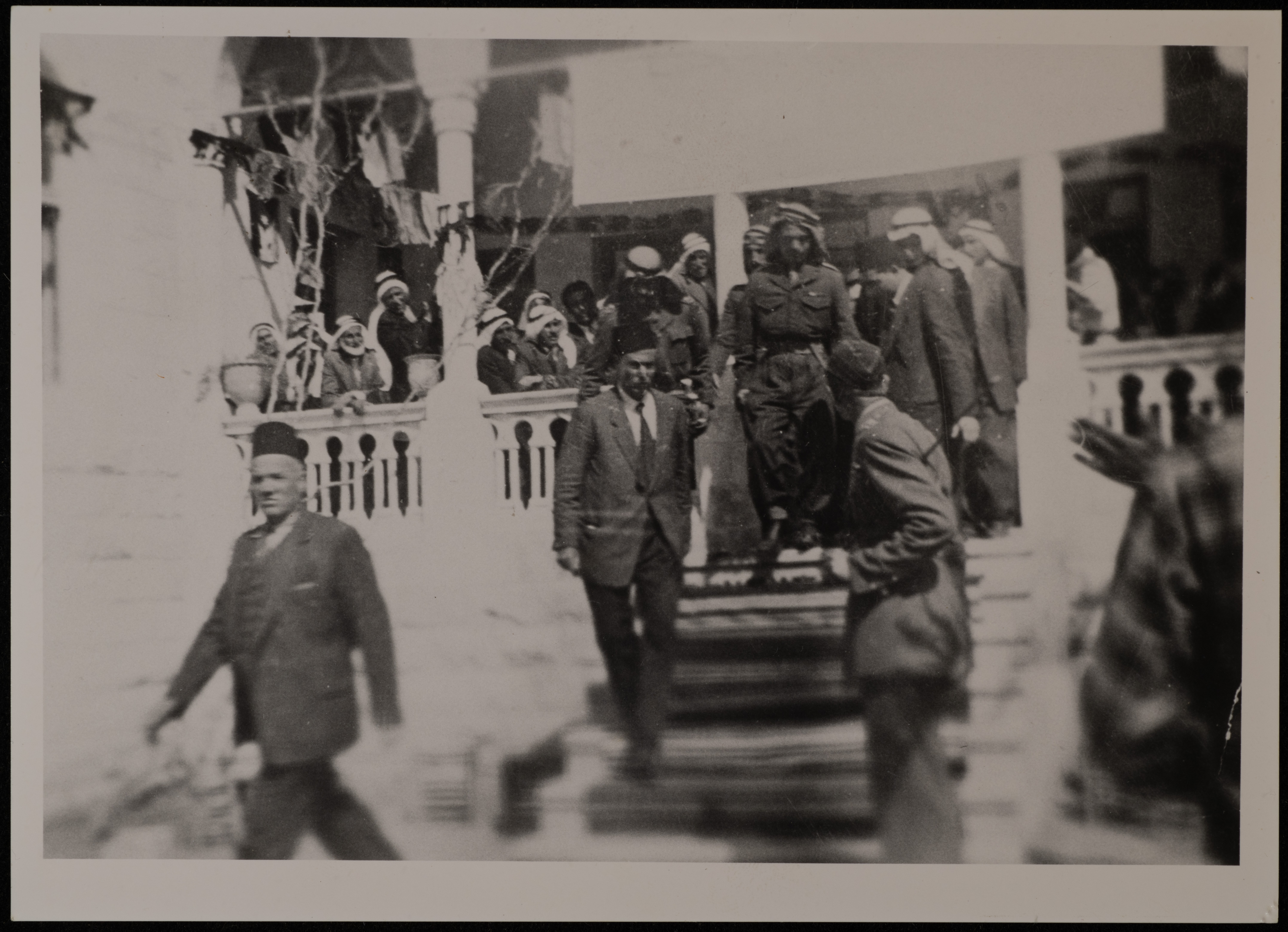 الملك حسين بن طلال، ملك الأردن، وعدد من الشخصيات الرسمية والوجهاء خلال إحدى زياراته الرسمية في خمسينيات القرن العشرين.