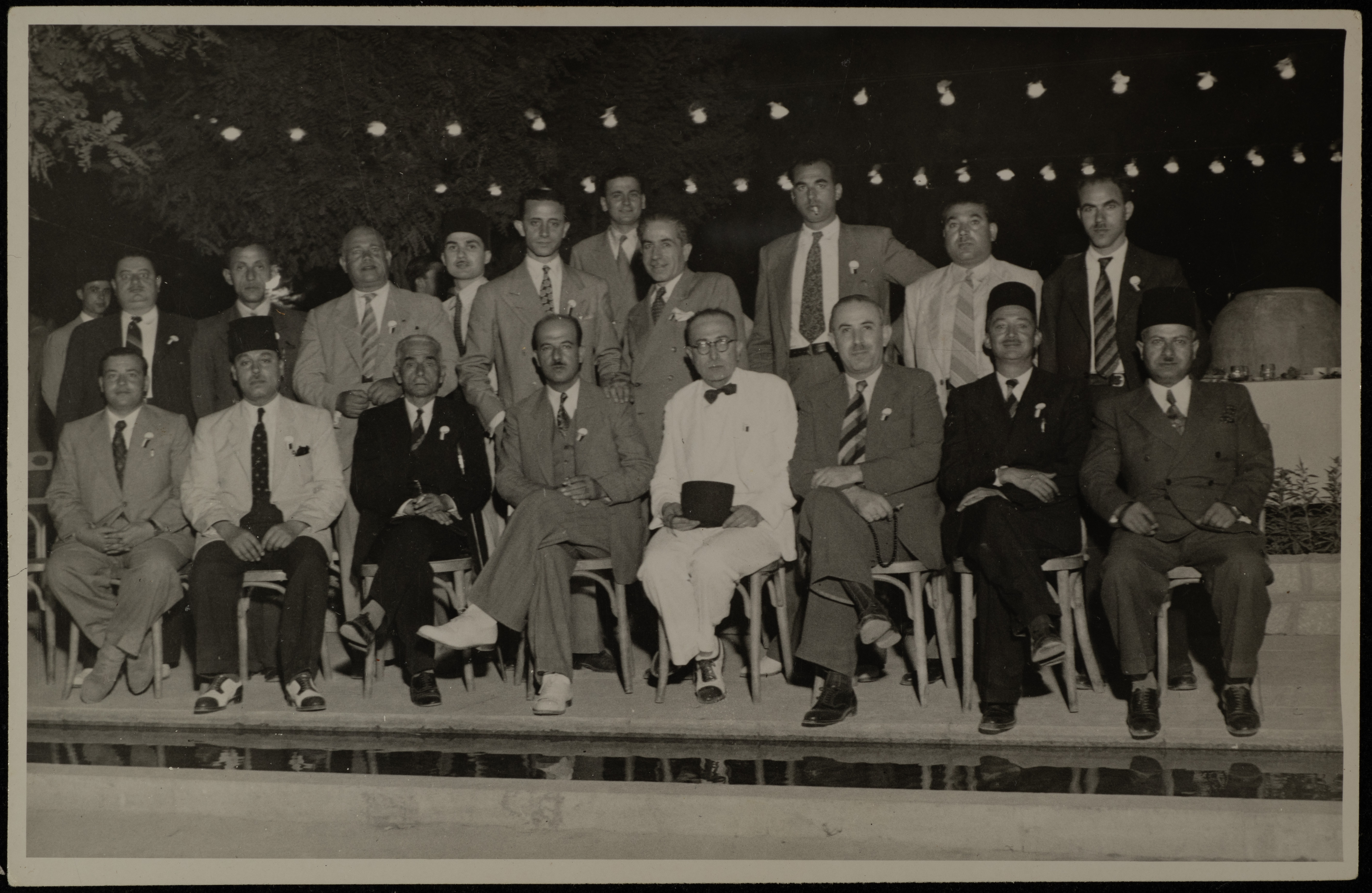 يحيى حمودة برفقة عدد من المشاركين في مؤتمر المحامين العرب الأول، الذي عقد في فندق أوربان بلاس في دمشق في تموز 1945.