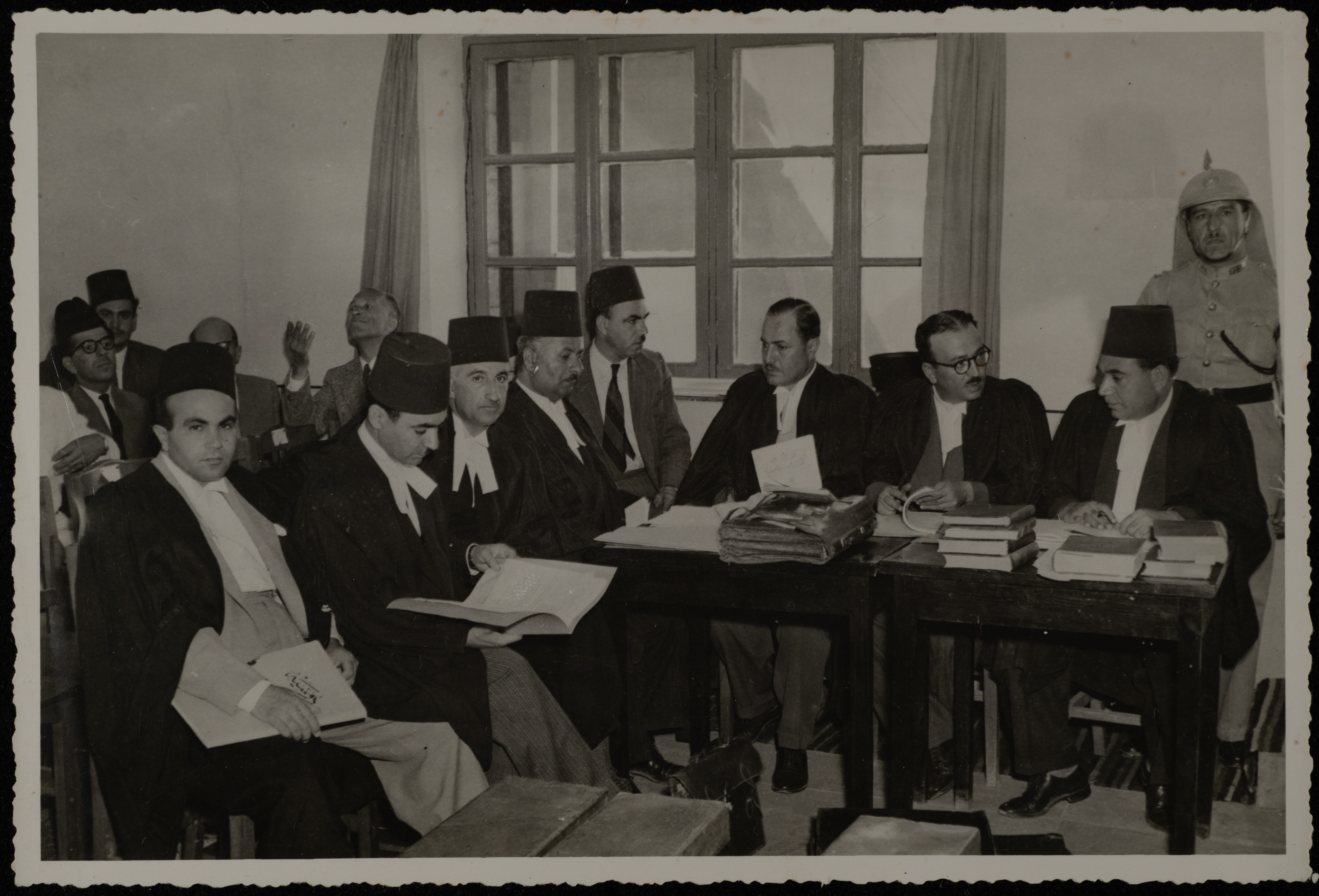يحيى حمودة وزملاؤه المحامون في قاعة المحكمة، في خمسينيات القرن العشرين.
