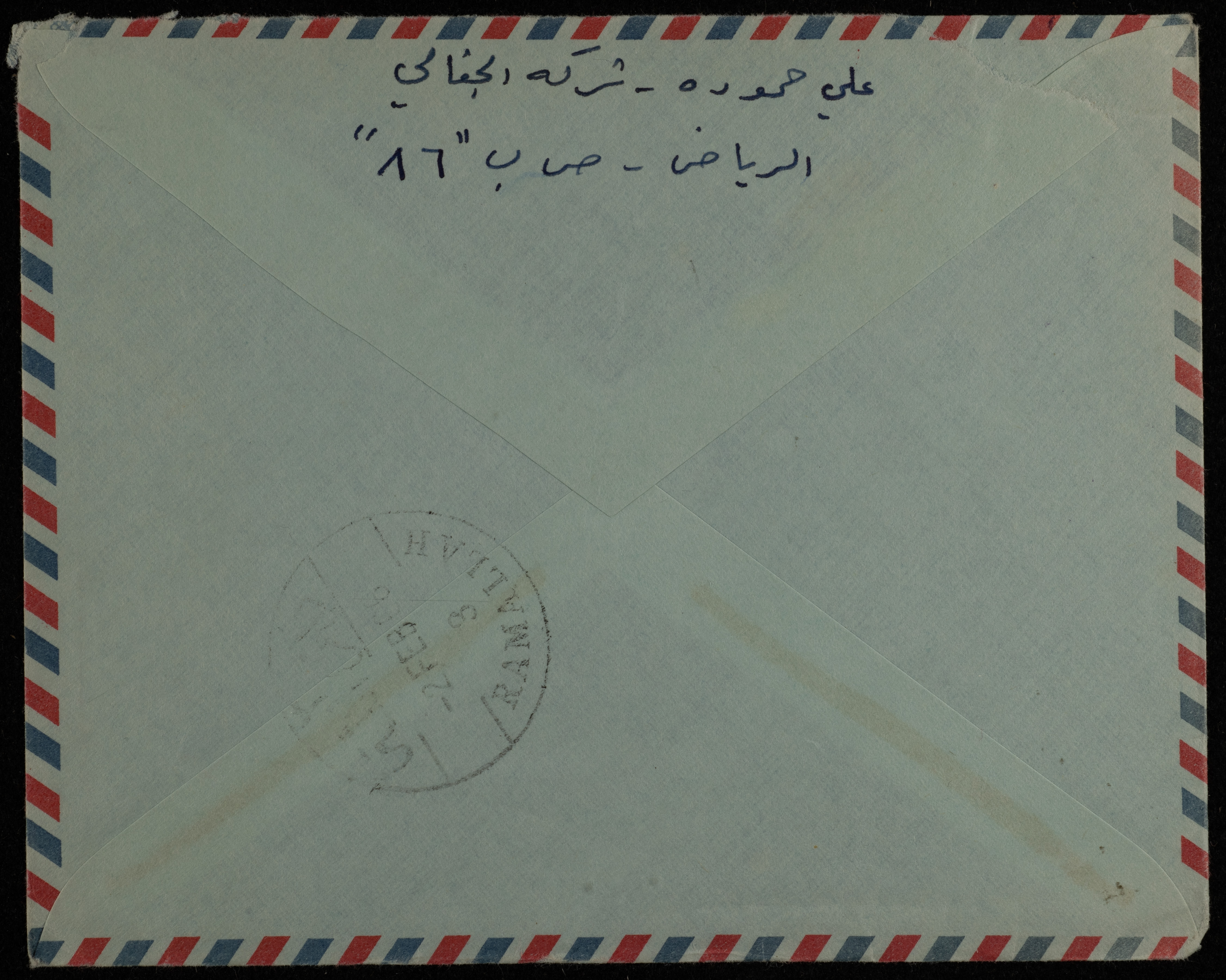 Sent on 25 January 1966 and sealed with Riyadh postcard, this document shows a letter from Ali Hammoudeh in Riyadh to his uncle Yahya Hammoudeh in Ramallah, congratulating him on the birth of his son Ismael.
