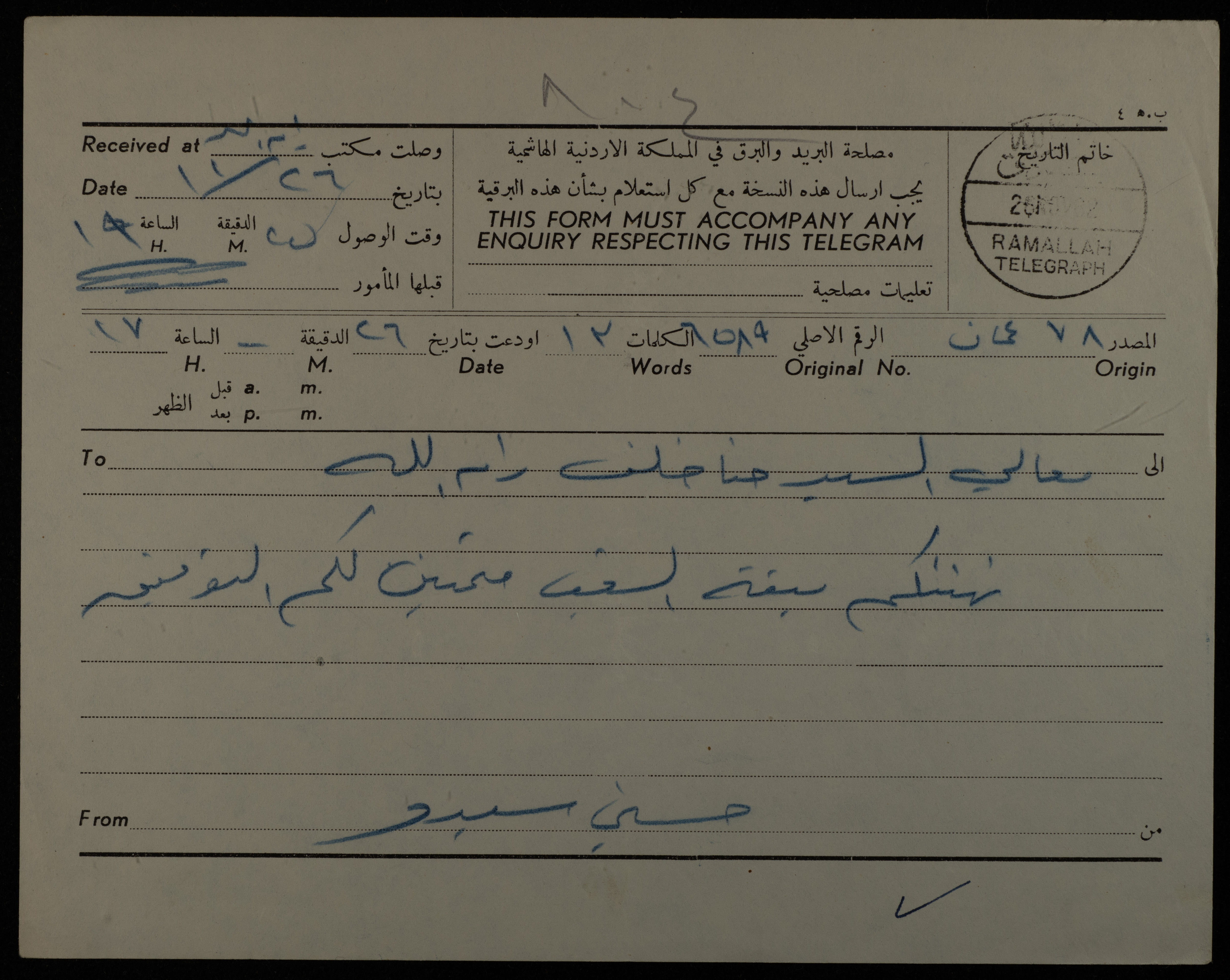 برقية مؤرخة في 26 تشرين 1962، مرسلة من شخص يدعى حسني في عمان إلى حنا خلف في رام الله لتهنئته بفوزه في الانتخابات النيابية الأردنية، مختومة بختم برق رام الله، ومروسة بترويسة مصلحة البرق والبريد في المملكة الأردنية.