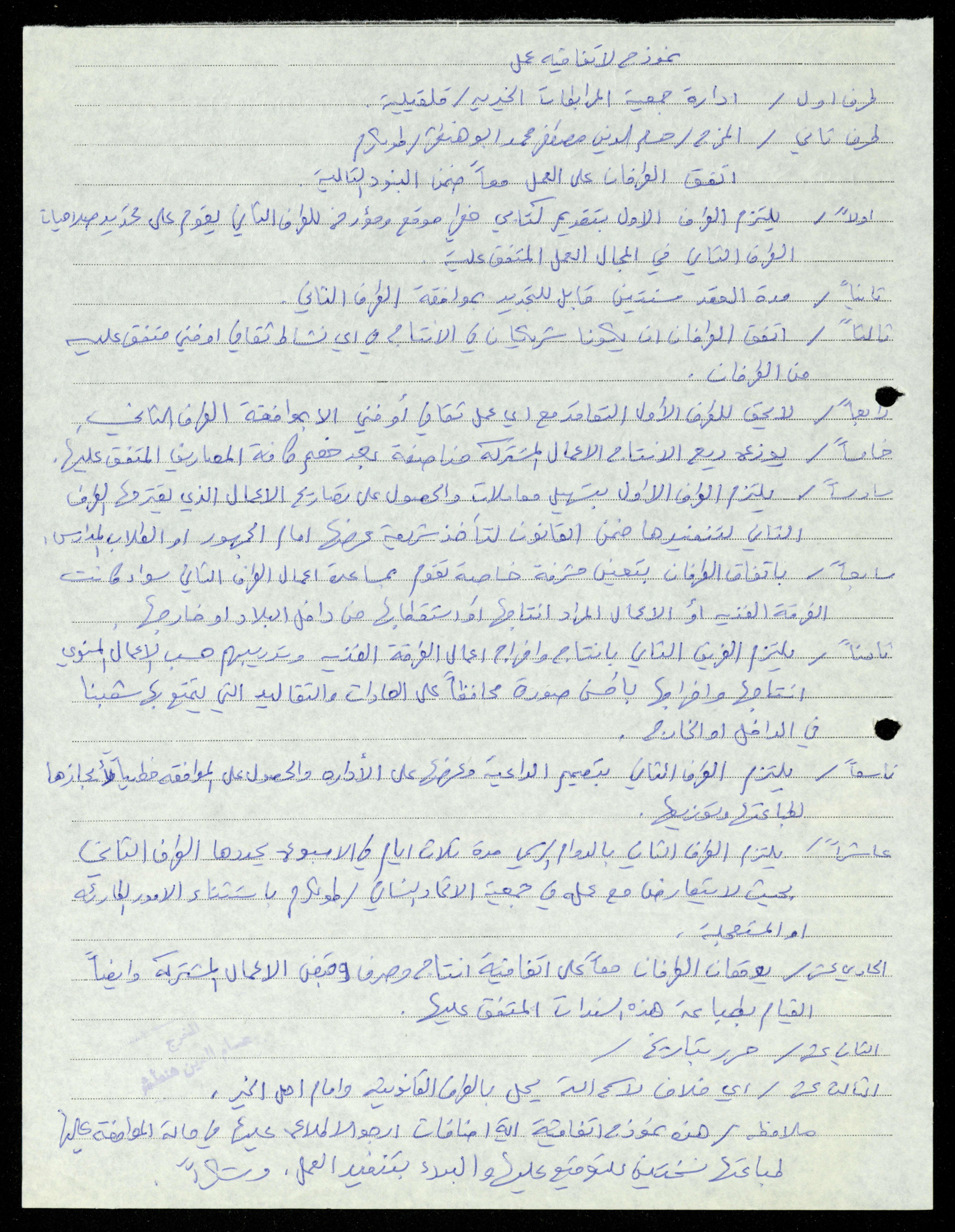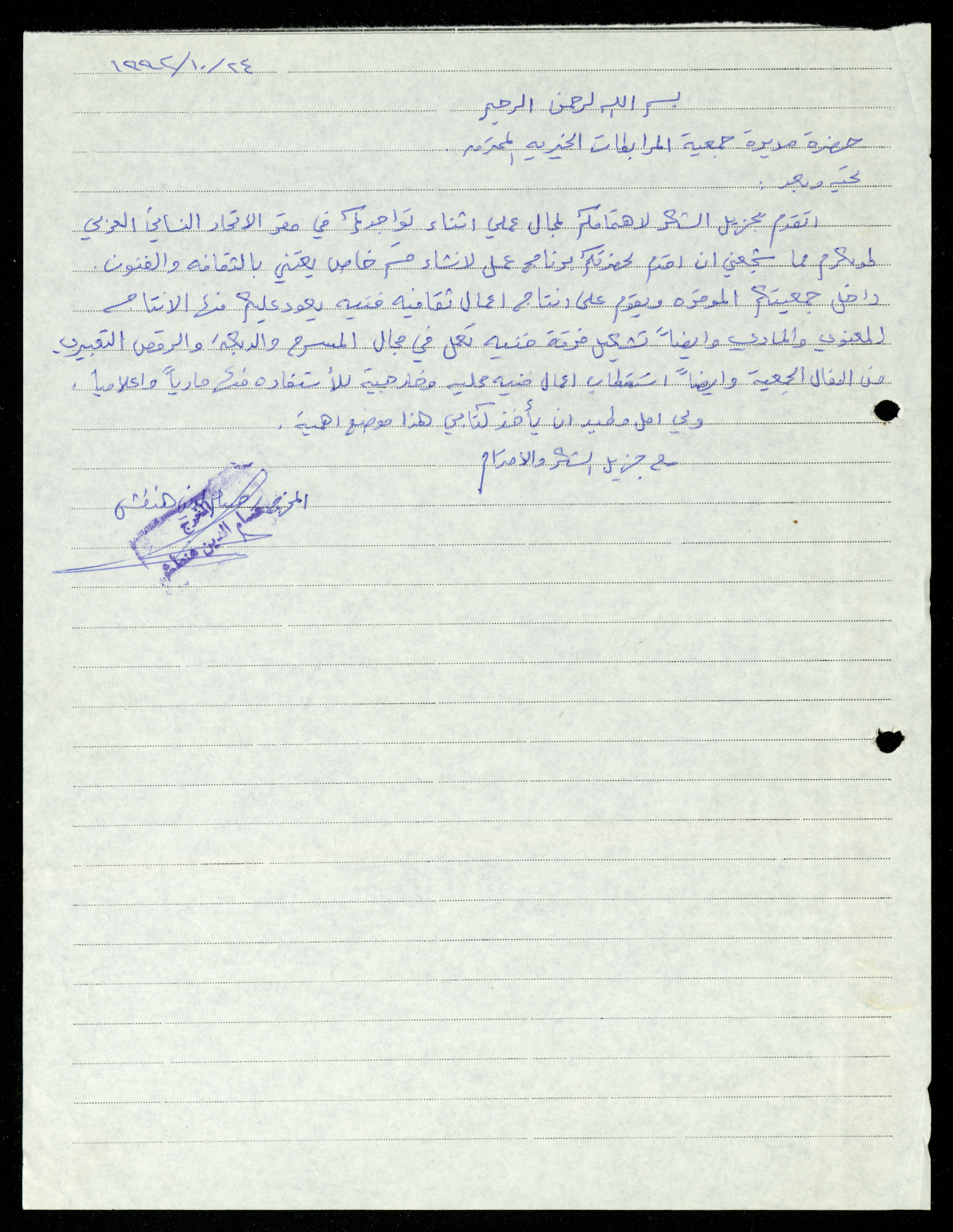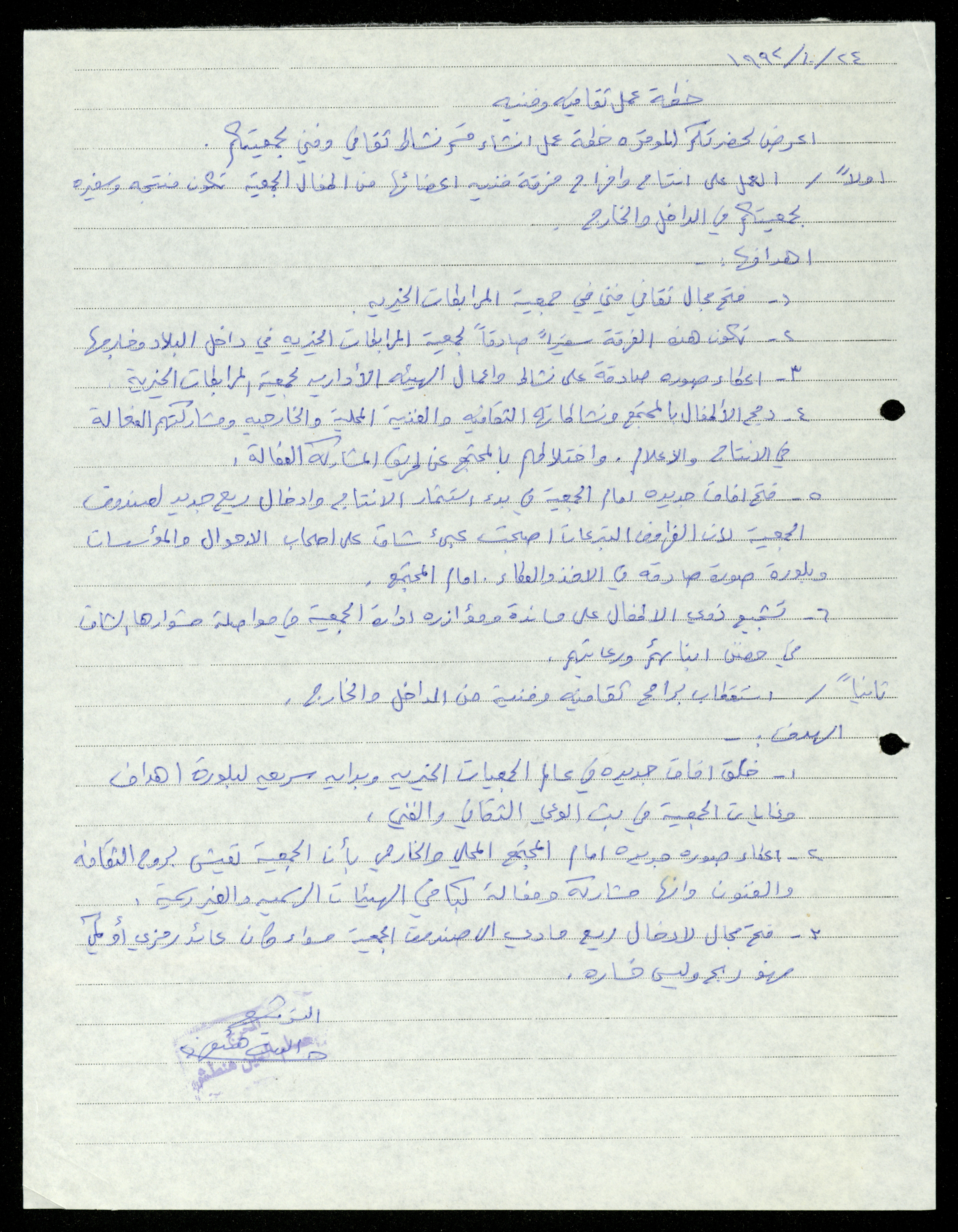 خطة عمل مكتوبة بخط اليد من المخرج حسام الدين هنطش في طولكرم إلى رئيسة جمعية المرابطات الخيرية في قلقيلية عام 1992، يقترح فيها إنشاء قسم خاص في جمعية المرابطات يُعنى بالثقافة والفنون ويعمل على إنتاجها، بالإضافة إلى اقتراحه تشكيل فرق فنية في مجال المسرح والدبكة والرقص التعبيري في الجمعية، مرفقًا نموذجًا لاتفاقية عمل بينهما.