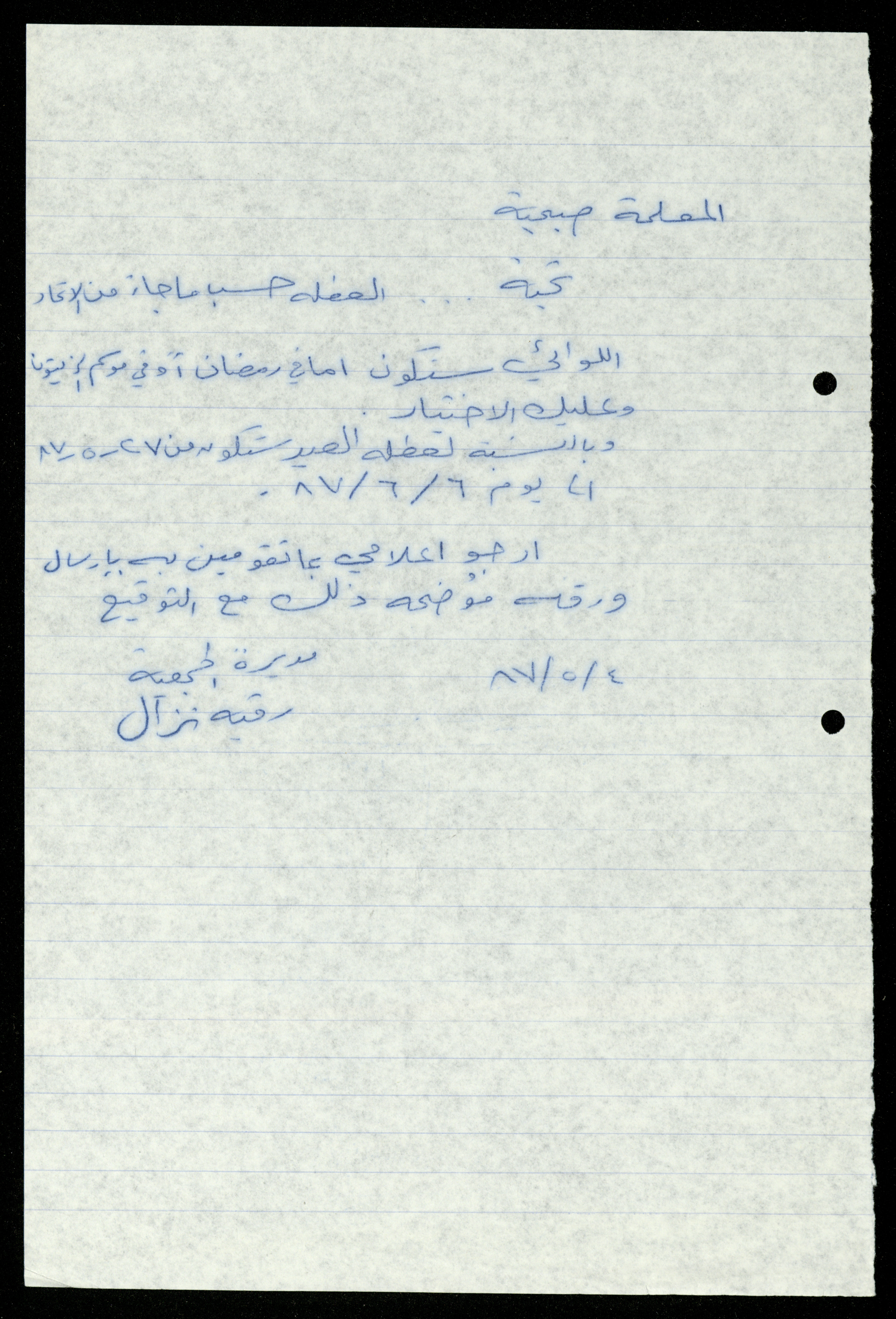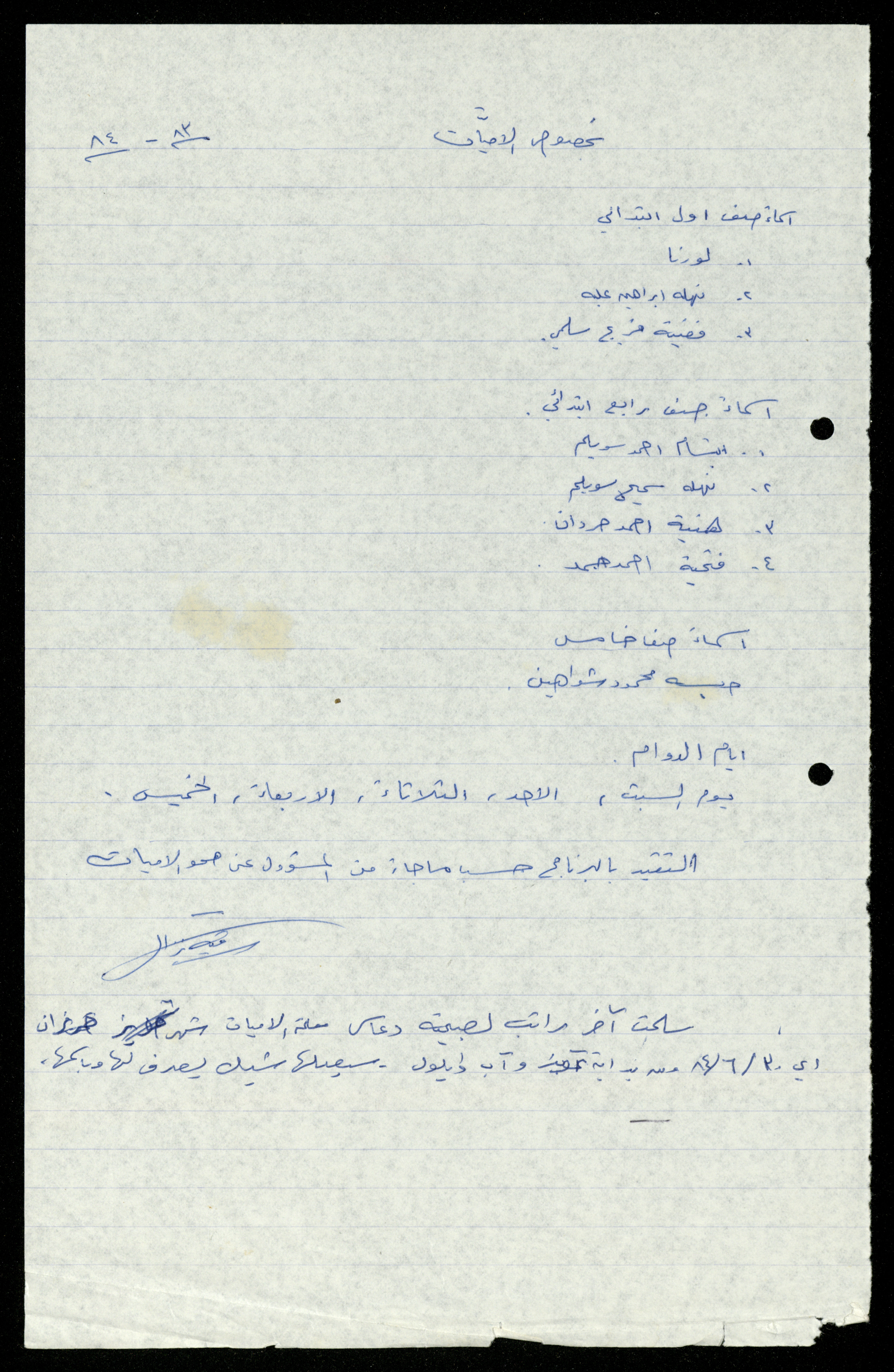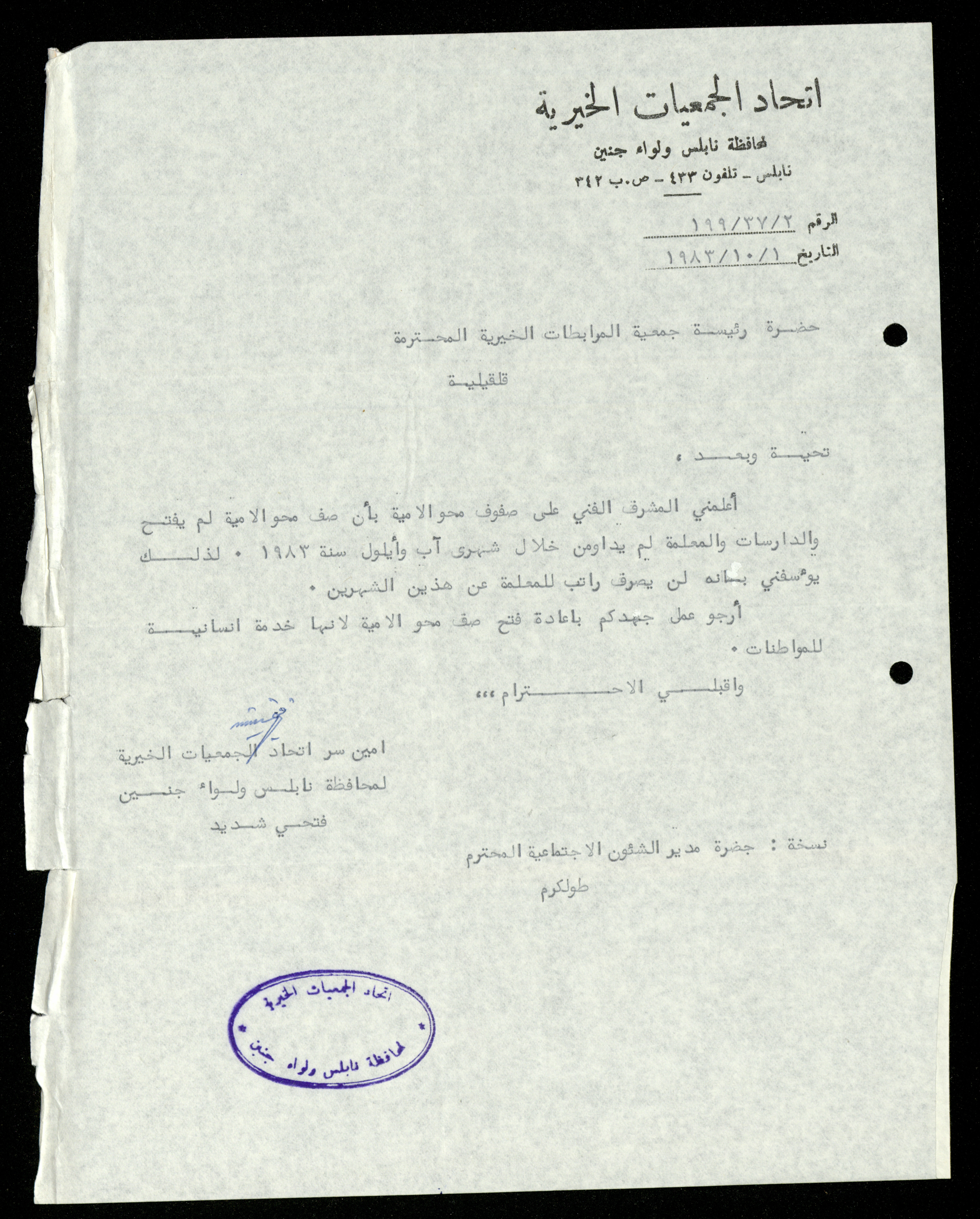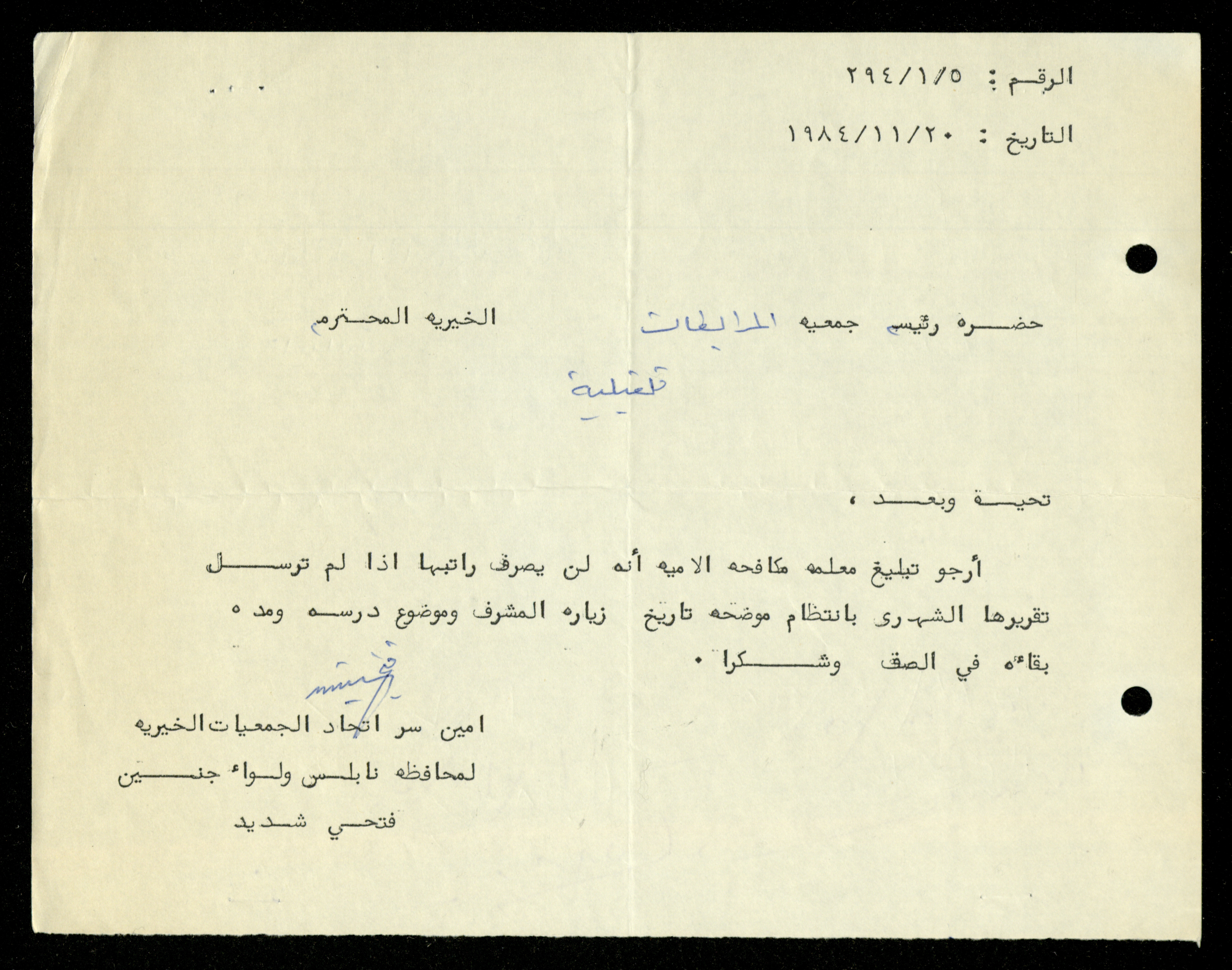 Printed and handwritten, this 26-page document shows a file on the Illiterate Division belonging to the al-Murabitat Charitable Society in Qaqilya that included the following: - Internal correspondence between teachers and the director of the Society, Ruqayya Nazzal, regarding holidays and vacations, and requests for stationery. - External correspondence from Fathi Shadeed, Secretary of the Union of Charitable Associations for Nablus Governorate and Jenin District at that time. - Reports on lesson preparation, attendance and absence, and receipt of notebooks and stationery. - Some of the teachers' names in the department along with their academic qualifications. - Some names of illiterate women, their classes, and their working days. - Payslips for teachers in the department. The documents and correspondence are from 1982 to 1987.