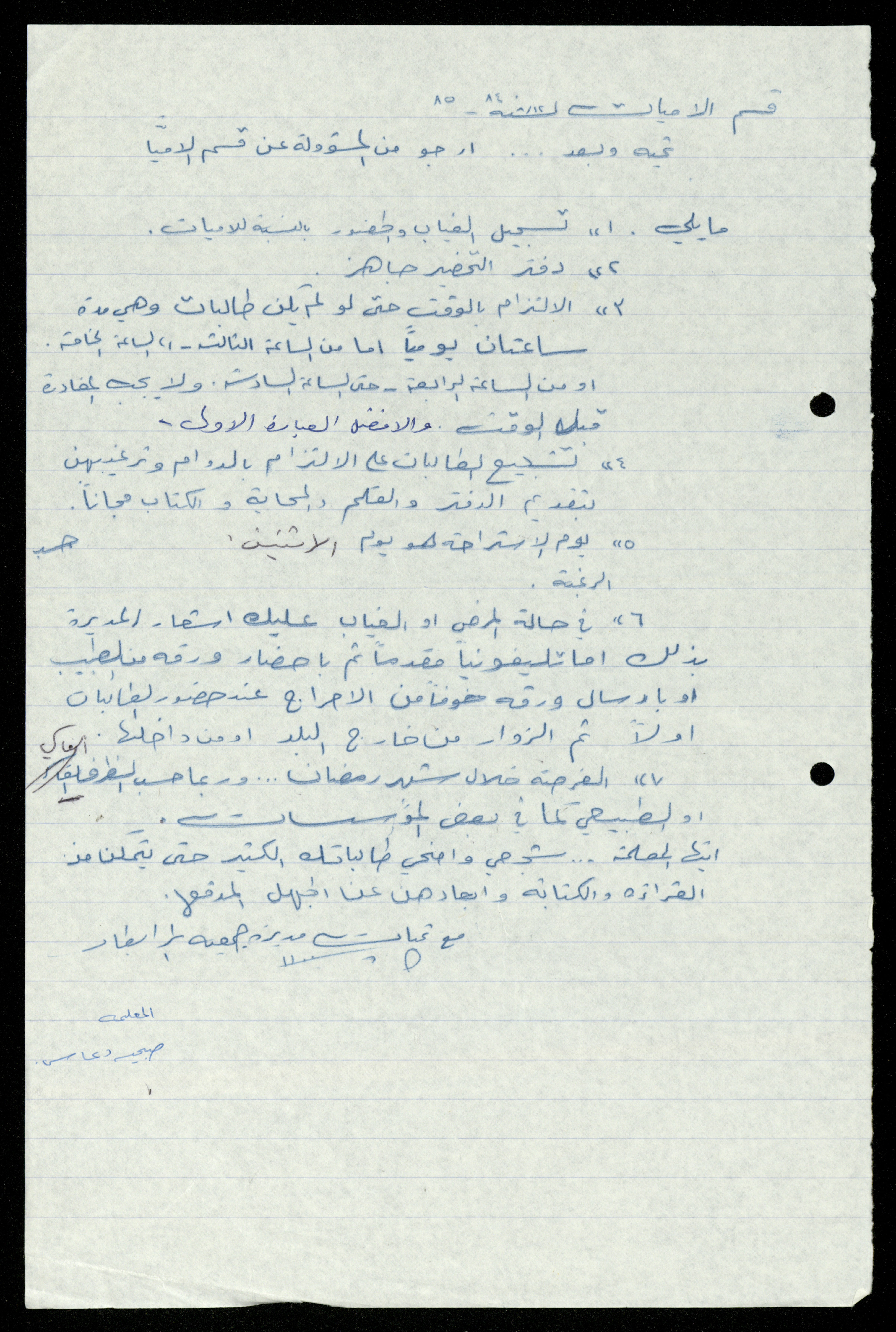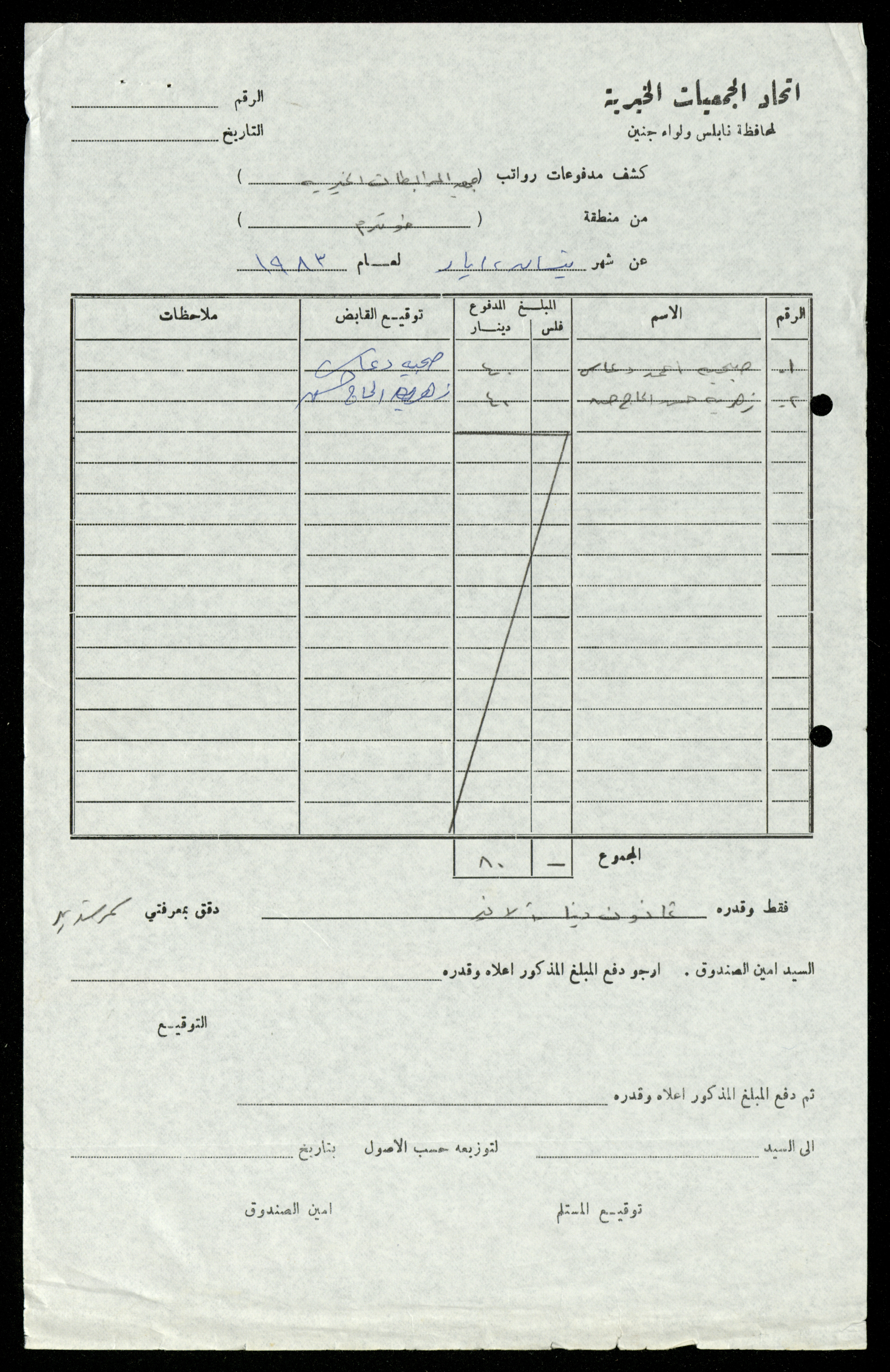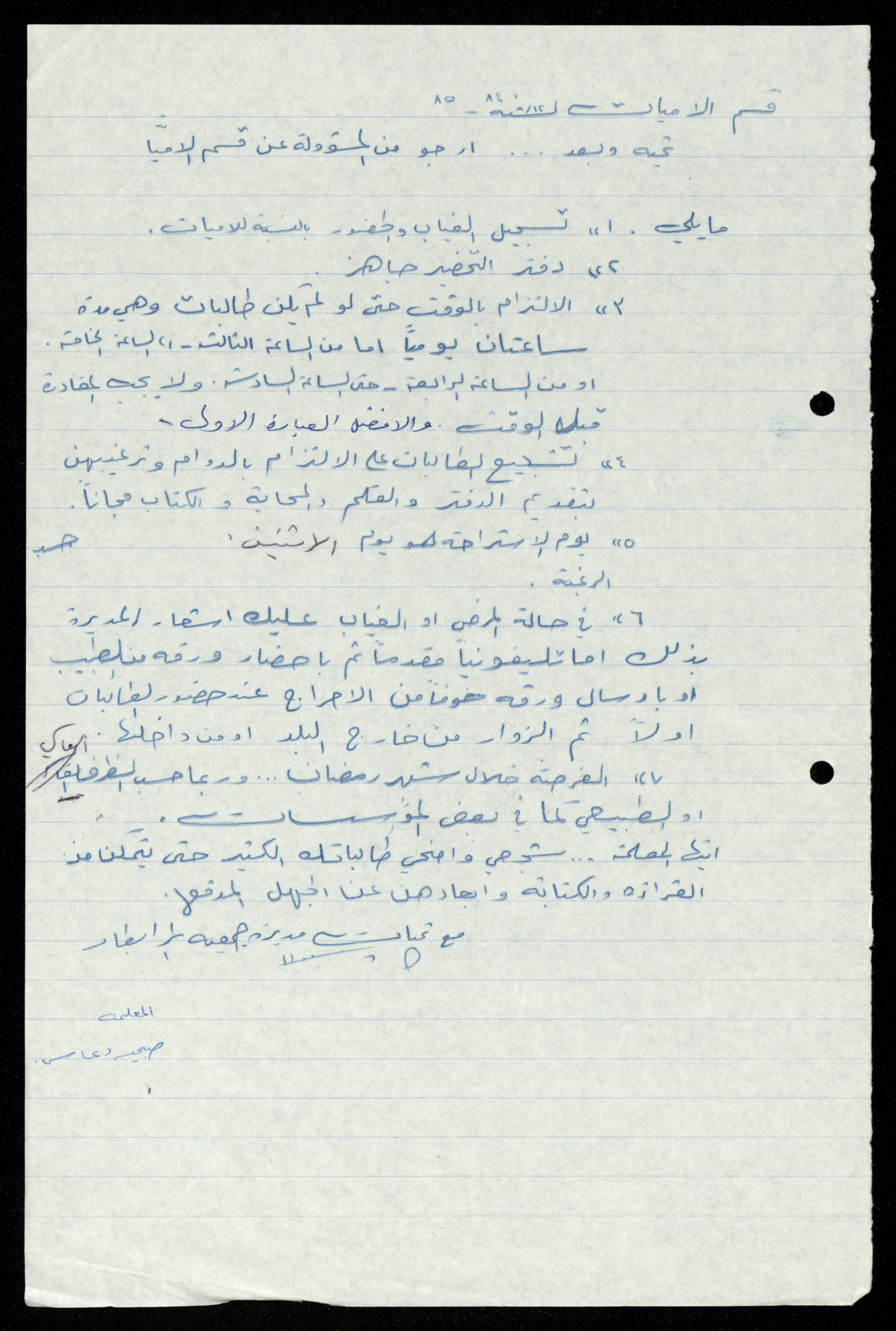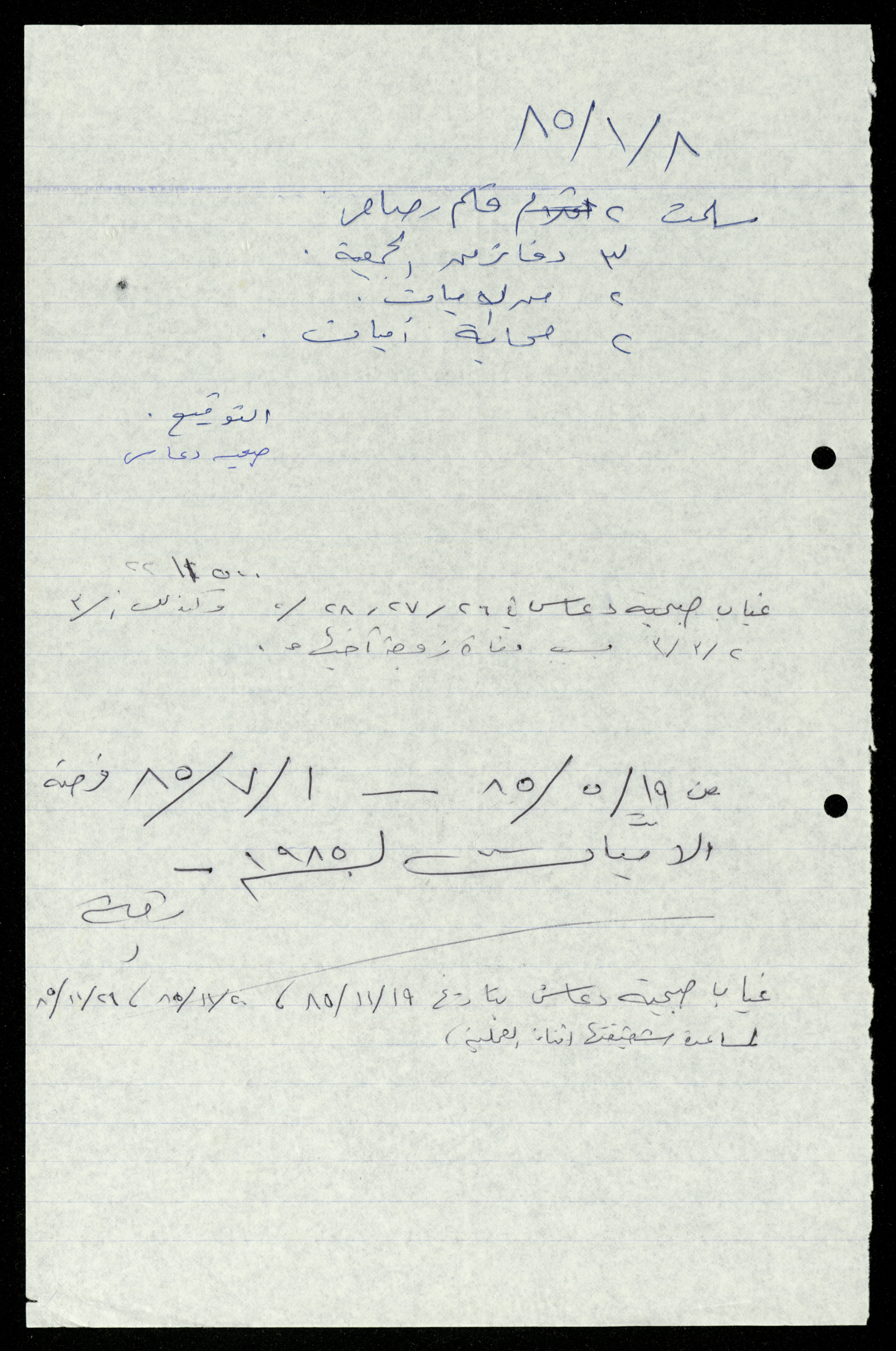 Printed and handwritten, this 26-page document shows a file on the Illiterate Division belonging to the al-Murabitat Charitable Society in Qaqilya that included the following: - Internal correspondence between teachers and the director of the Society, Ruqayya Nazzal, regarding holidays and vacations, and requests for stationery. - External correspondence from Fathi Shadeed, Secretary of the Union of Charitable Associations for Nablus Governorate and Jenin District at that time. - Reports on lesson preparation, attendance and absence, and receipt of notebooks and stationery. - Some of the teachers' names in the department along with their academic qualifications. - Some names of illiterate women, their classes, and their working days. - Payslips for teachers in the department. The documents and correspondence are from 1982 to 1987.