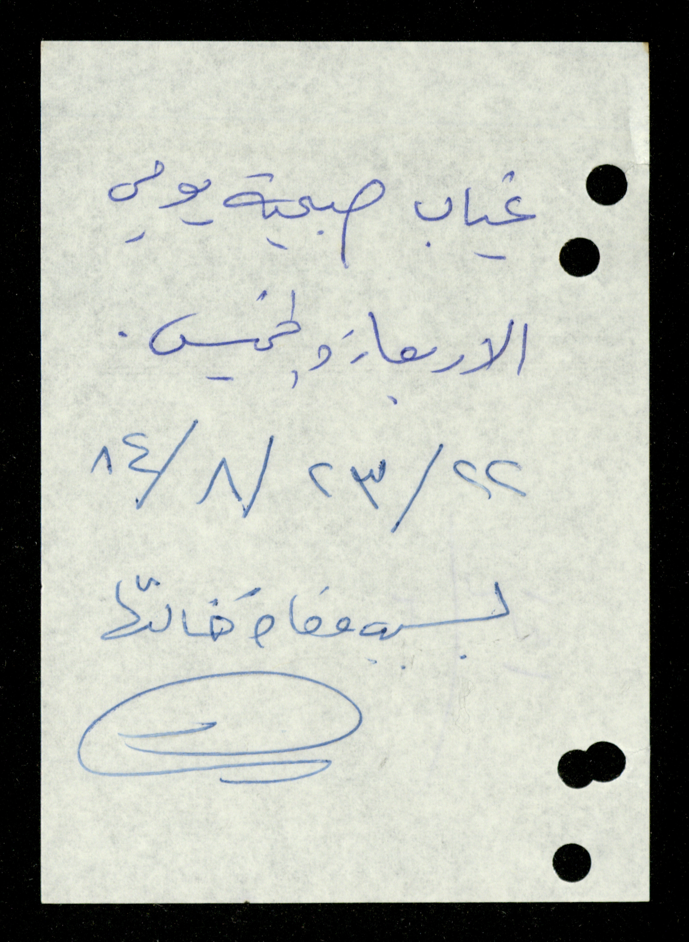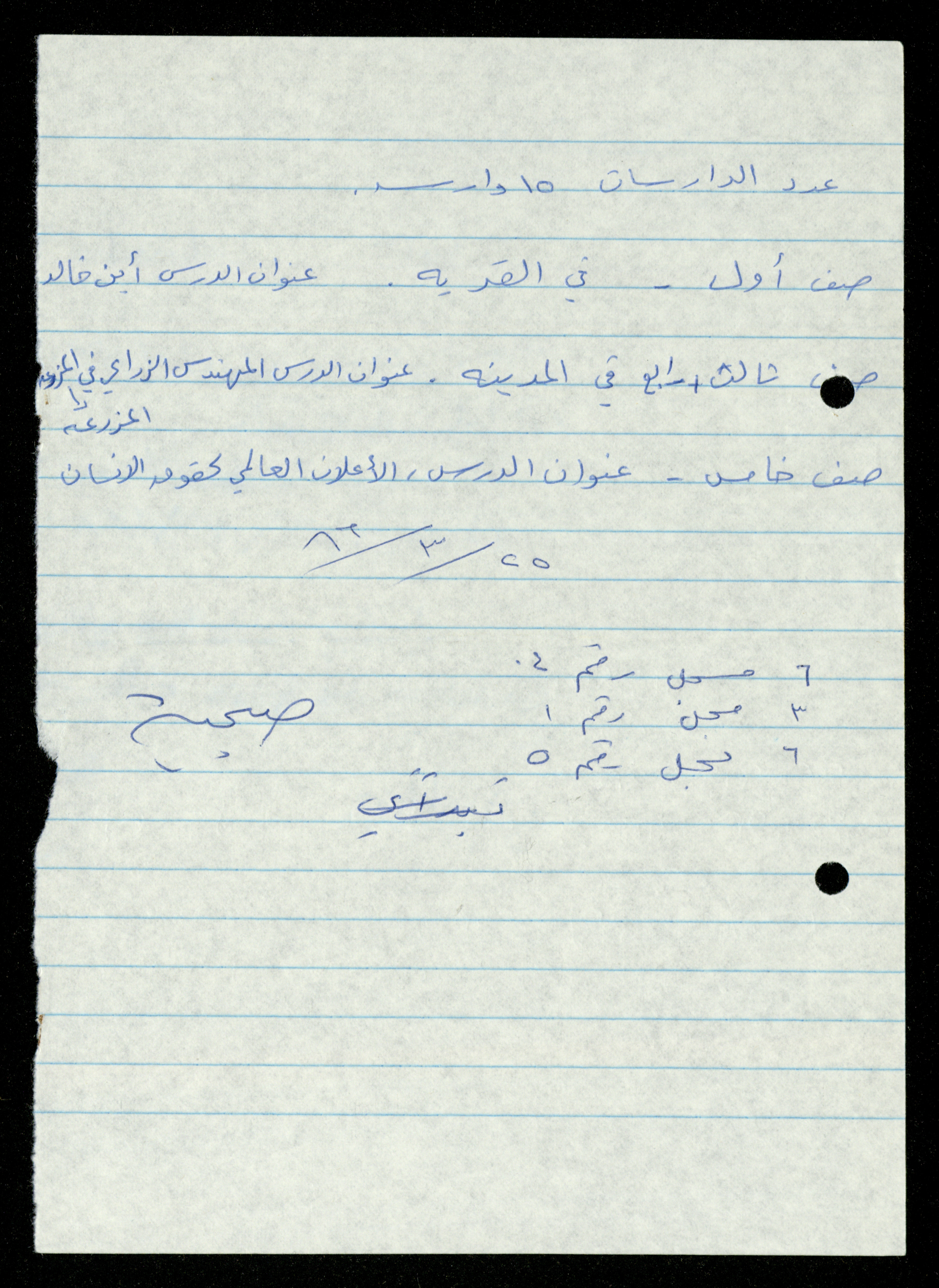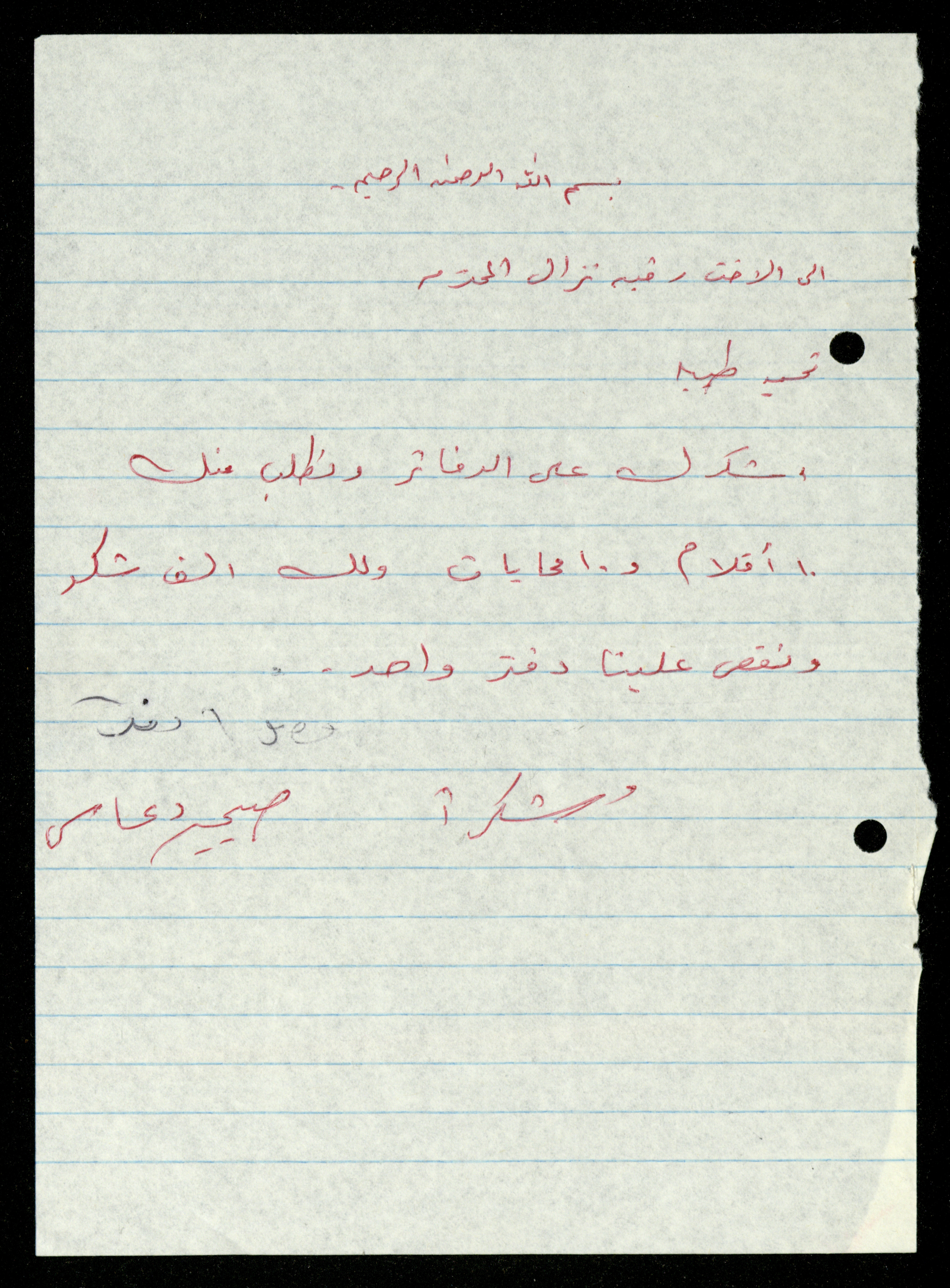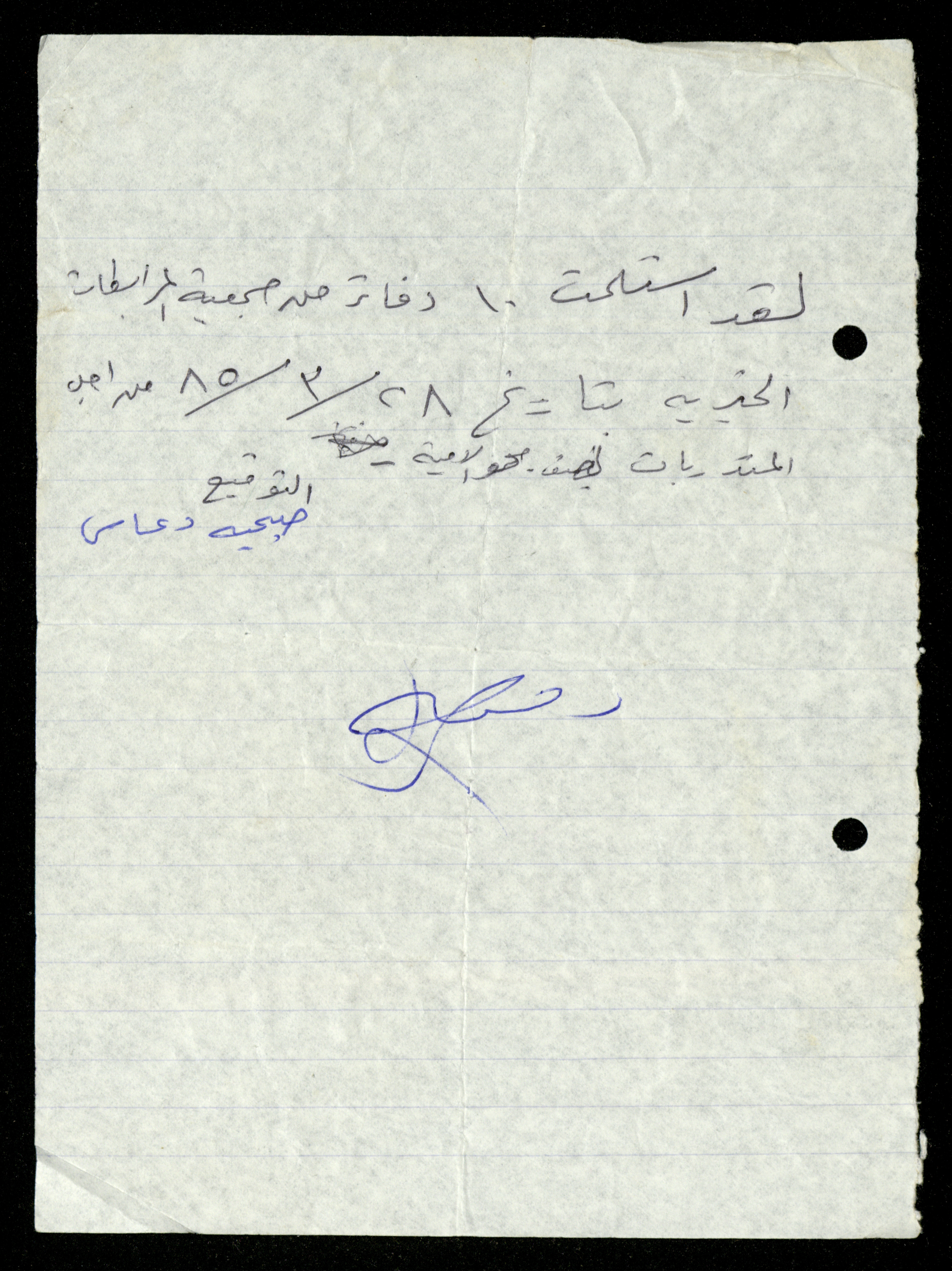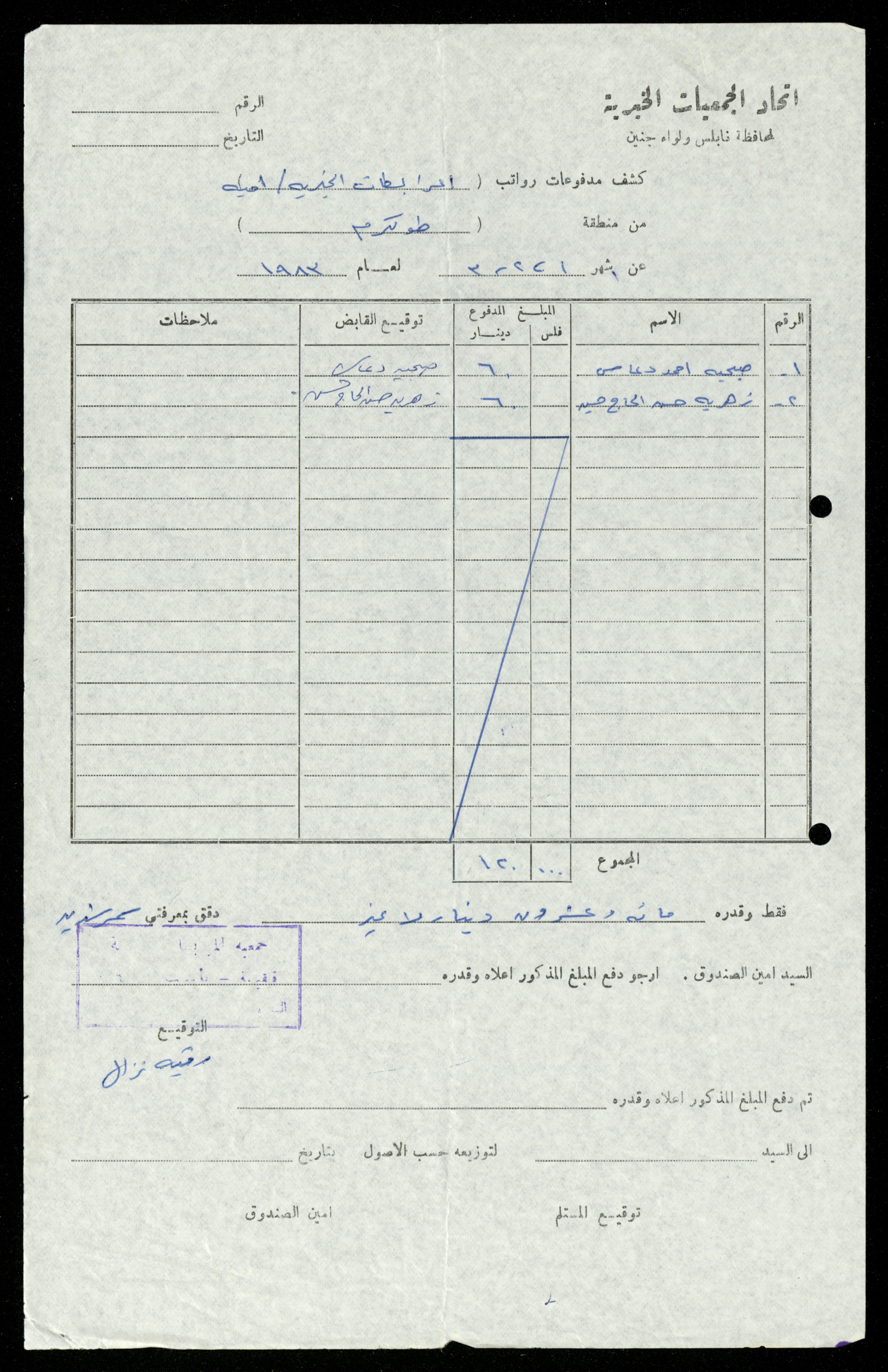 Printed and handwritten, this 26-page document shows a file on the Illiterate Division belonging to the al-Murabitat Charitable Society in Qaqilya that included the following: - Internal correspondence between teachers and the director of the Society, Ruqayya Nazzal, regarding holidays and vacations, and requests for stationery. - External correspondence from Fathi Shadeed, Secretary of the Union of Charitable Associations for Nablus Governorate and Jenin District at that time. - Reports on lesson preparation, attendance and absence, and receipt of notebooks and stationery. - Some of the teachers' names in the department along with their academic qualifications. - Some names of illiterate women, their classes, and their working days. - Payslips for teachers in the department. The documents and correspondence are from 1982 to 1987.