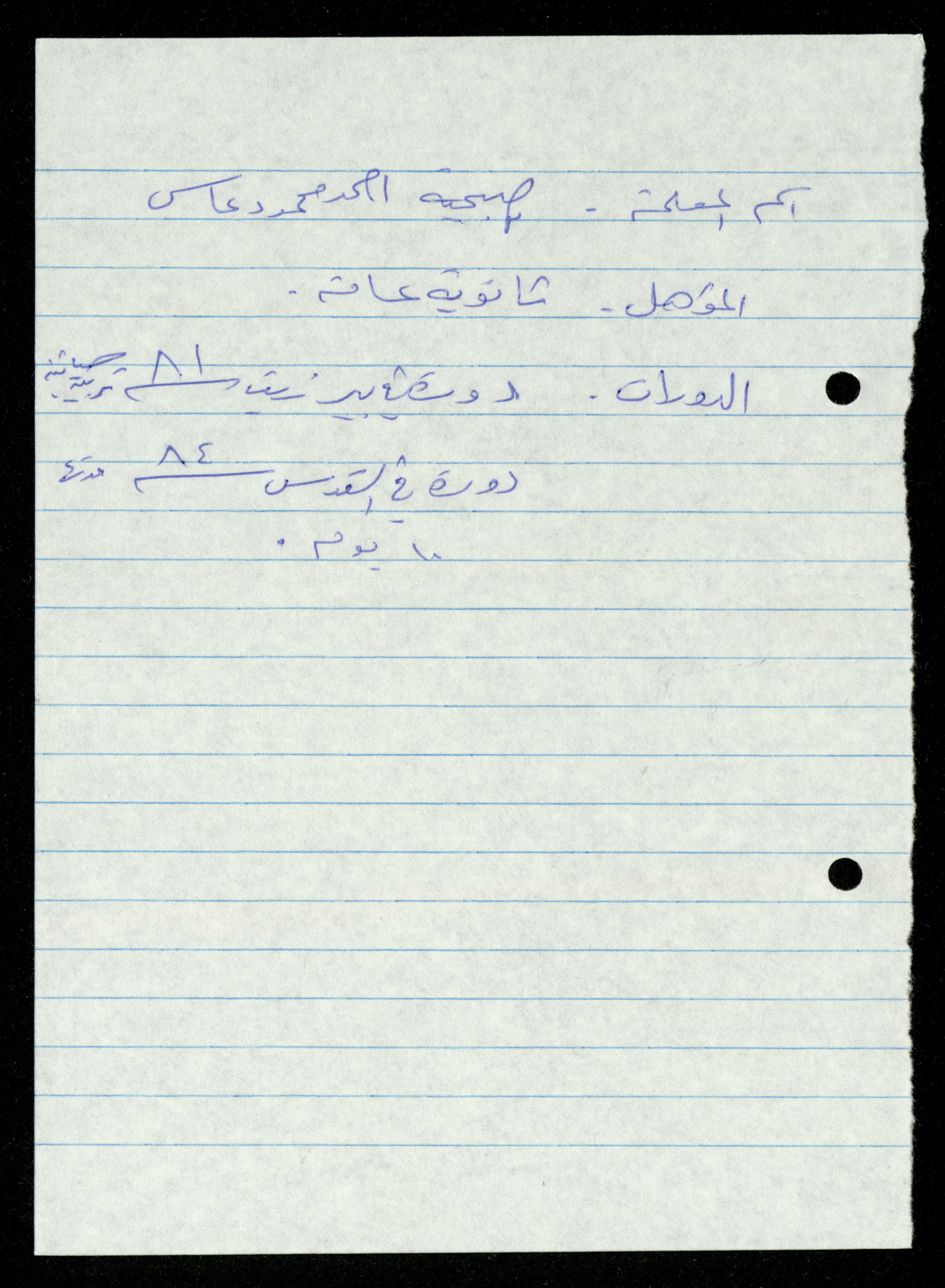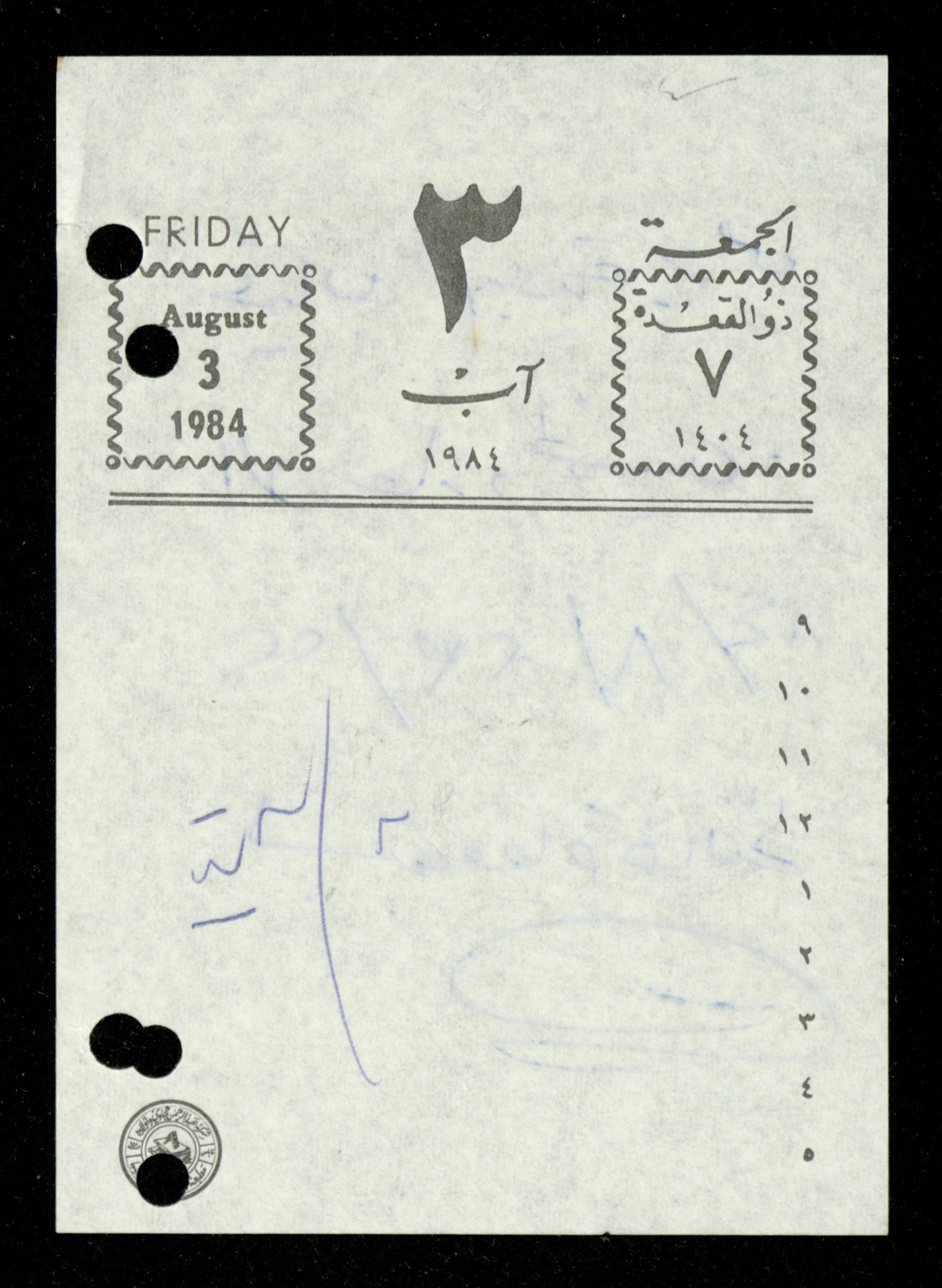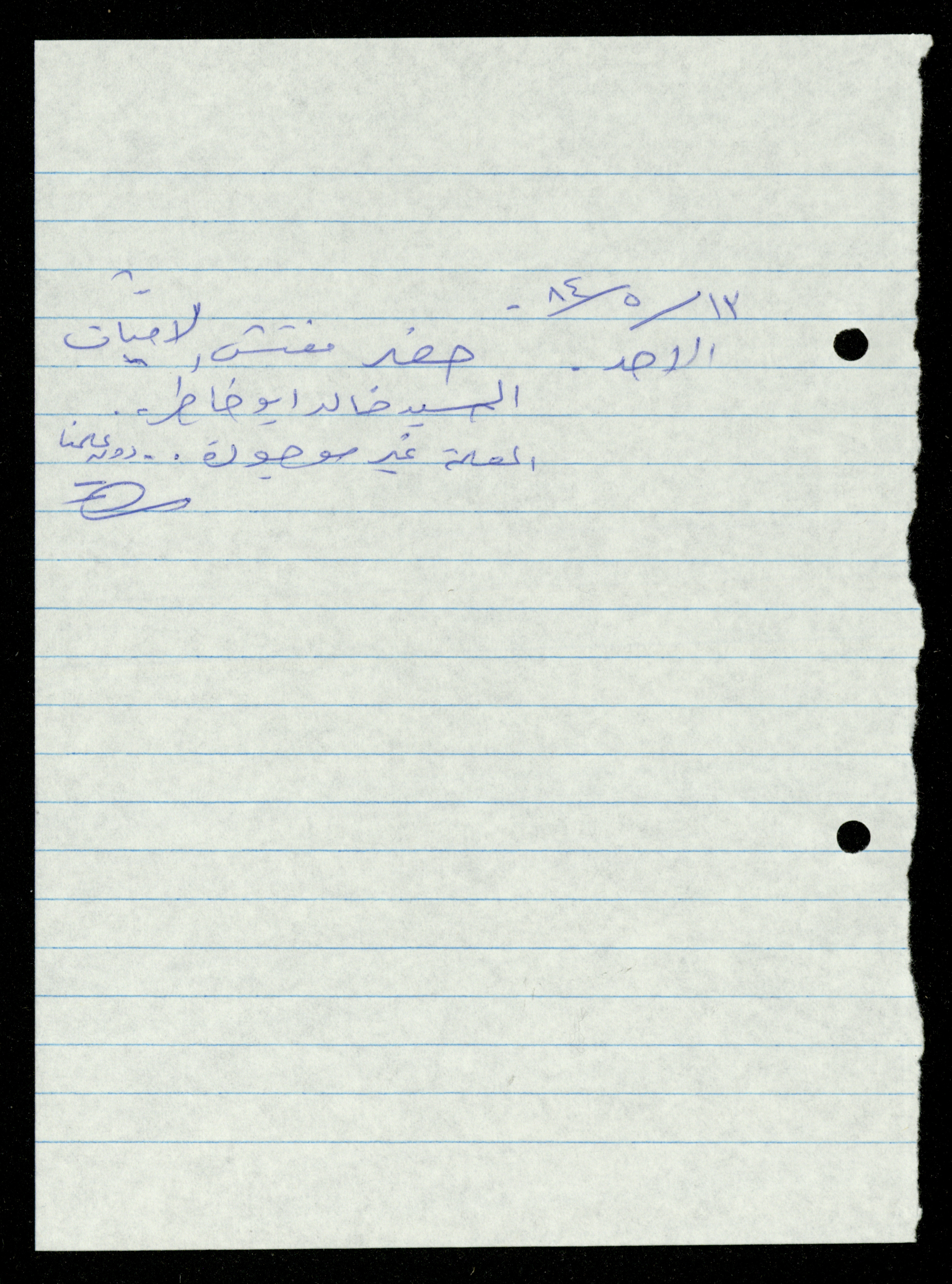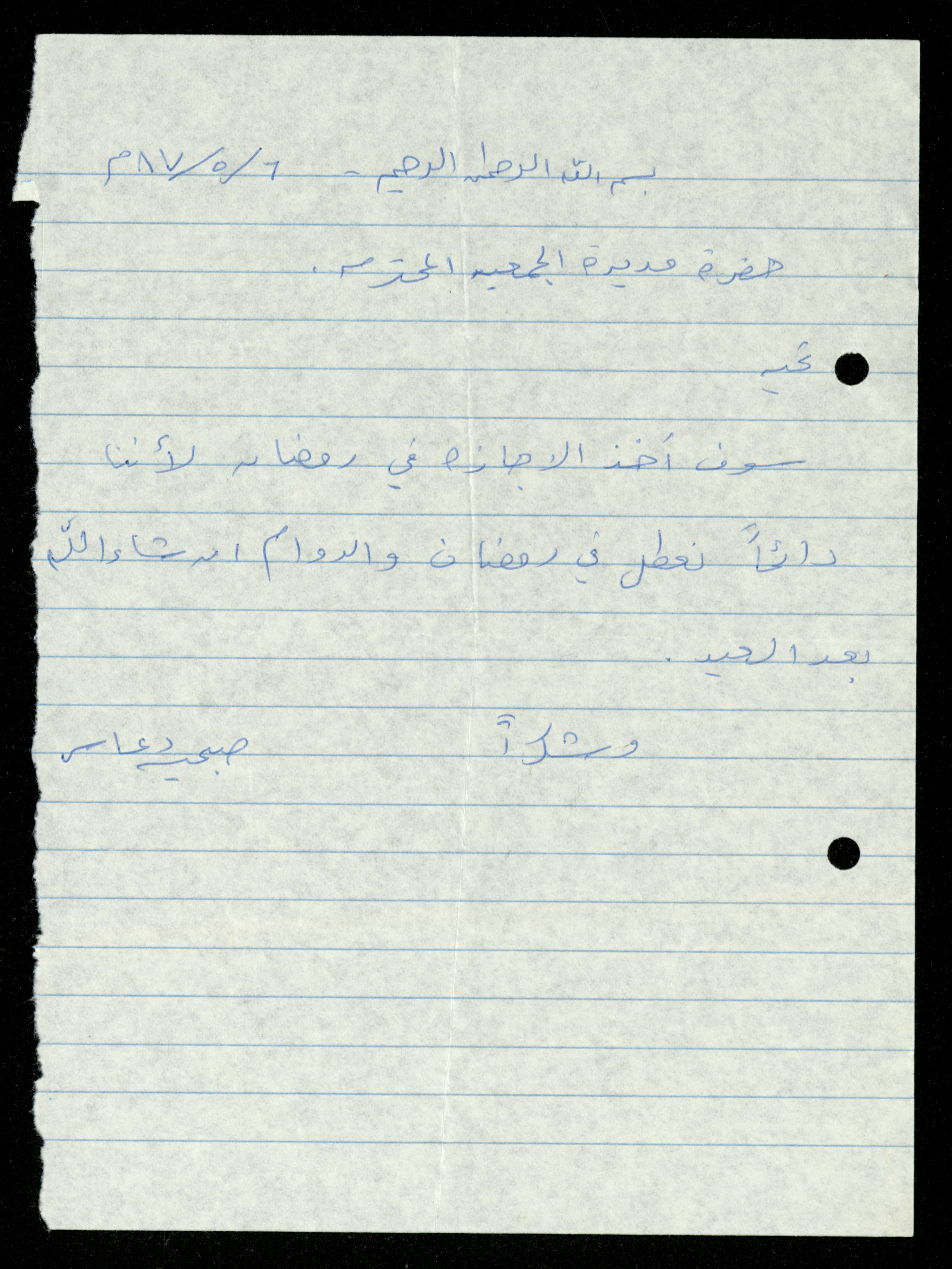 Printed and handwritten, this 26-page document shows a file on the Illiterate Division belonging to the al-Murabitat Charitable Society in Qaqilya that included the following: - Internal correspondence between teachers and the director of the Society, Ruqayya Nazzal, regarding holidays and vacations, and requests for stationery. - External correspondence from Fathi Shadeed, Secretary of the Union of Charitable Associations for Nablus Governorate and Jenin District at that time. - Reports on lesson preparation, attendance and absence, and receipt of notebooks and stationery. - Some of the teachers' names in the department along with their academic qualifications. - Some names of illiterate women, their classes, and their working days. - Payslips for teachers in the department. The documents and correspondence are from 1982 to 1987.