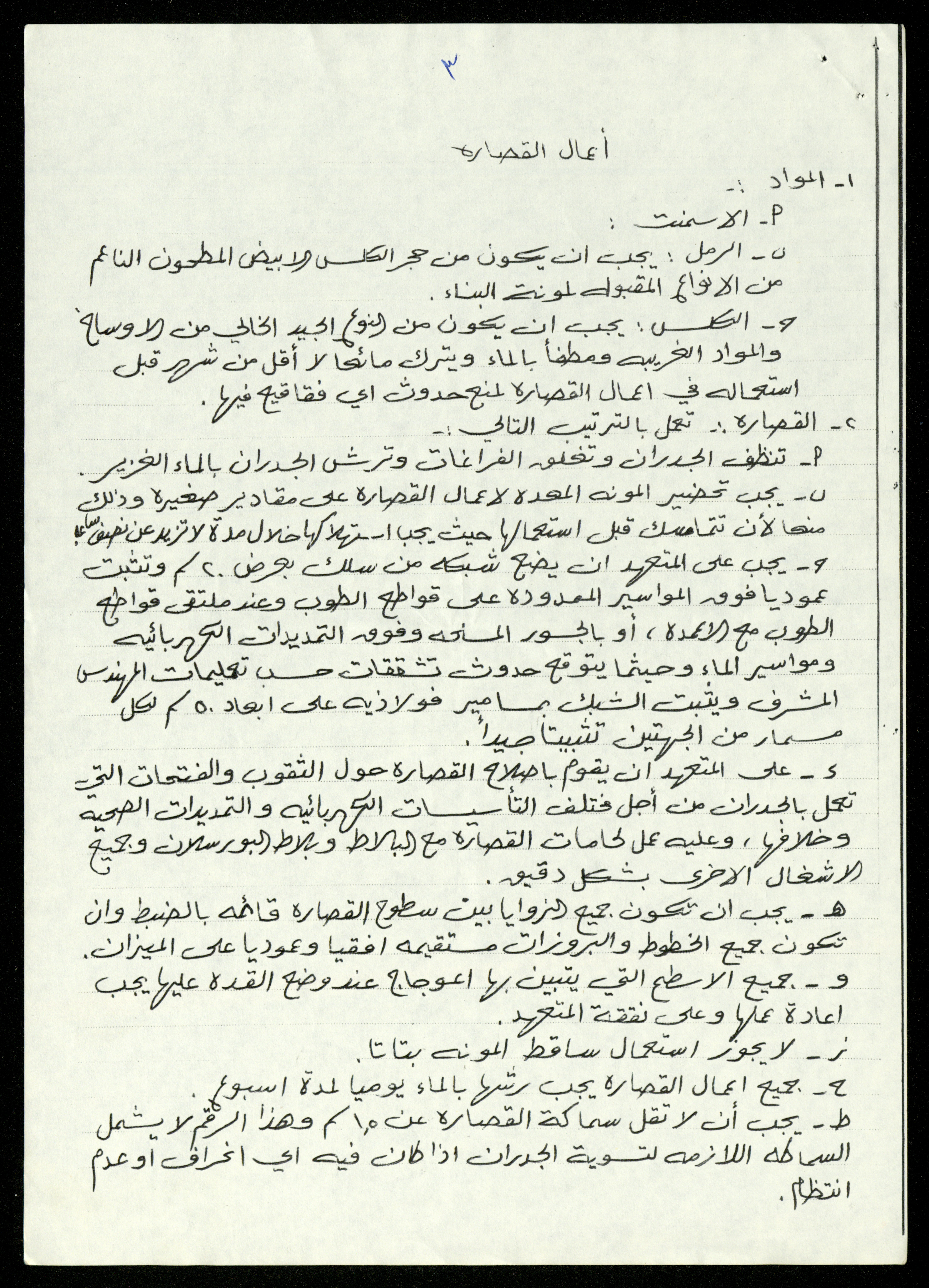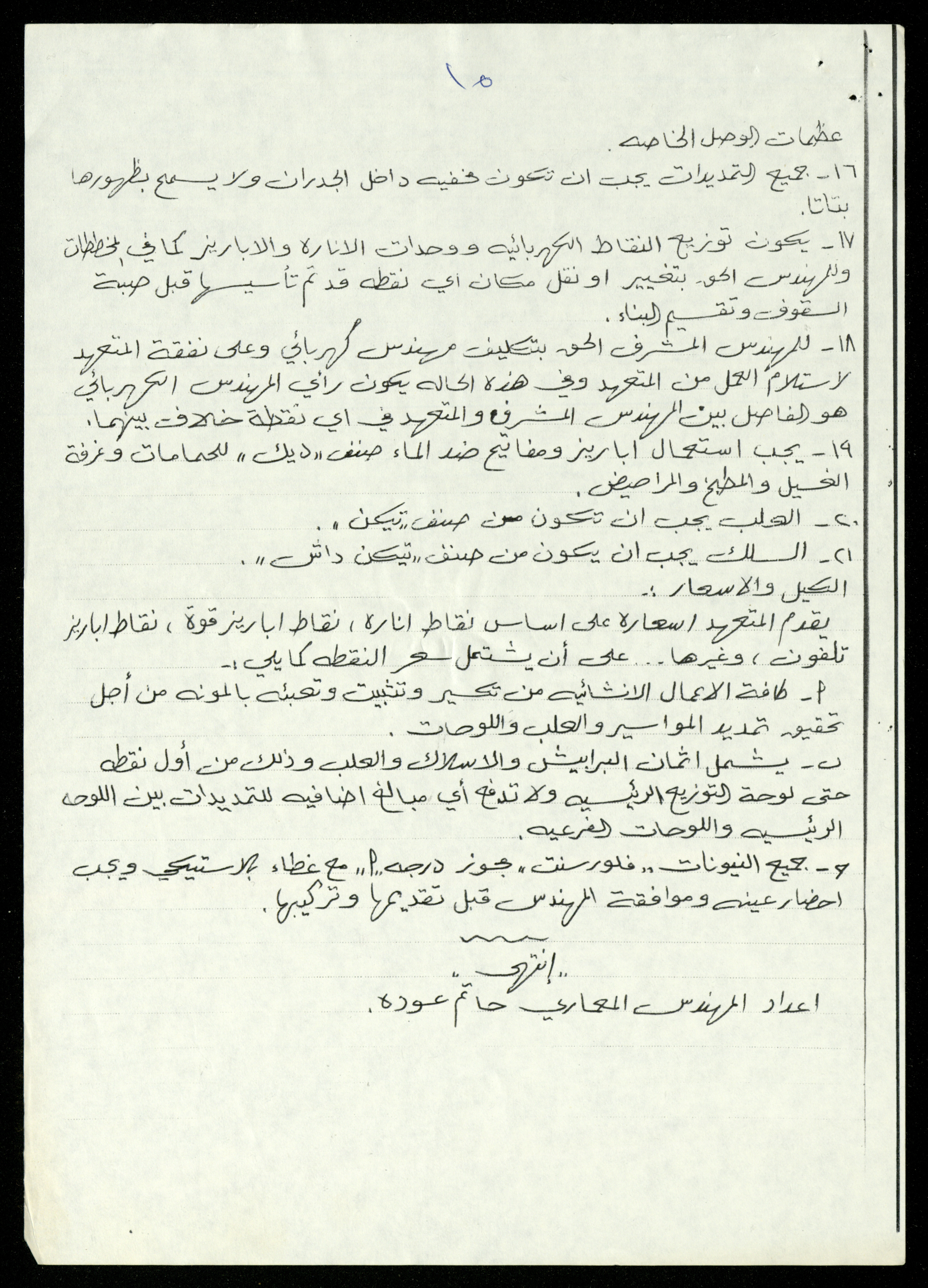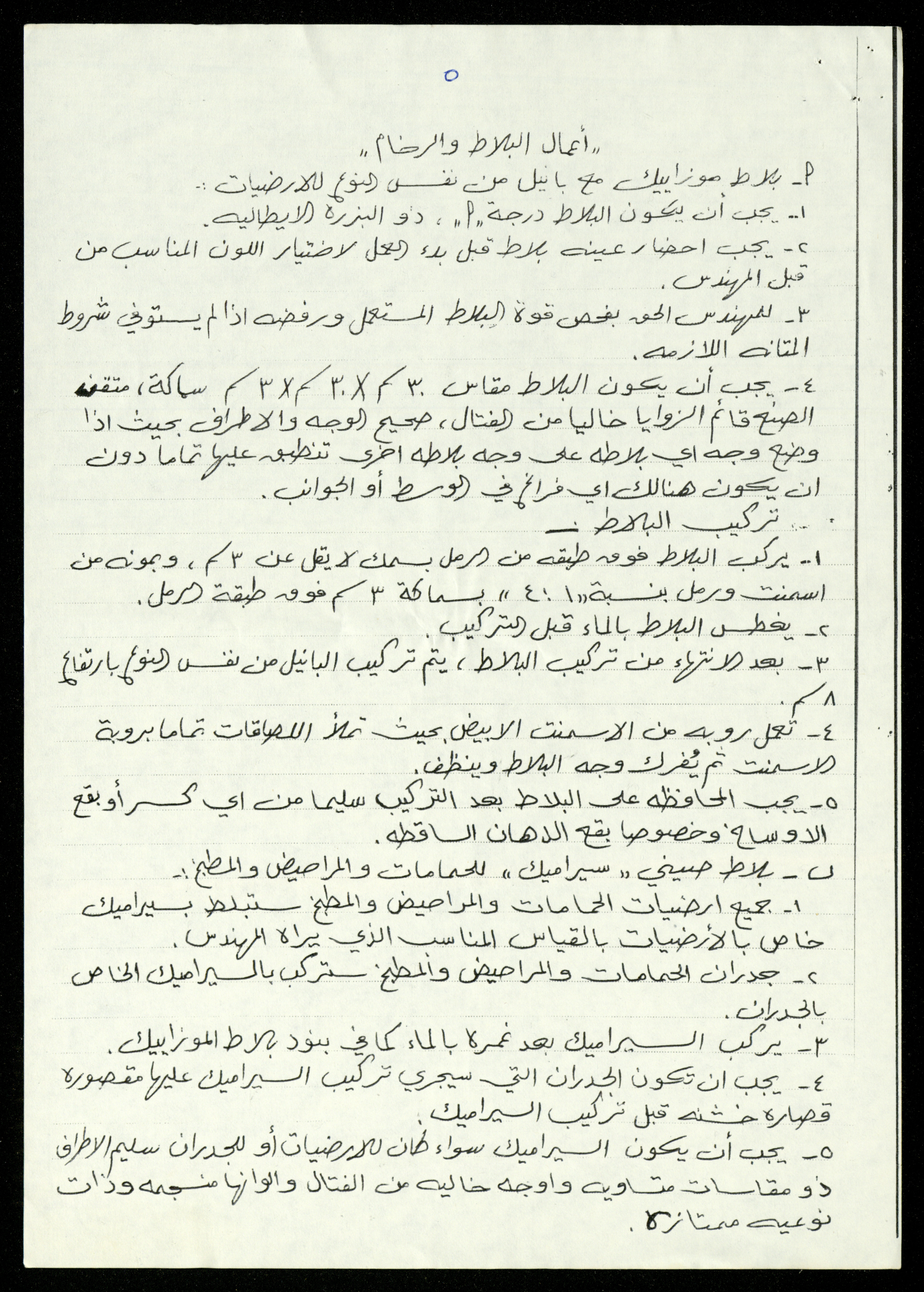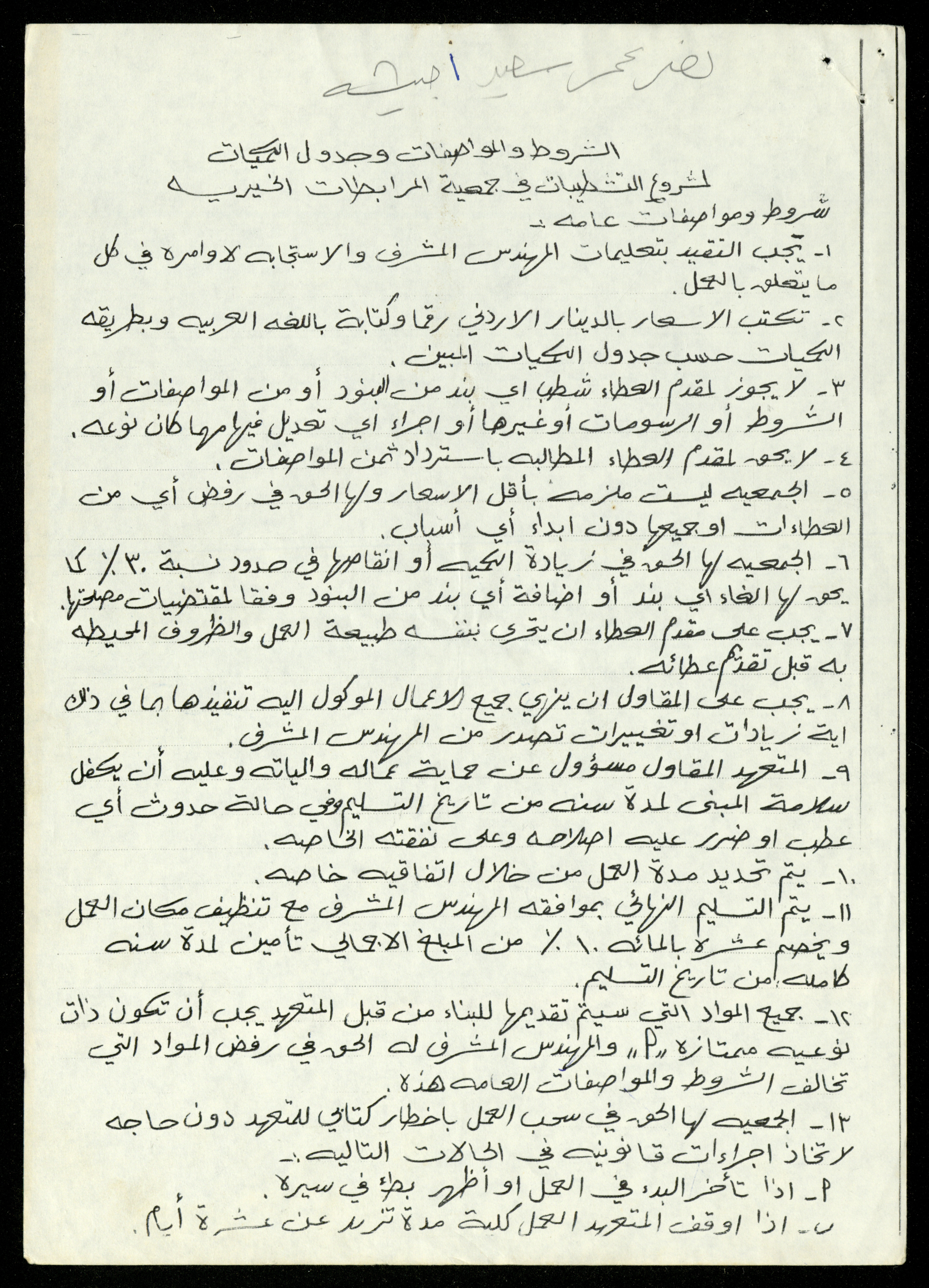 Handwritten by Engineer Hatem Odeh, this 15-page document shows the conditions, specifications, and quantities schedule for the finishing project of al-Murabitat Charitable Society.