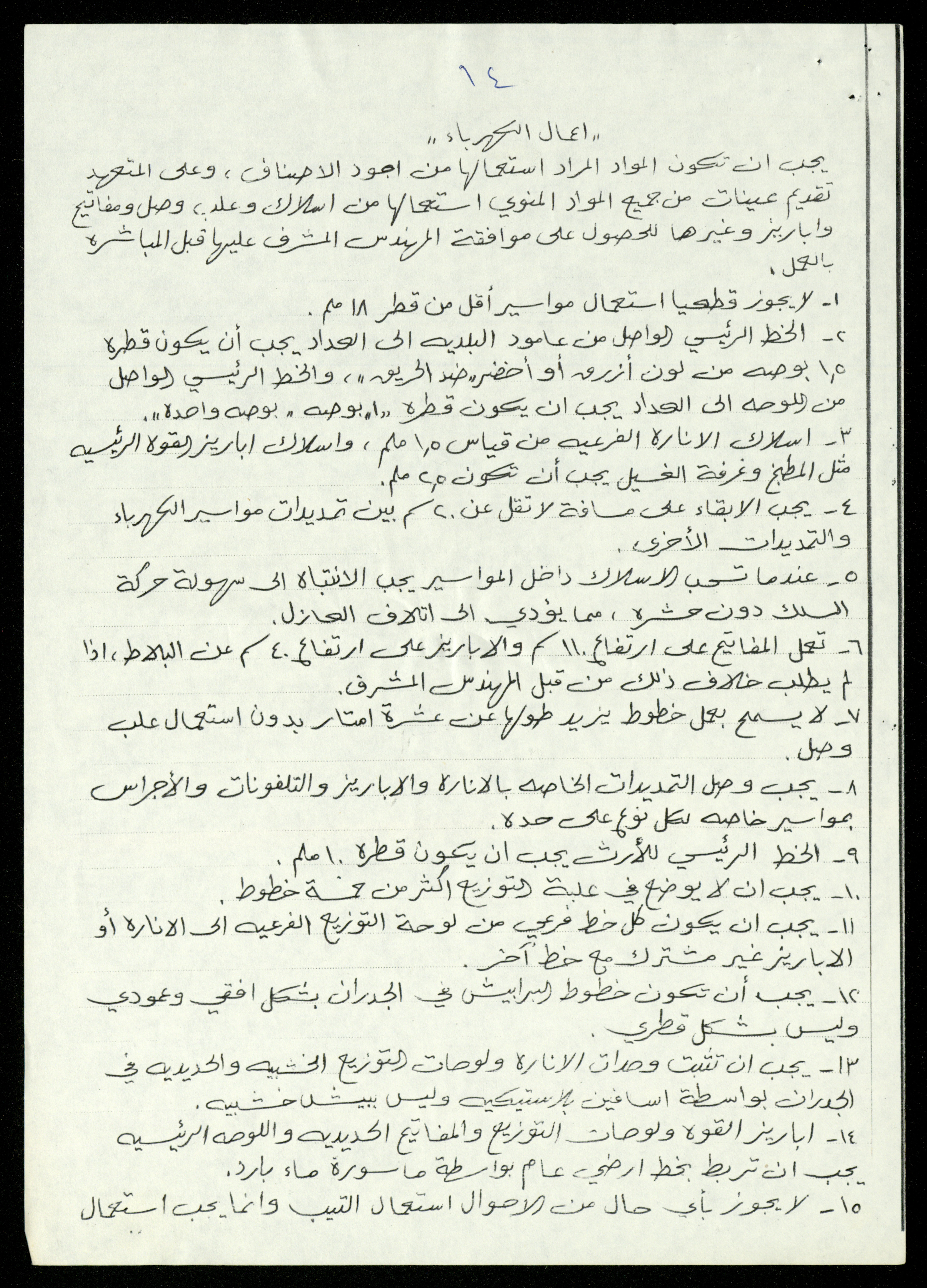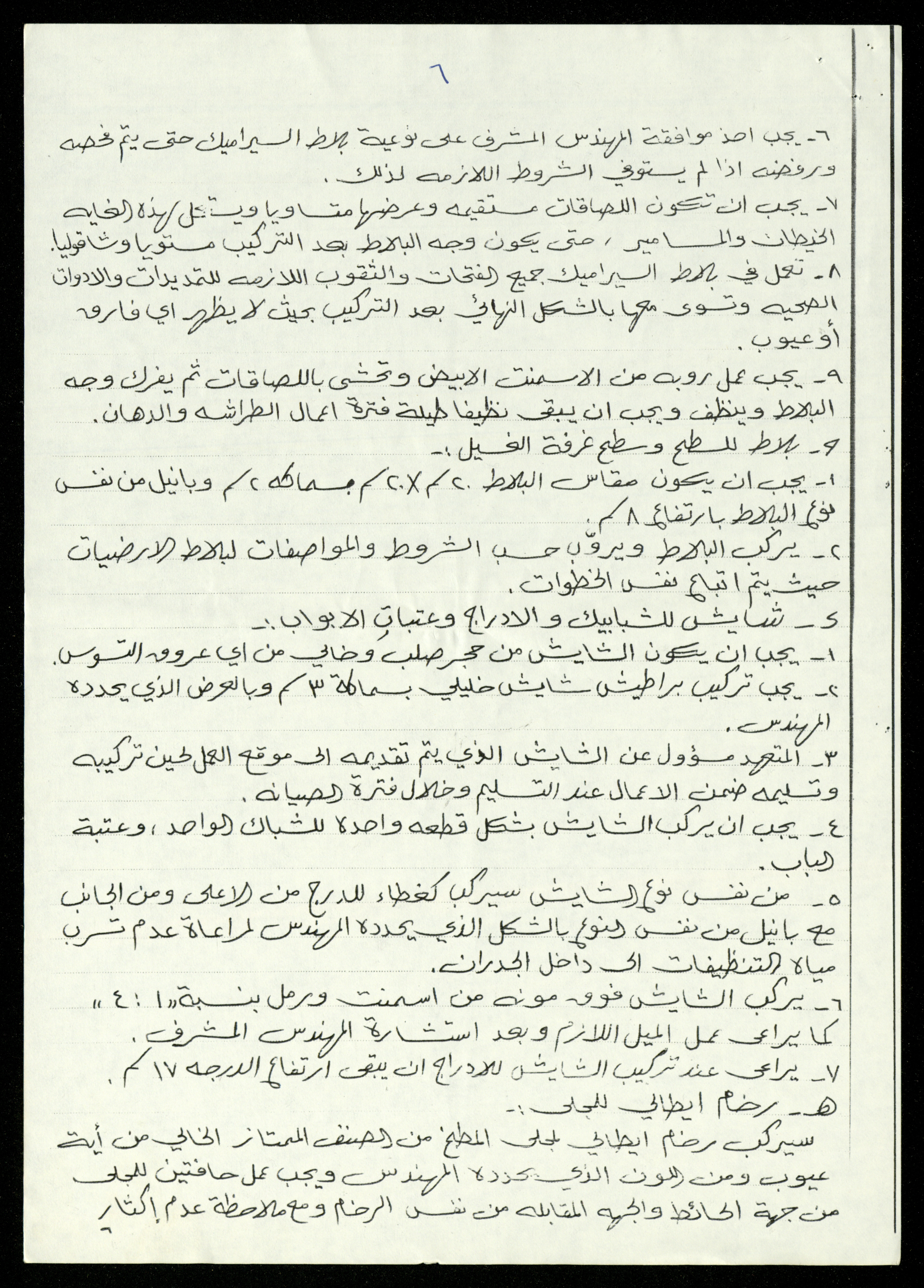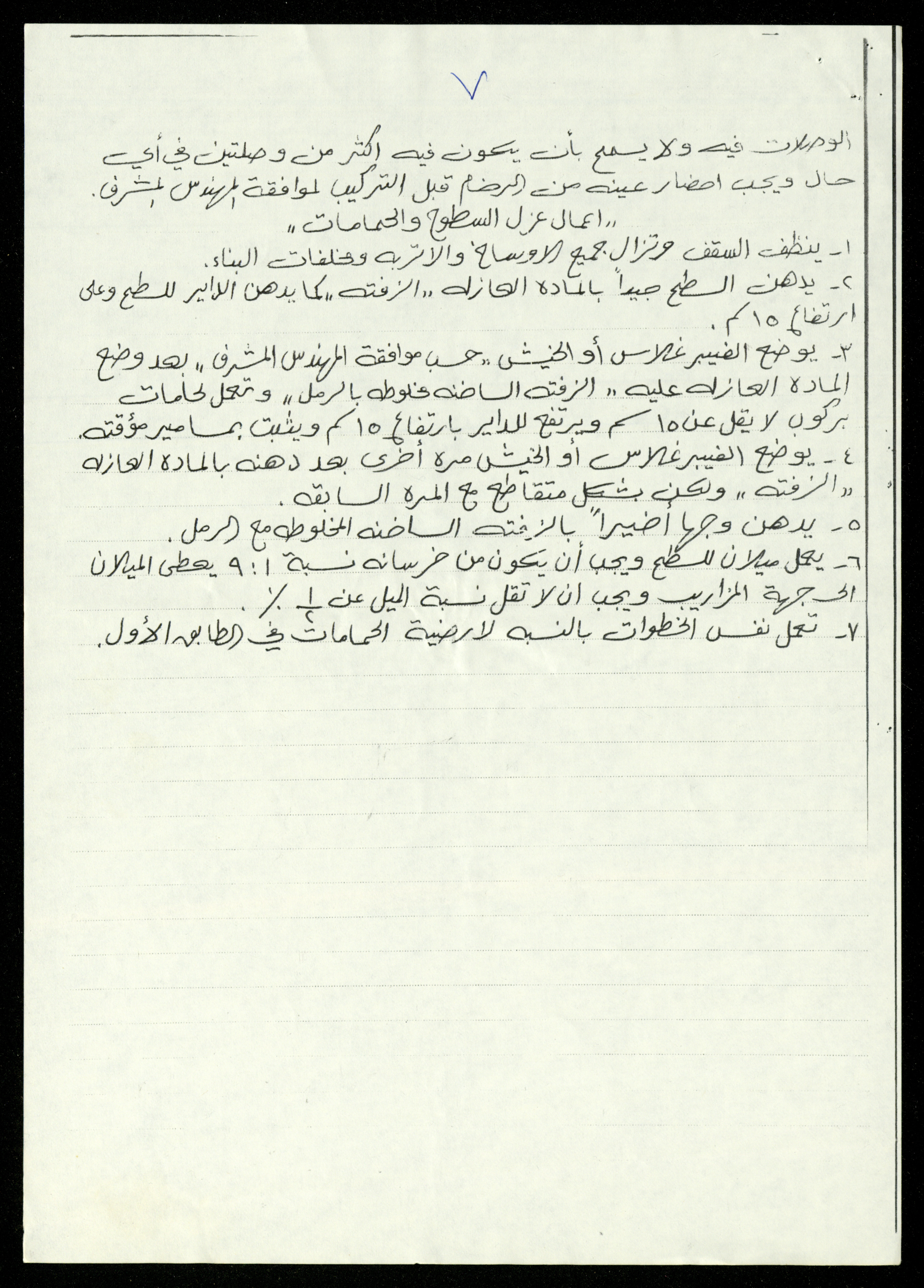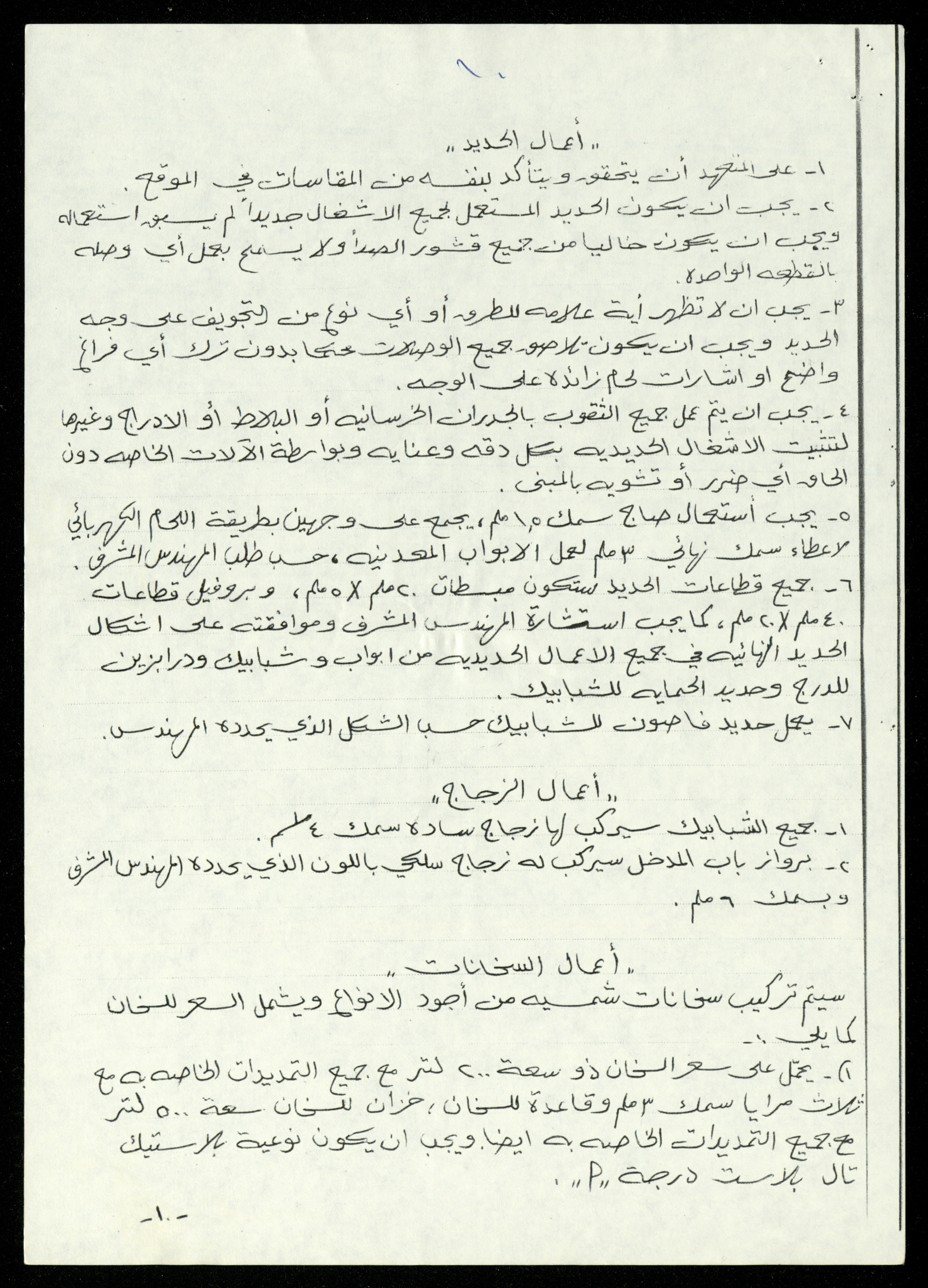 Handwritten by Engineer Hatem Odeh, this 15-page document shows the conditions, specifications, and quantities schedule for the finishing project of al-Murabitat Charitable Society.
