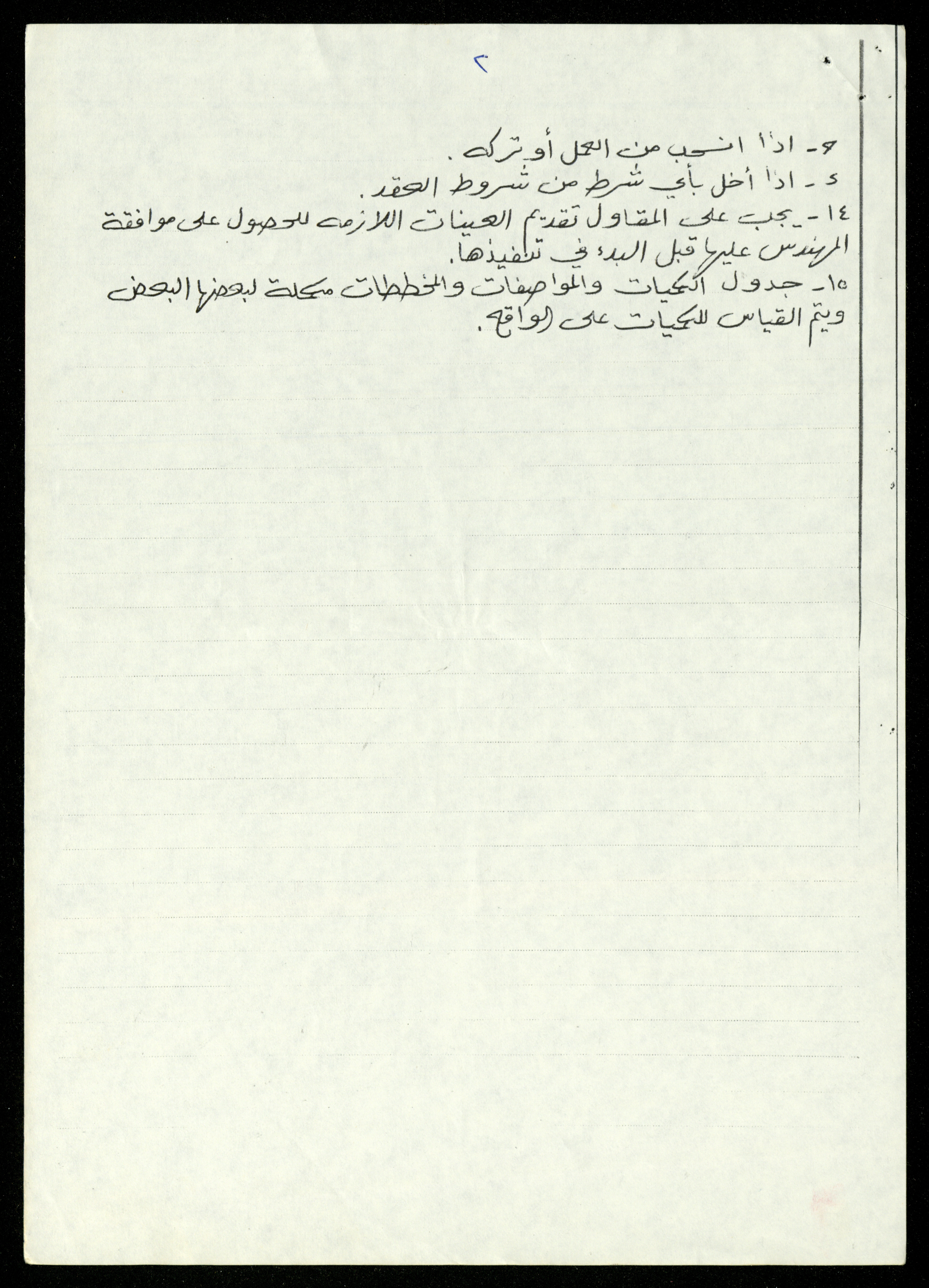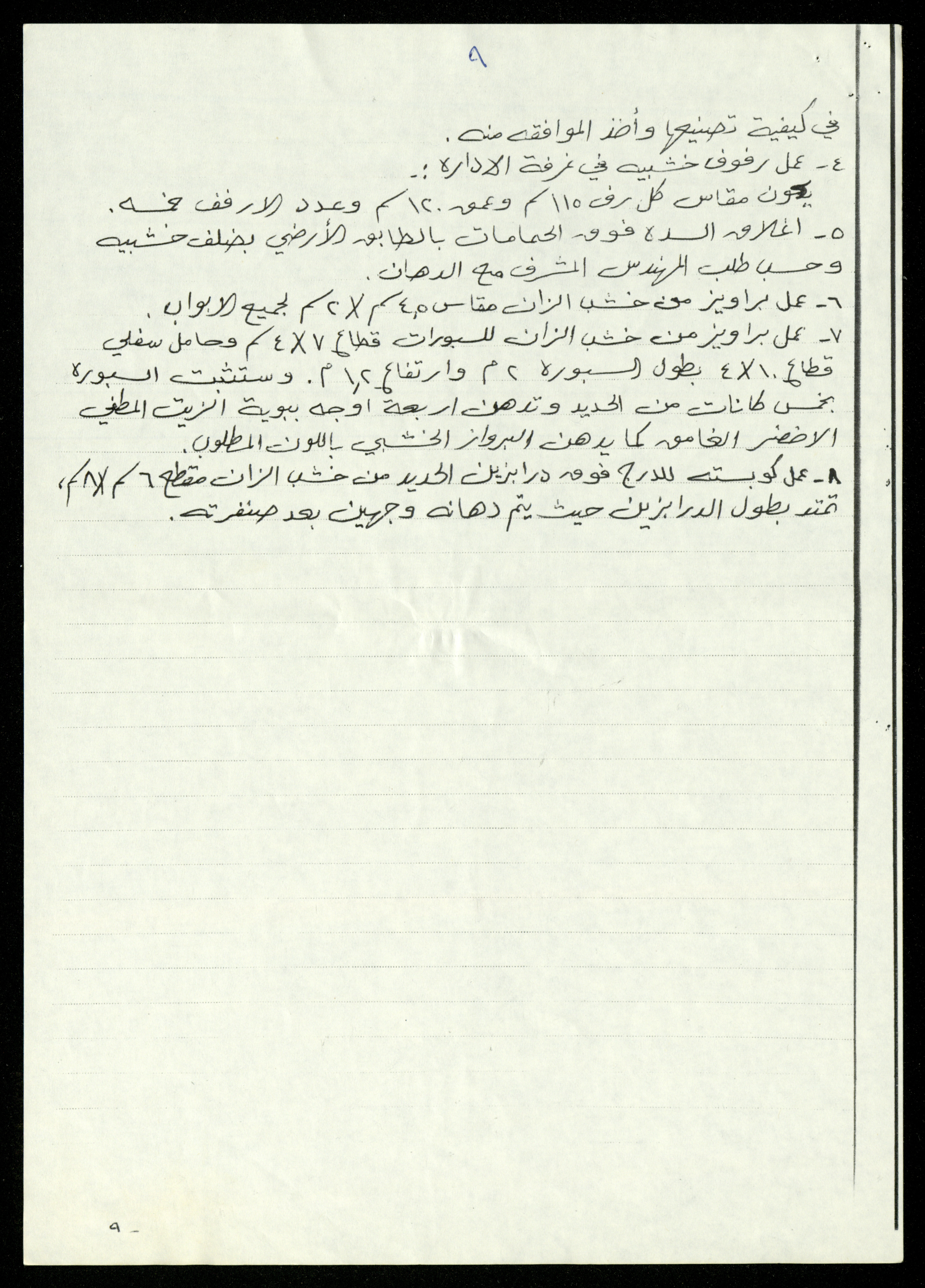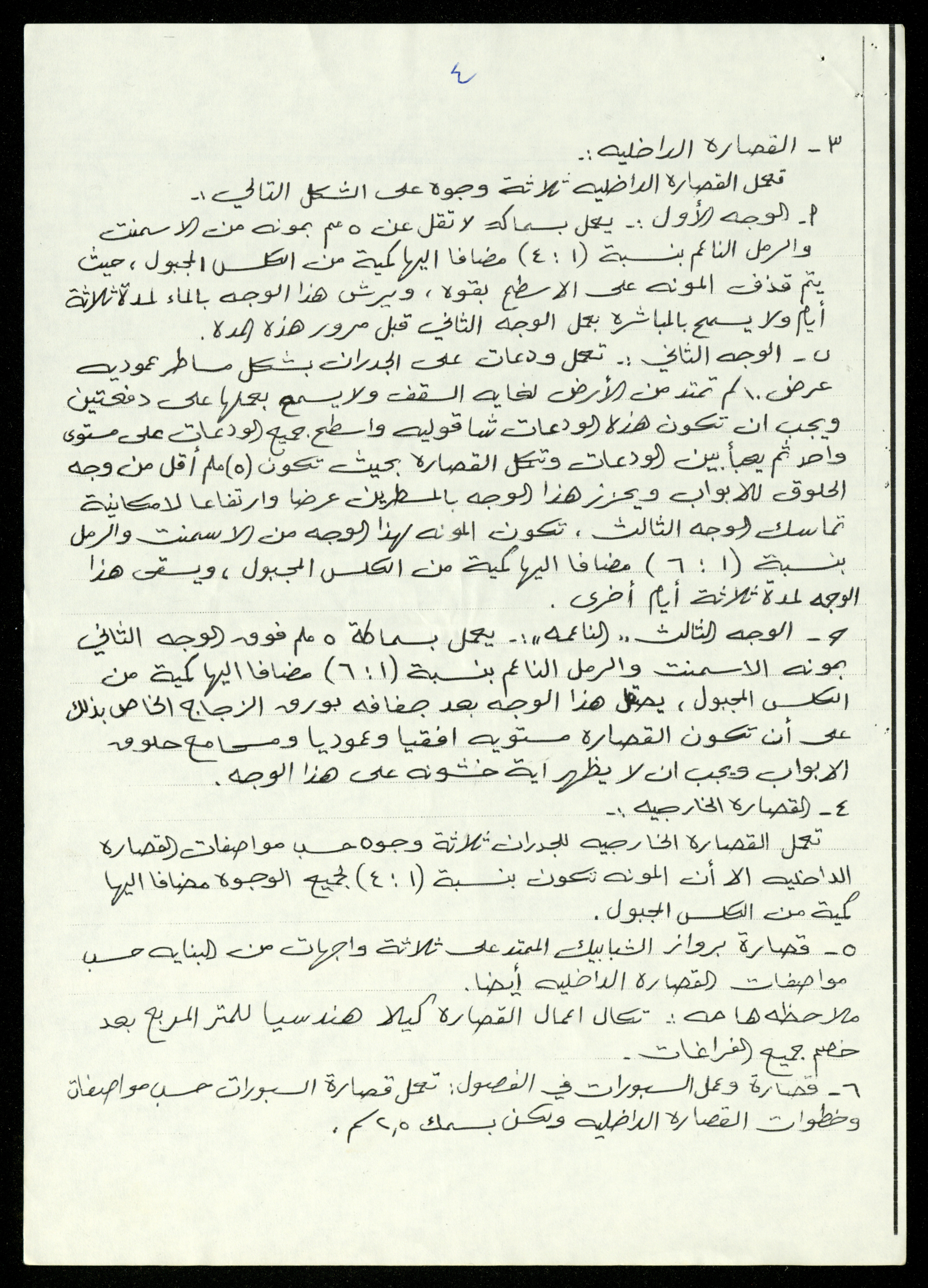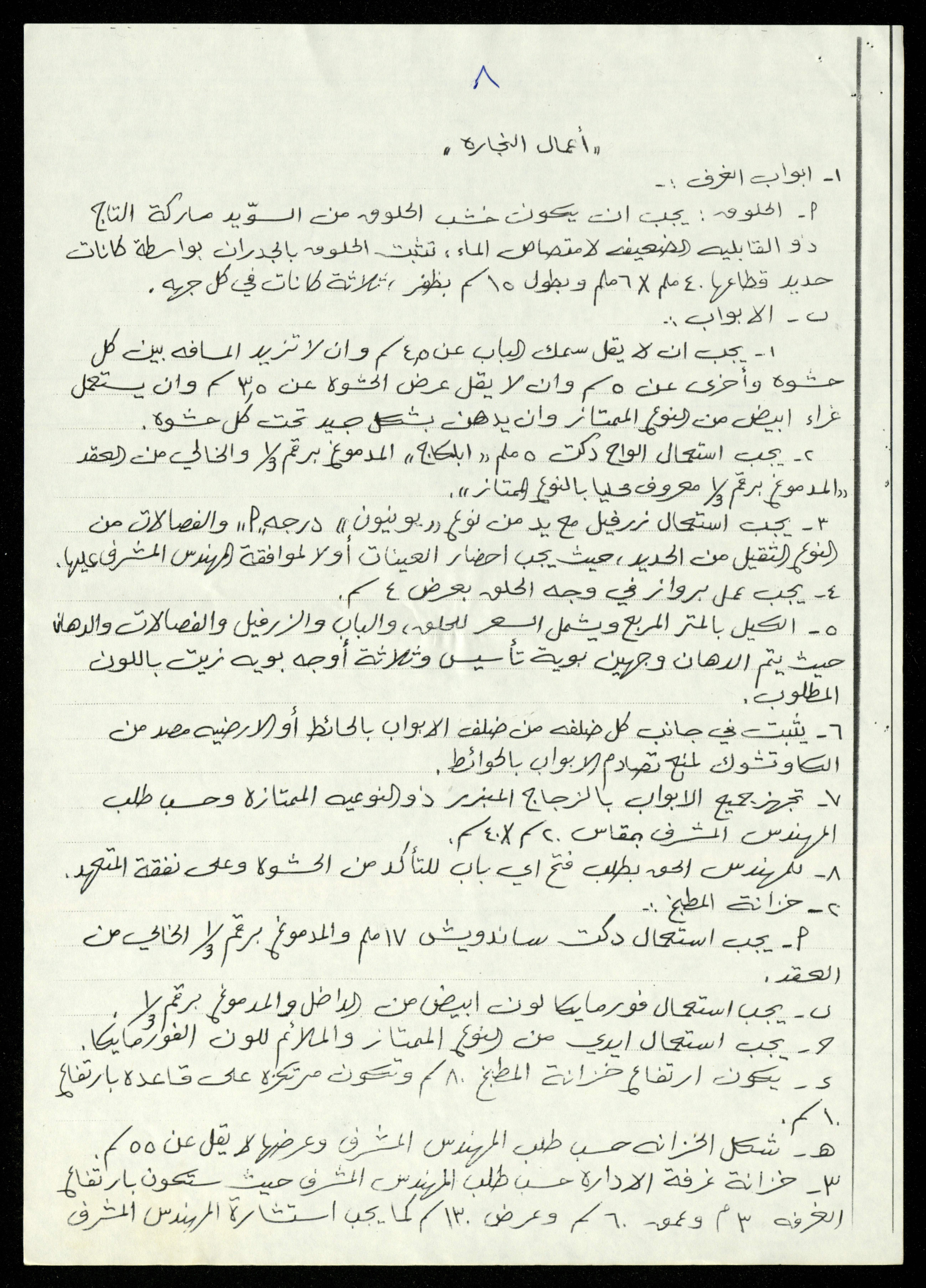 Handwritten by Engineer Hatem Odeh, this 15-page document shows the conditions, specifications, and quantities schedule for the finishing project of al-Murabitat Charitable Society.