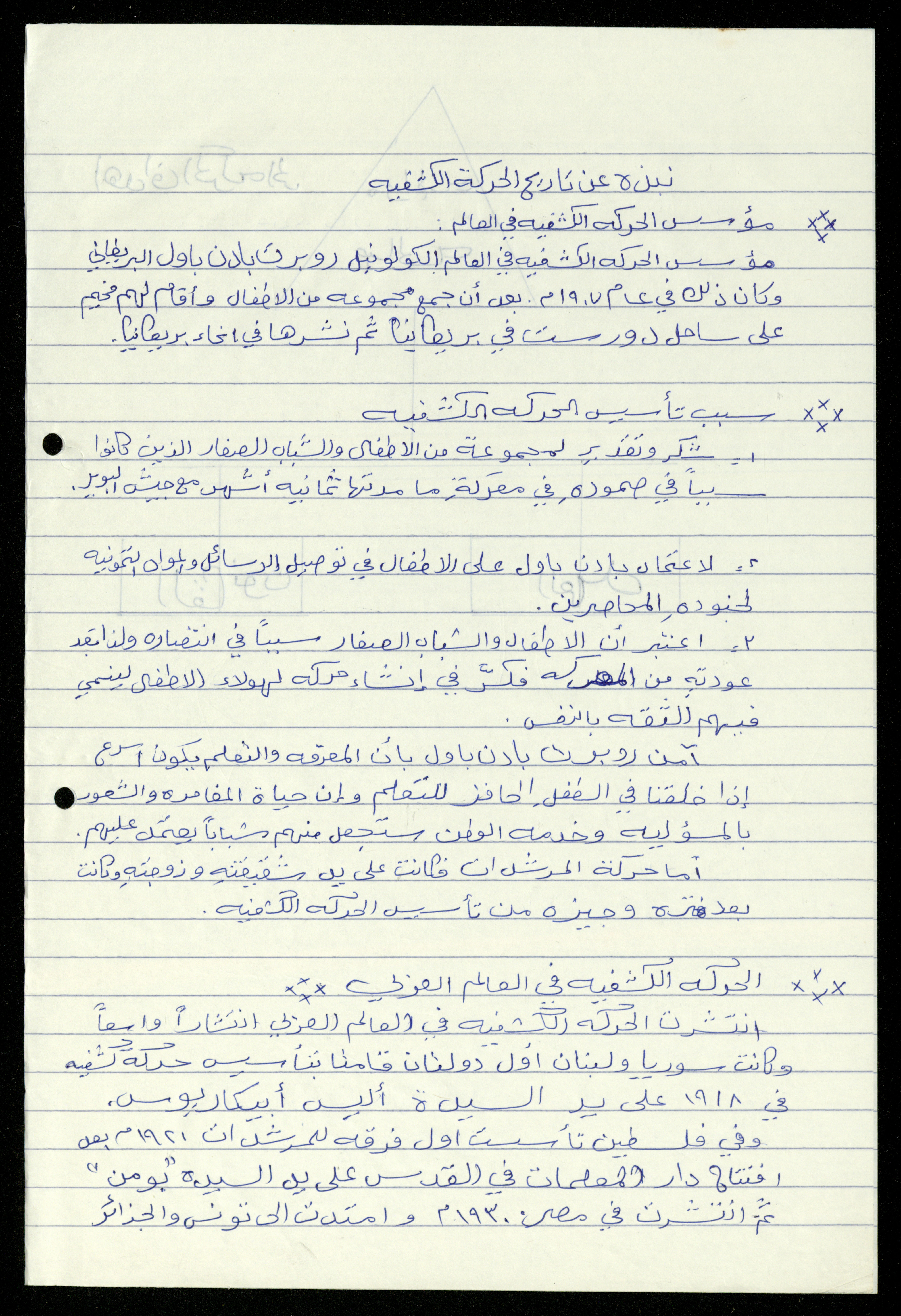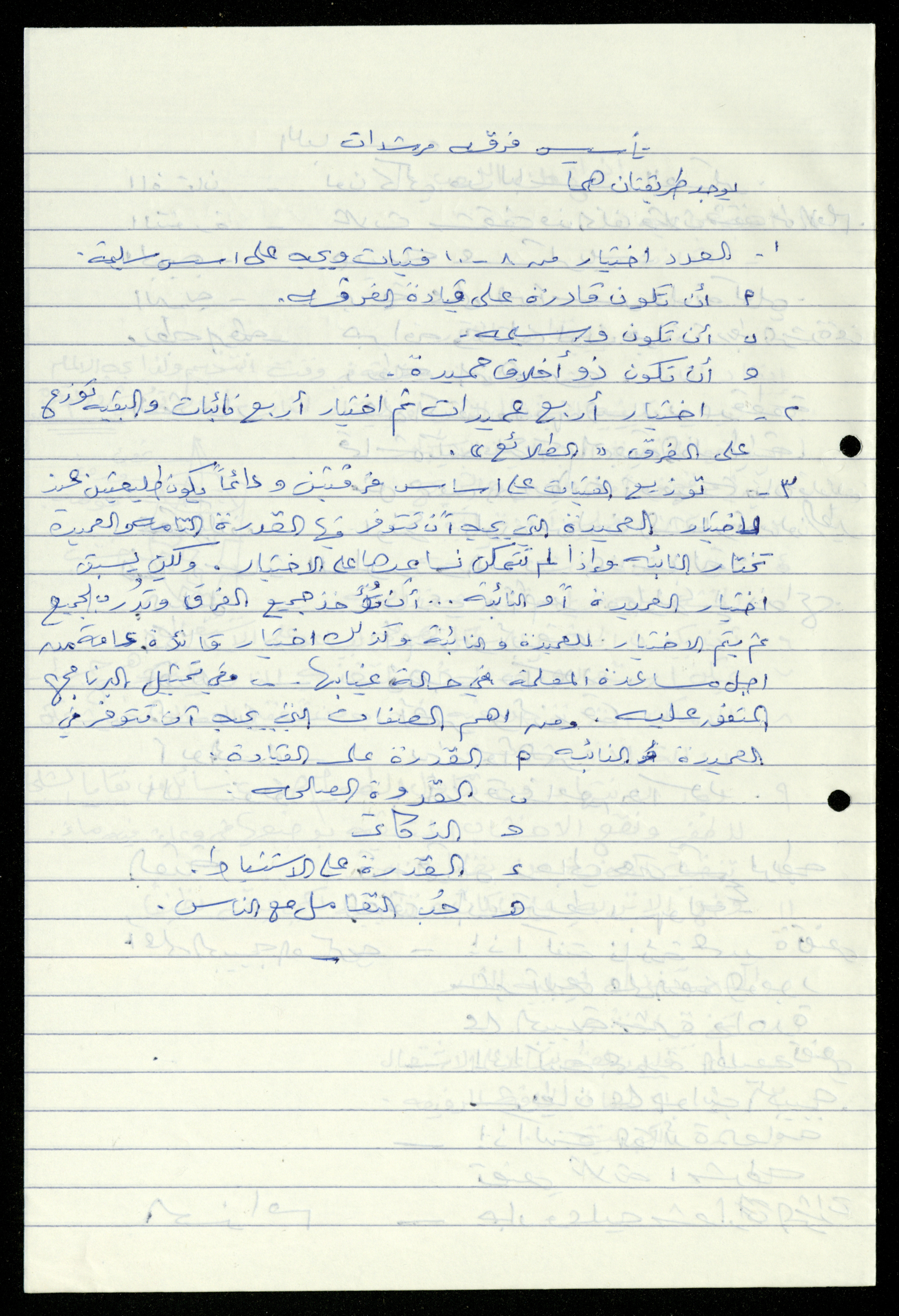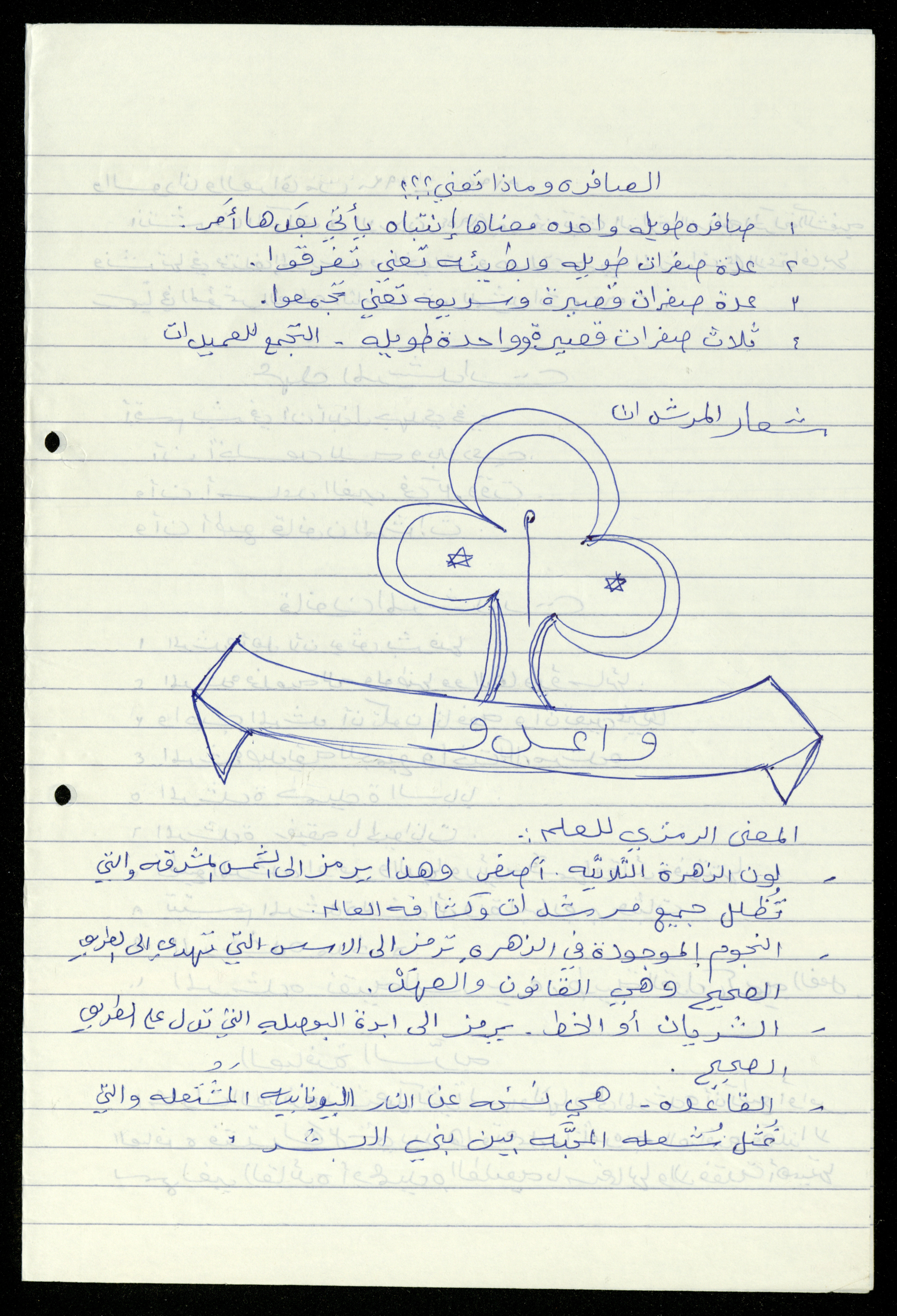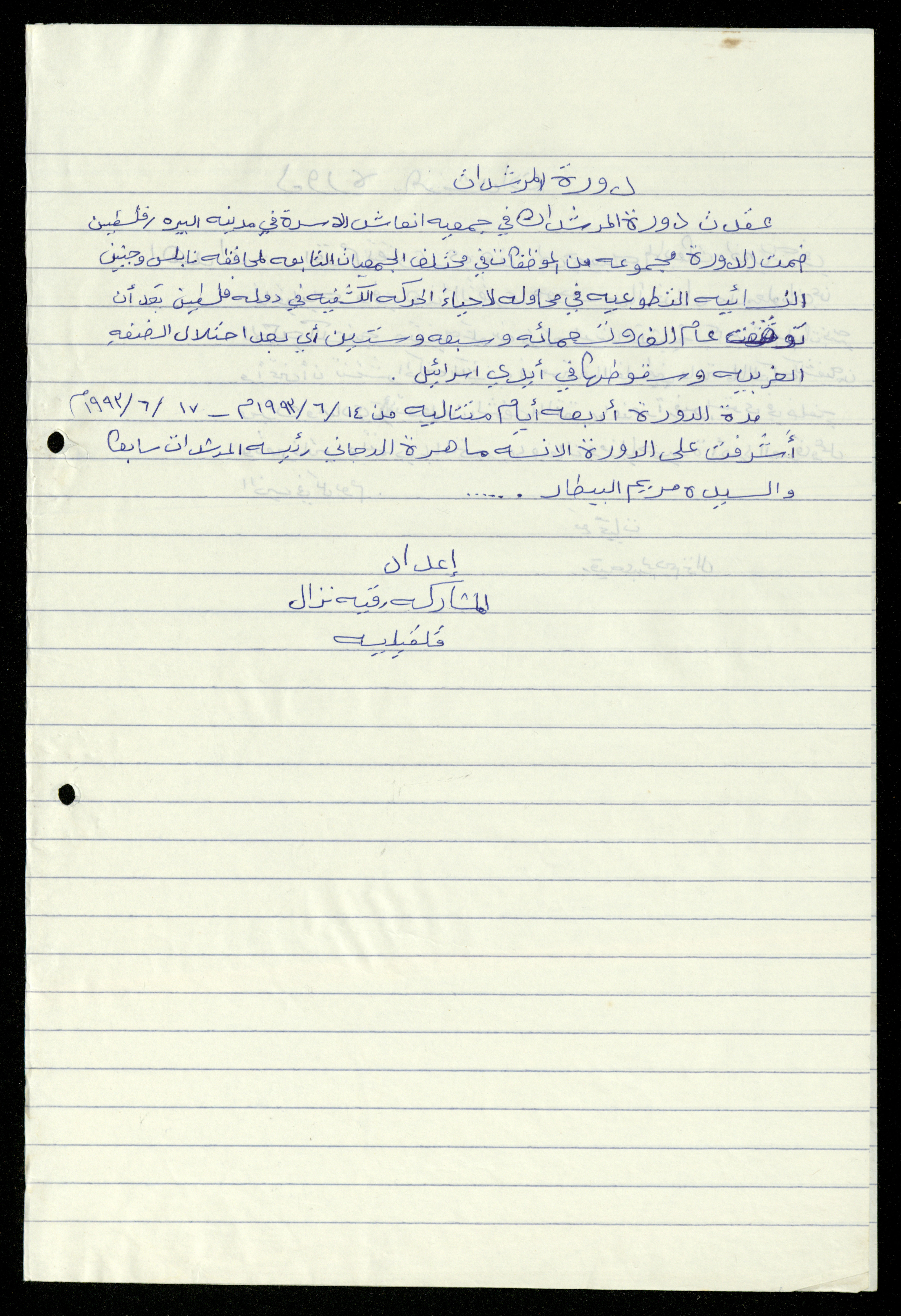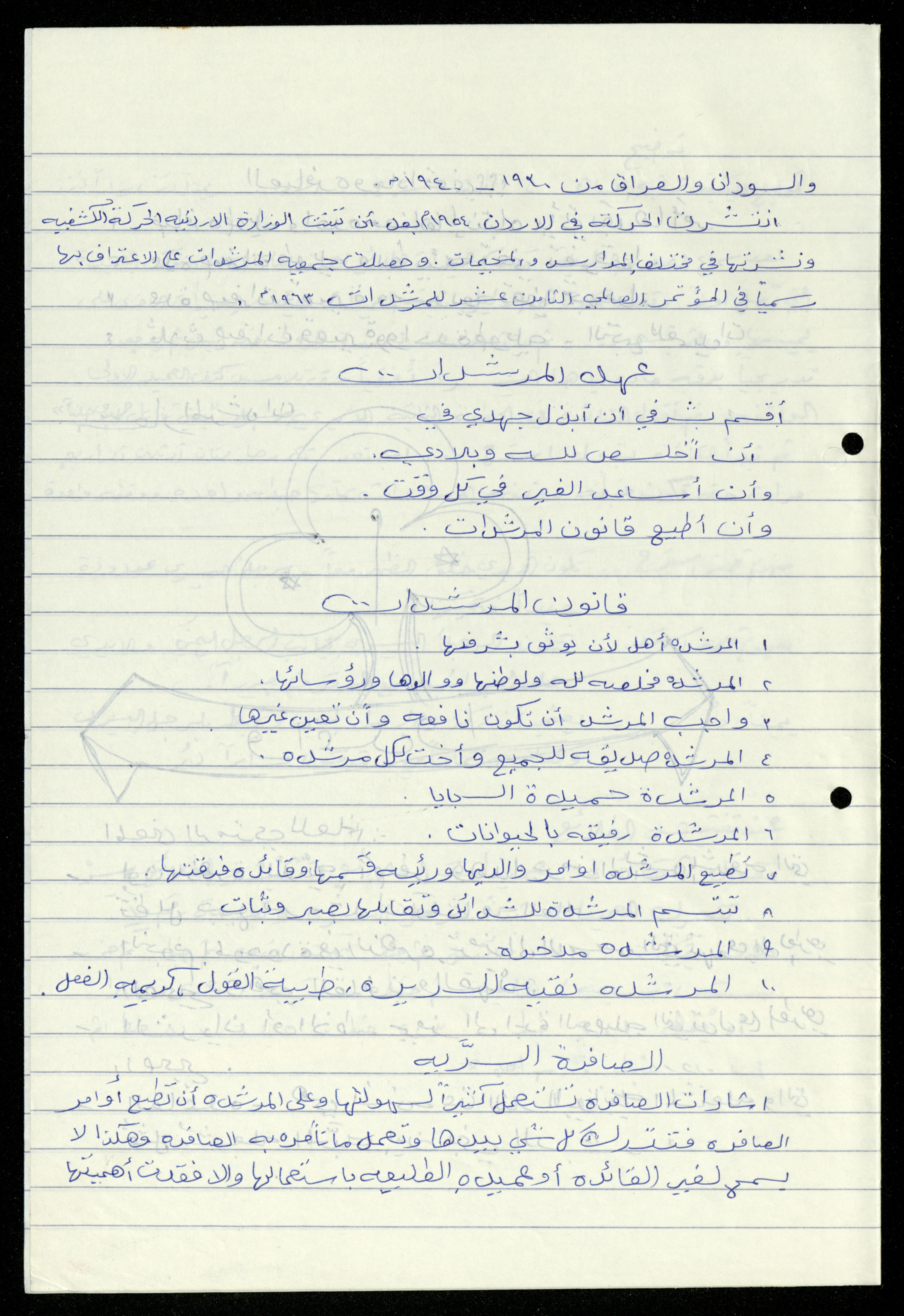 Handwritten, this 19-page document shows the scout file in the archive of the al-Murabitat Charitable Society in Qalqilya regarding the scout course held by the Inash al-Usra Association in al-Bireh in 1993, in which the Society participated. The file includes: - A report on the Girl Guides course to revive the scout movement. - An overview of the history of the scouting movement. - The Girl Guides promise. - Guides Law. - The meaning of the secret whistle. - Guides logo. - New mentor acceptance party. - Armbands and types of knots. - Scout outfits, types of toys, and campfires. - Methods of forming teams of Girl Guides.