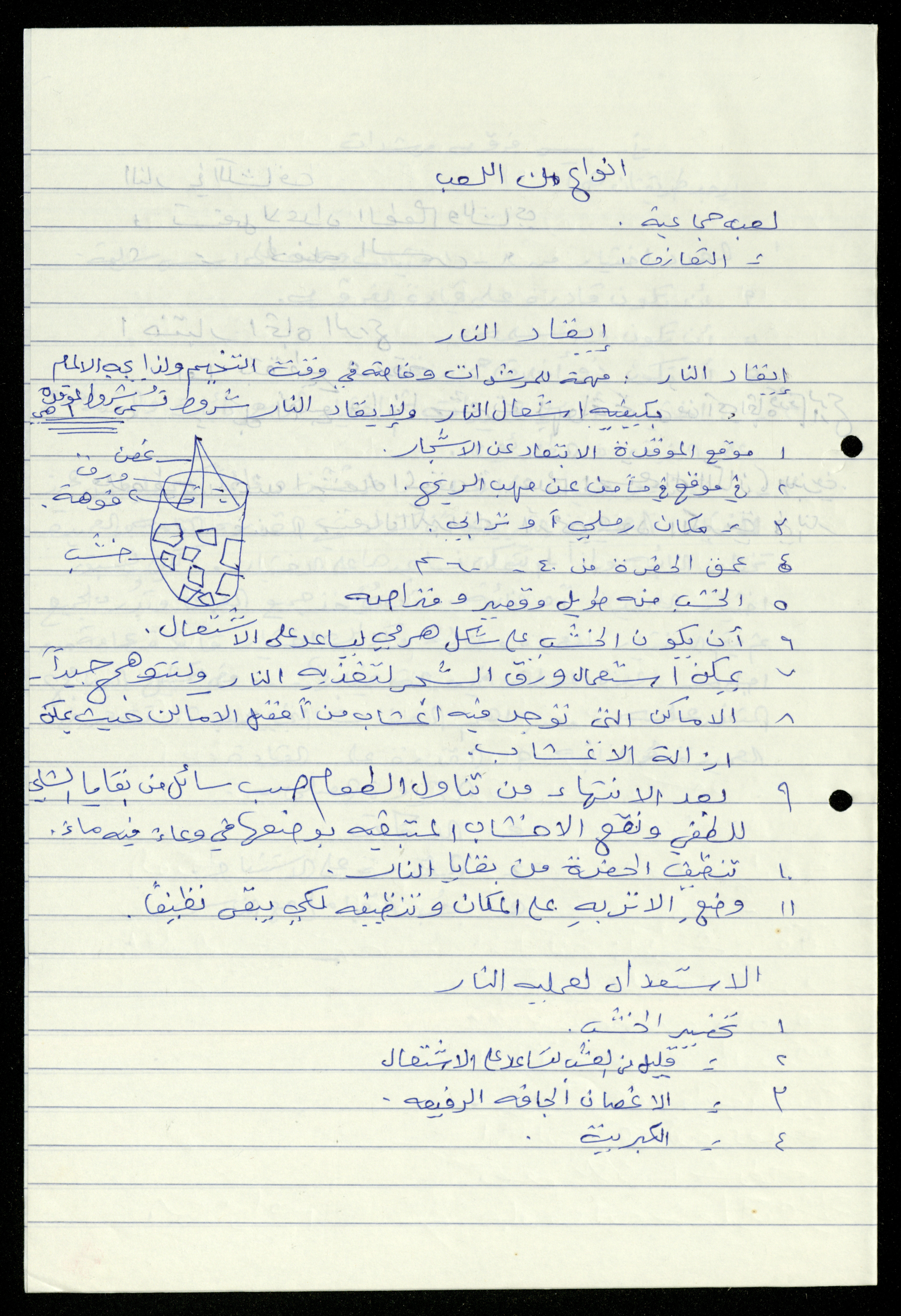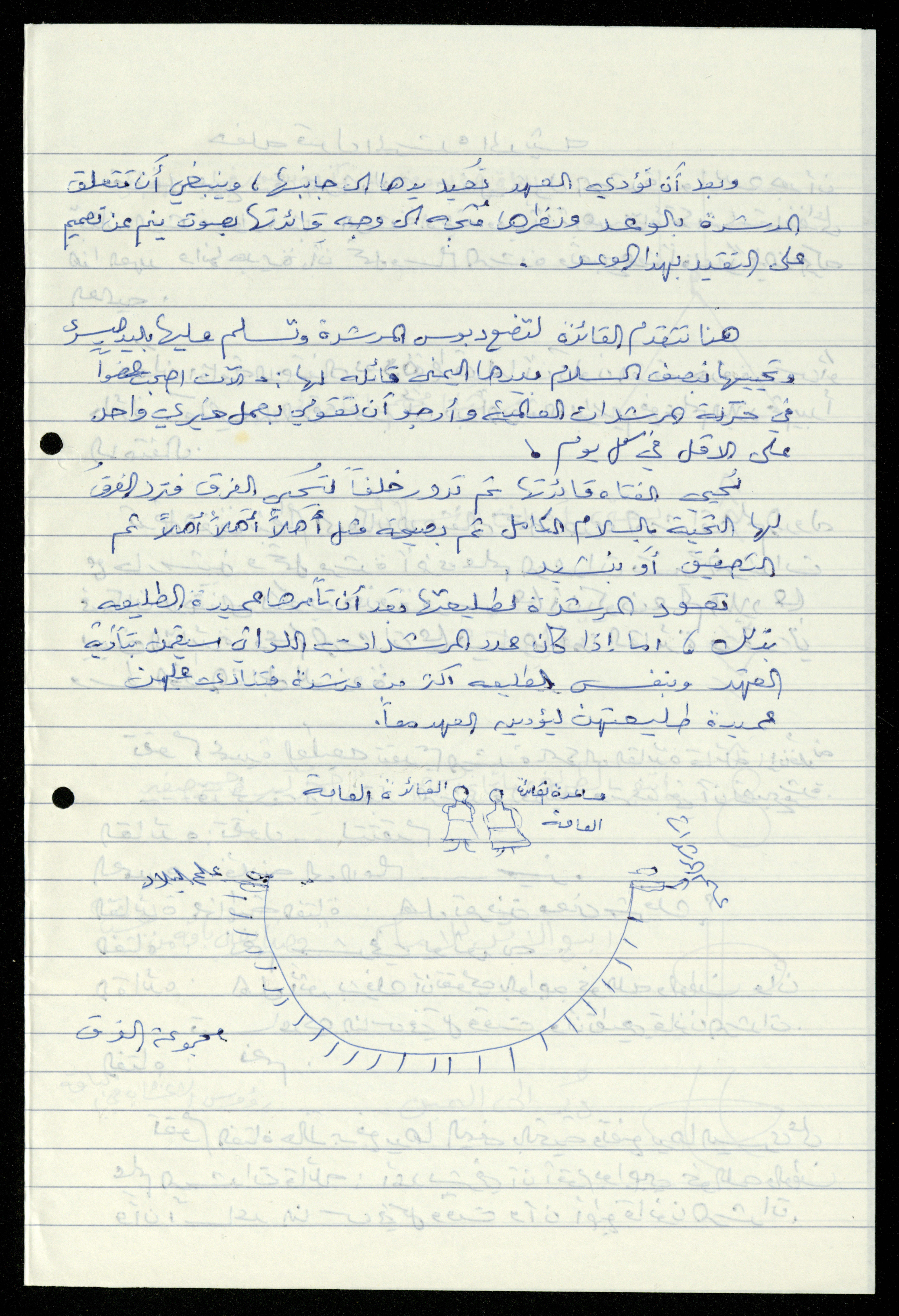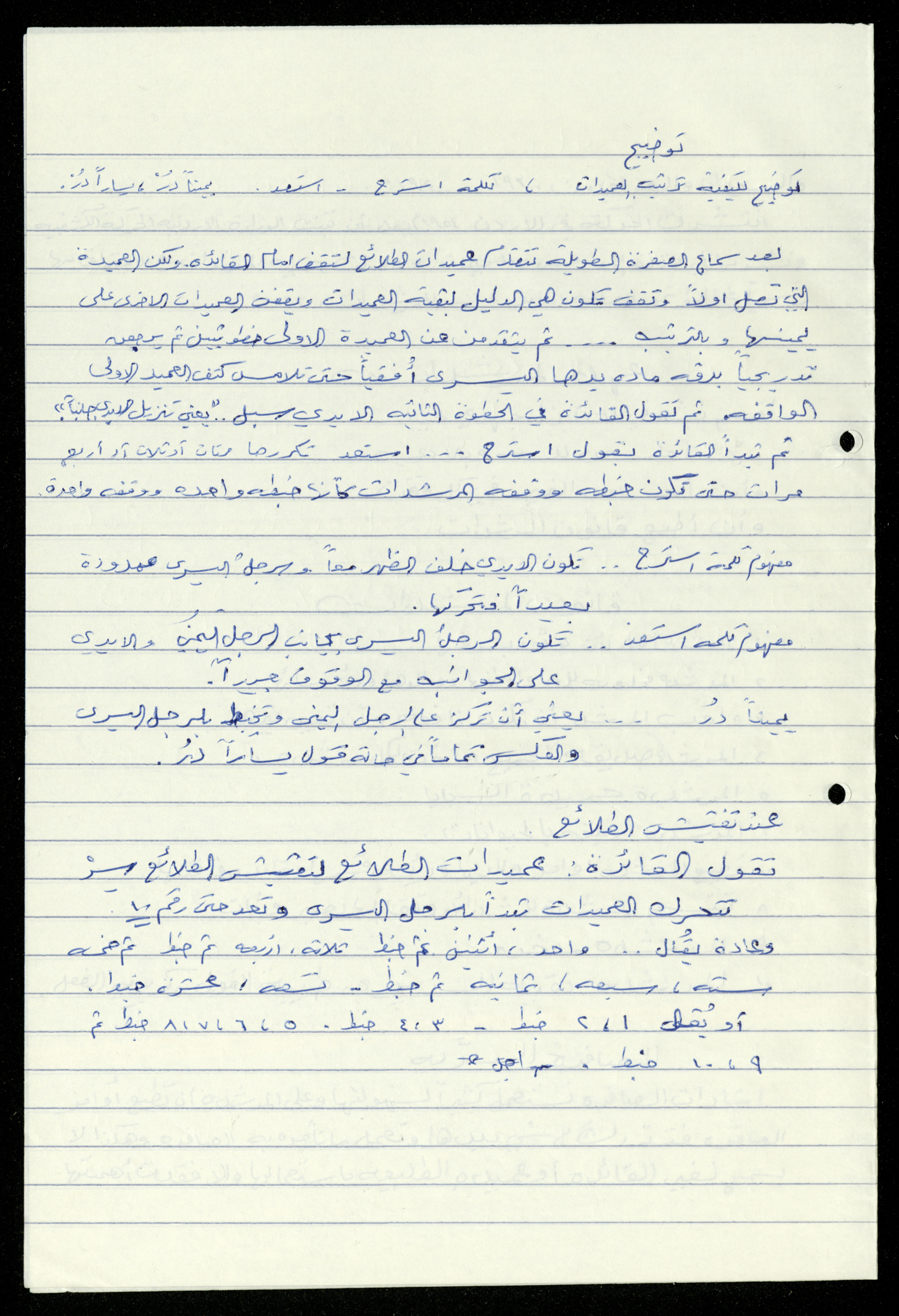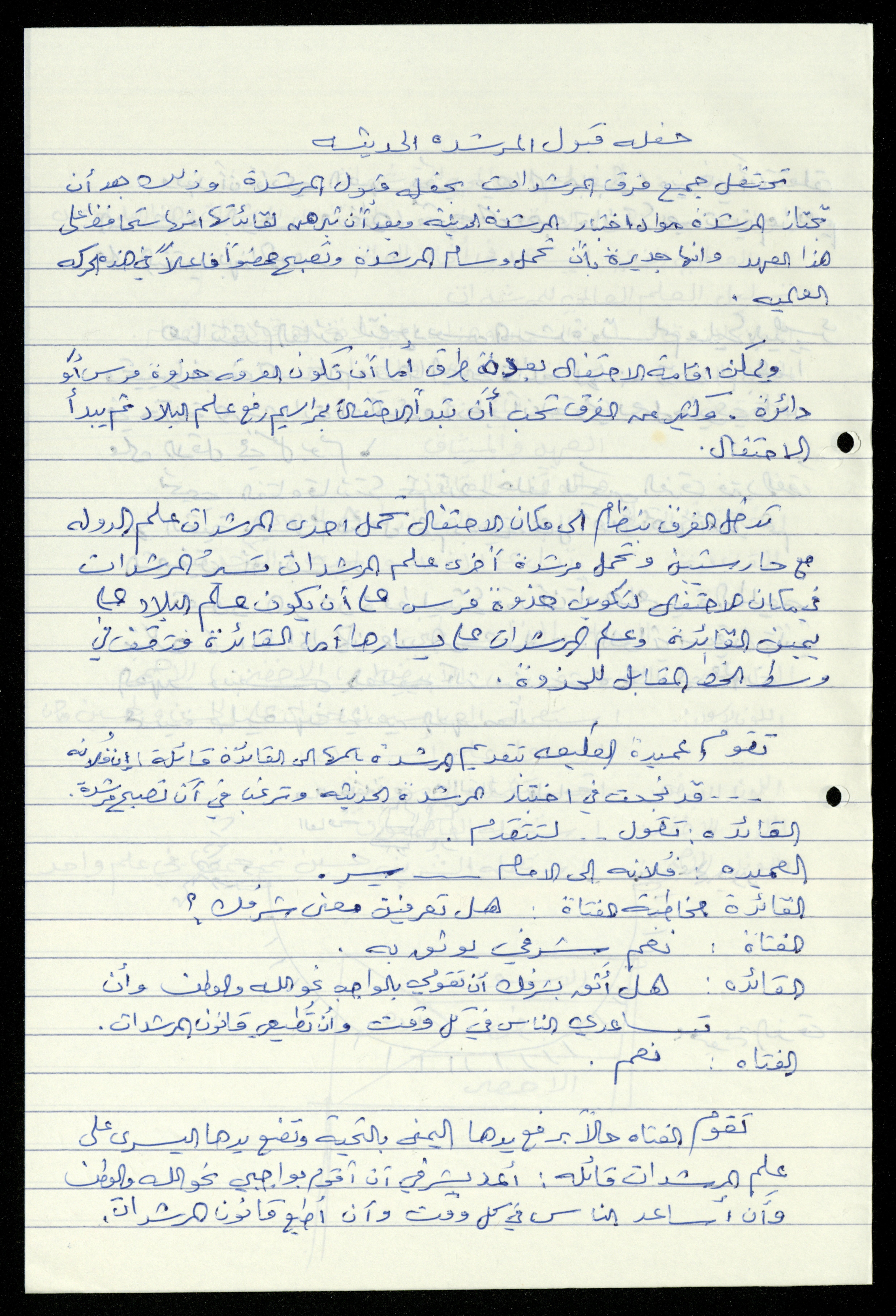Handwritten, this 19-page document shows the scout file in the archive of the al-Murabitat Charitable Society in Qalqilya regarding the scout course held by the Inash al-Usra Association in al-Bireh in 1993, in which the Society participated. The file includes: - A report on the Girl Guides course to revive the scout movement. - An overview of the history of the scouting movement. - The Girl Guides promise. - Guides Law. - The meaning of the secret whistle. - Guides logo. - New mentor acceptance party. - Armbands and types of knots. - Scout outfits, types of toys, and campfires. - Methods of forming teams of Girl Guides.