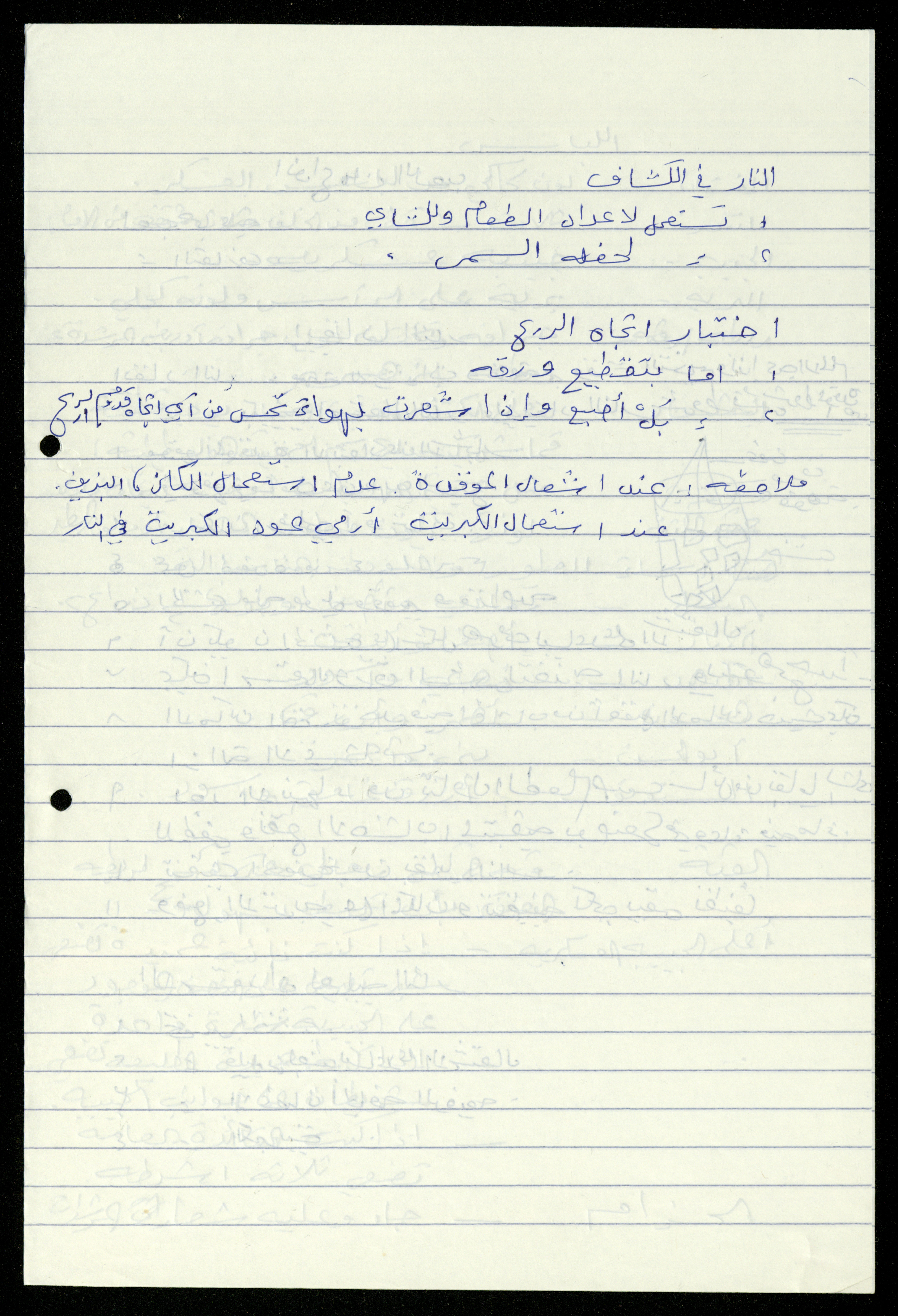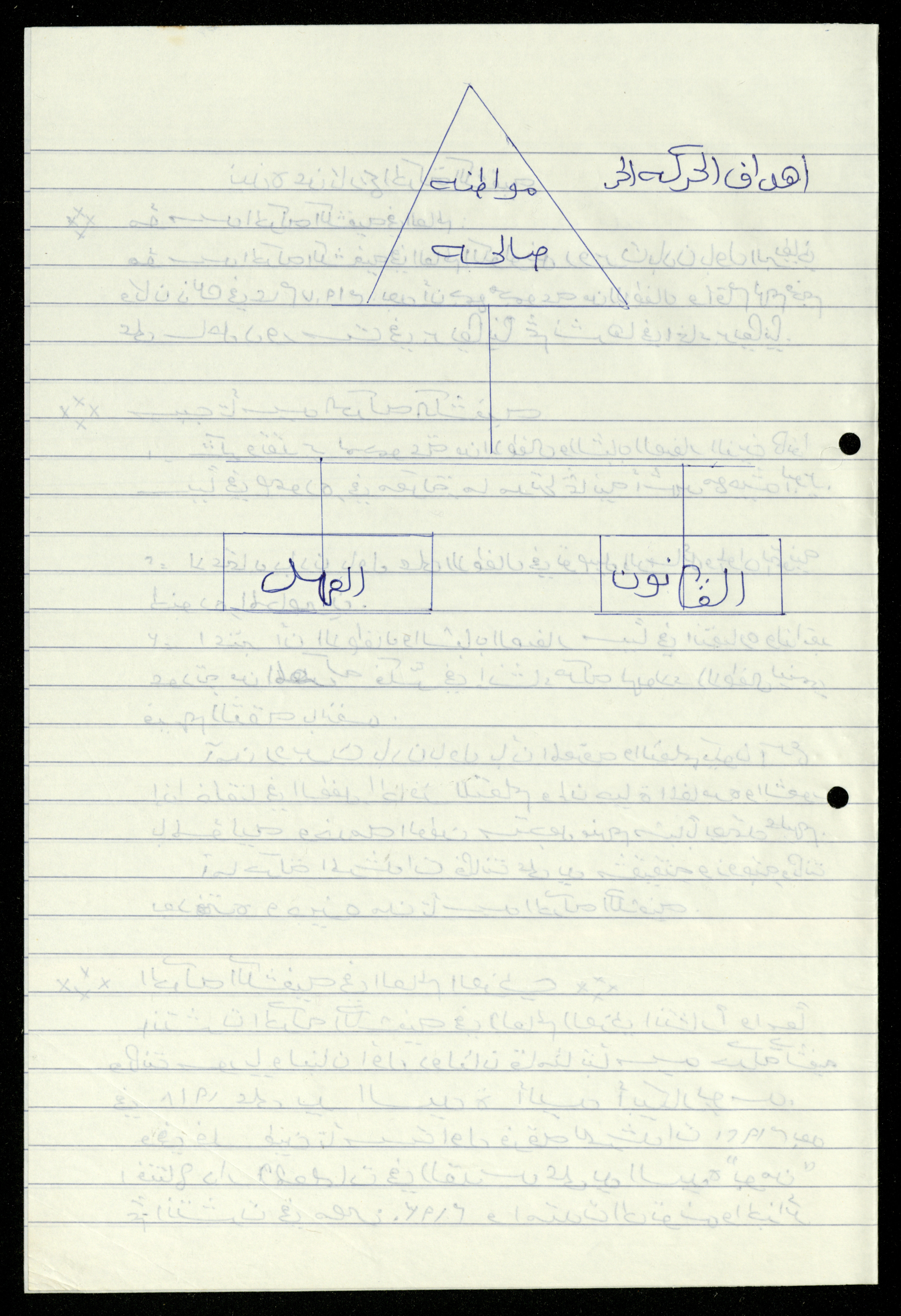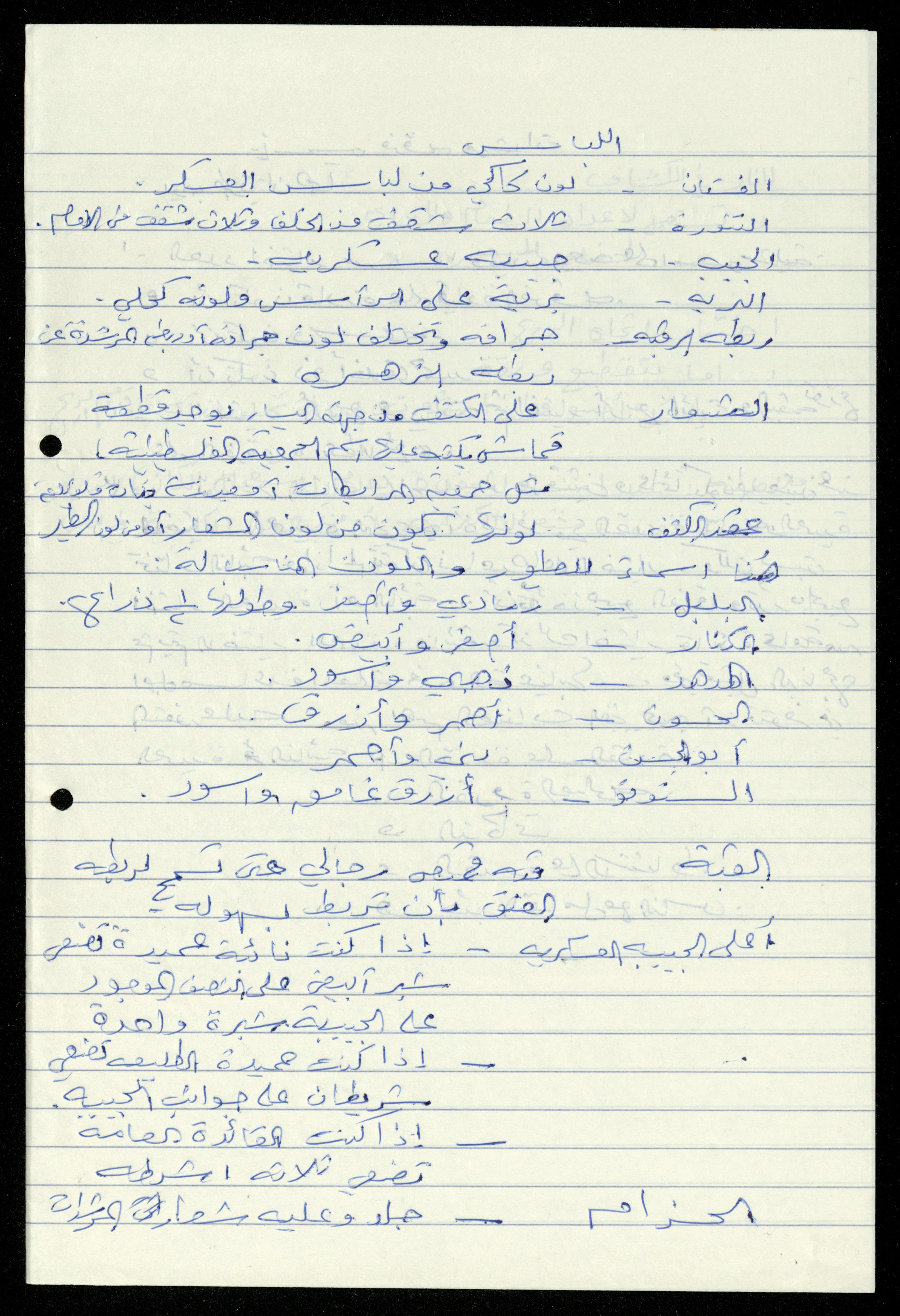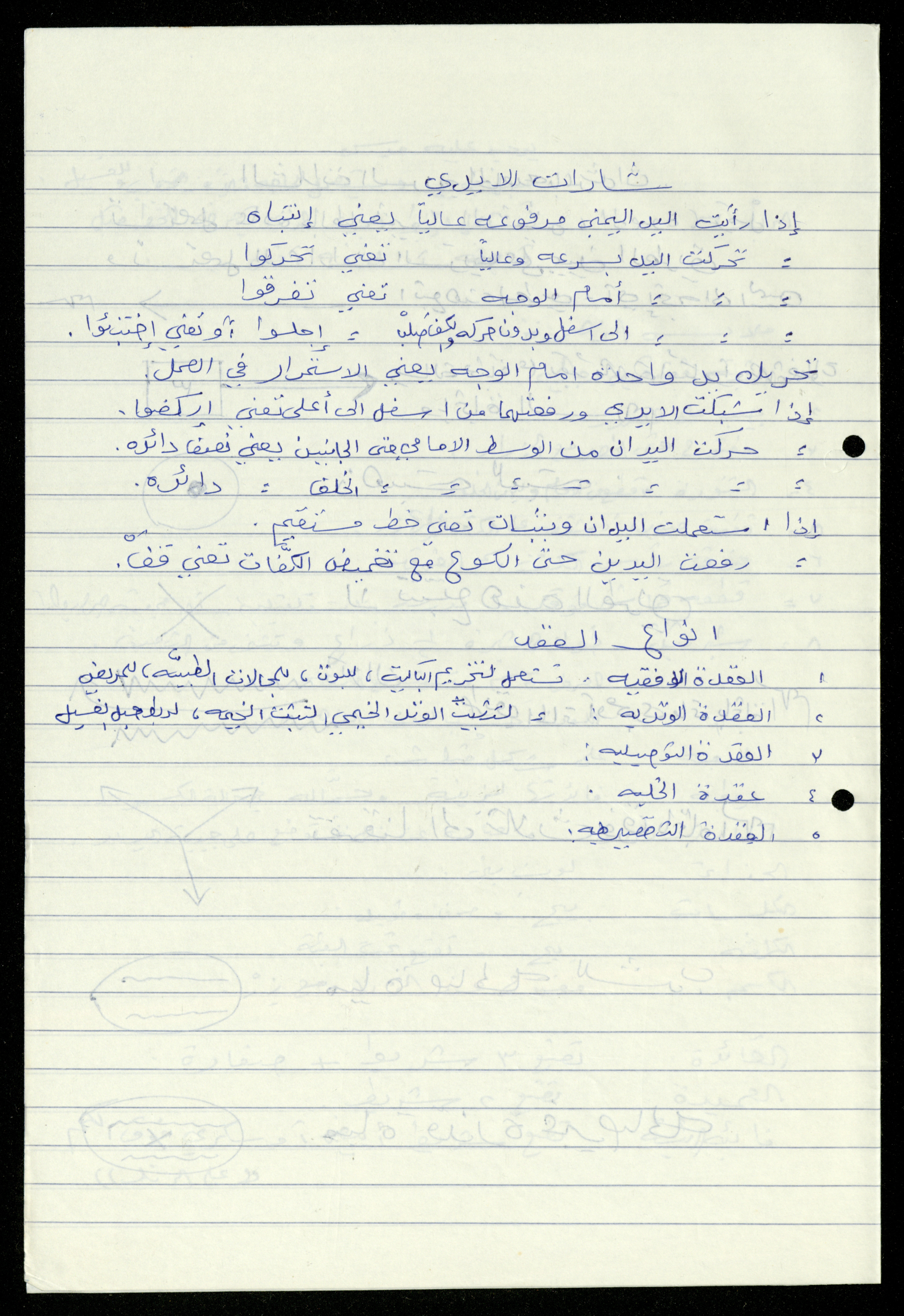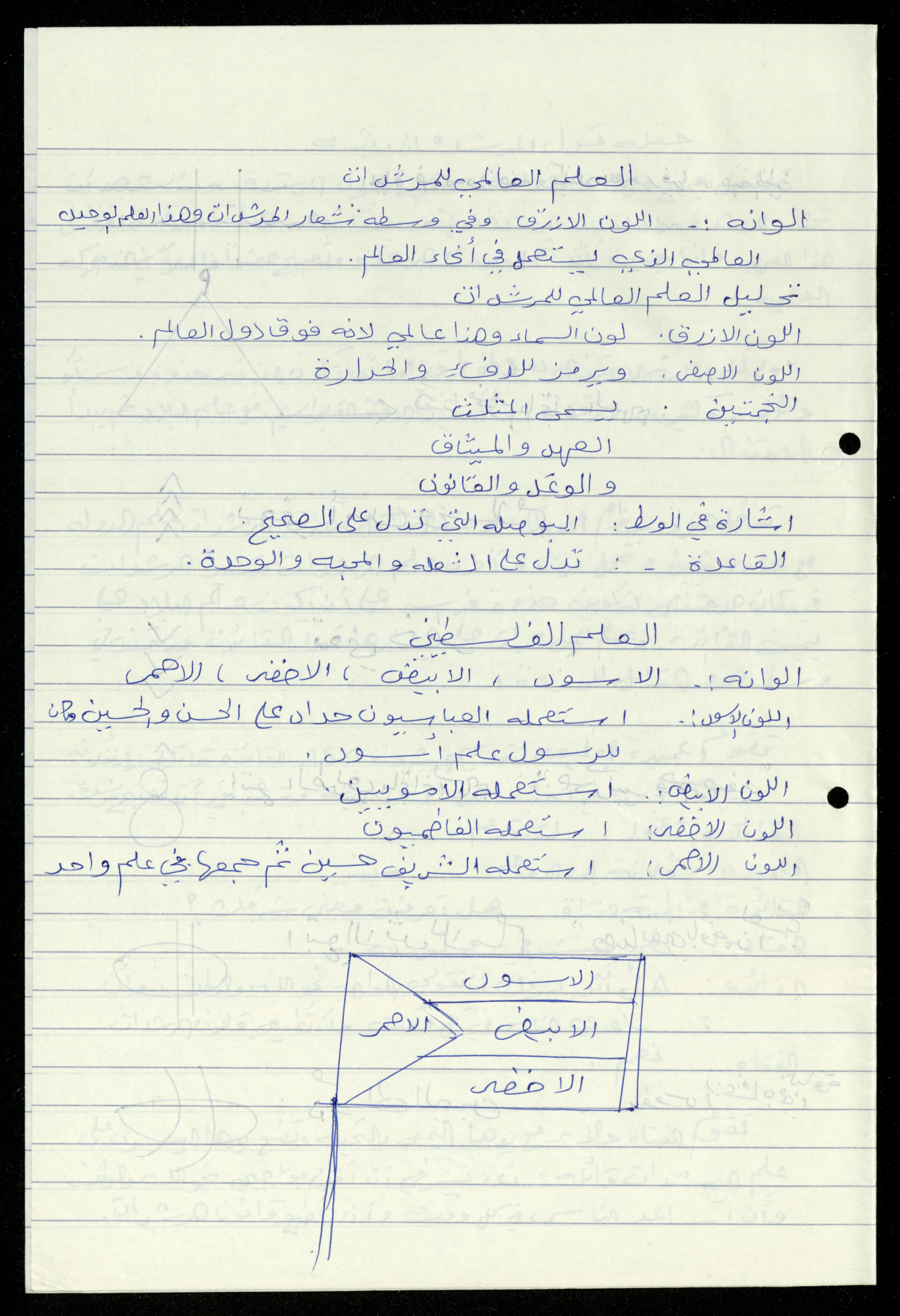 Handwritten, this 19-page document shows the scout file in the archive of the al-Murabitat Charitable Society in Qalqilya regarding the scout course held by the Inash al-Usra Association in al-Bireh in 1993, in which the Society participated. The file includes: - A report on the Girl Guides course to revive the scout movement. - An overview of the history of the scouting movement. - The Girl Guides promise. - Guides Law. - The meaning of the secret whistle. - Guides logo. - New mentor acceptance party. - Armbands and types of knots. - Scout outfits, types of toys, and campfires. - Methods of forming teams of Girl Guides.