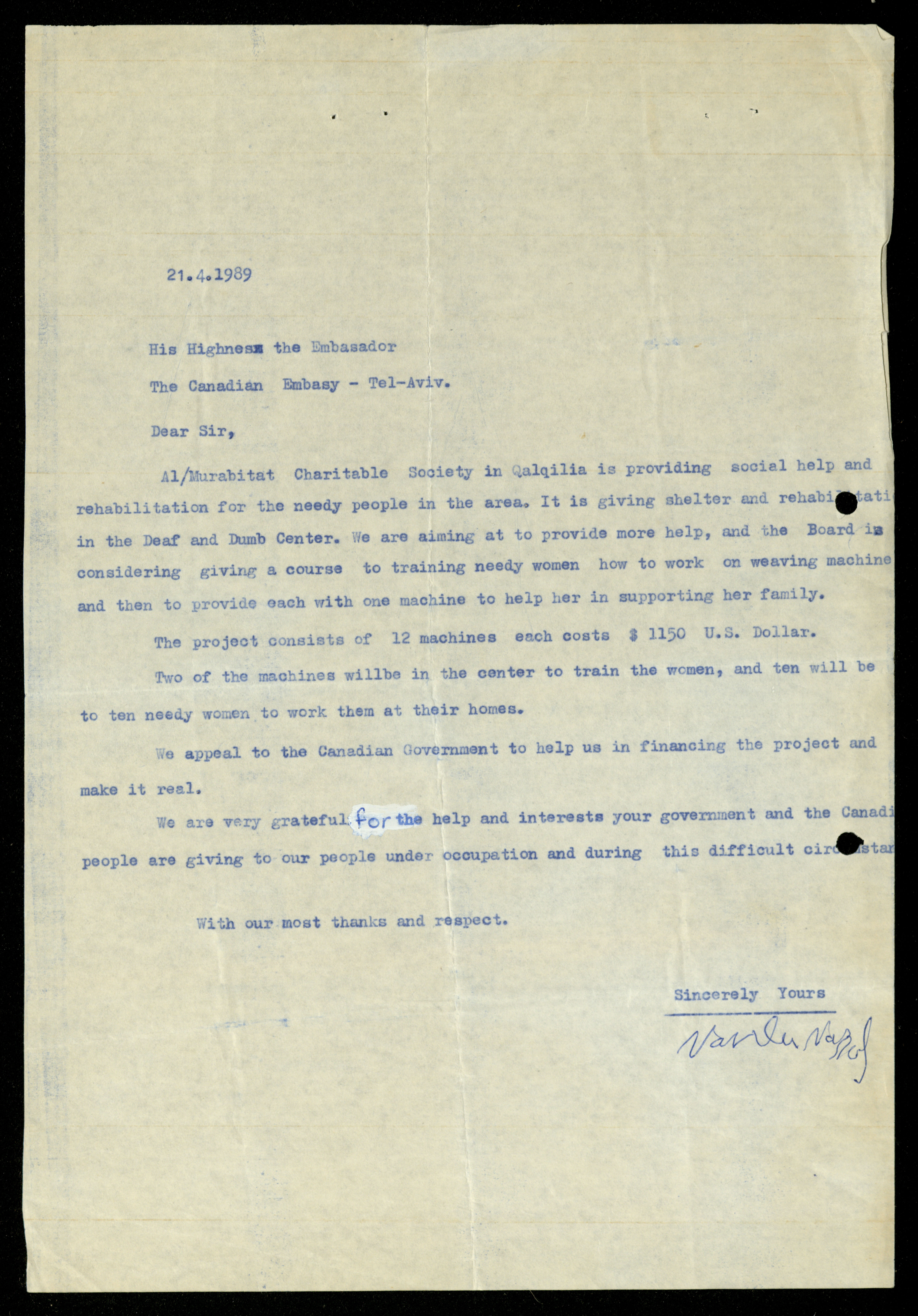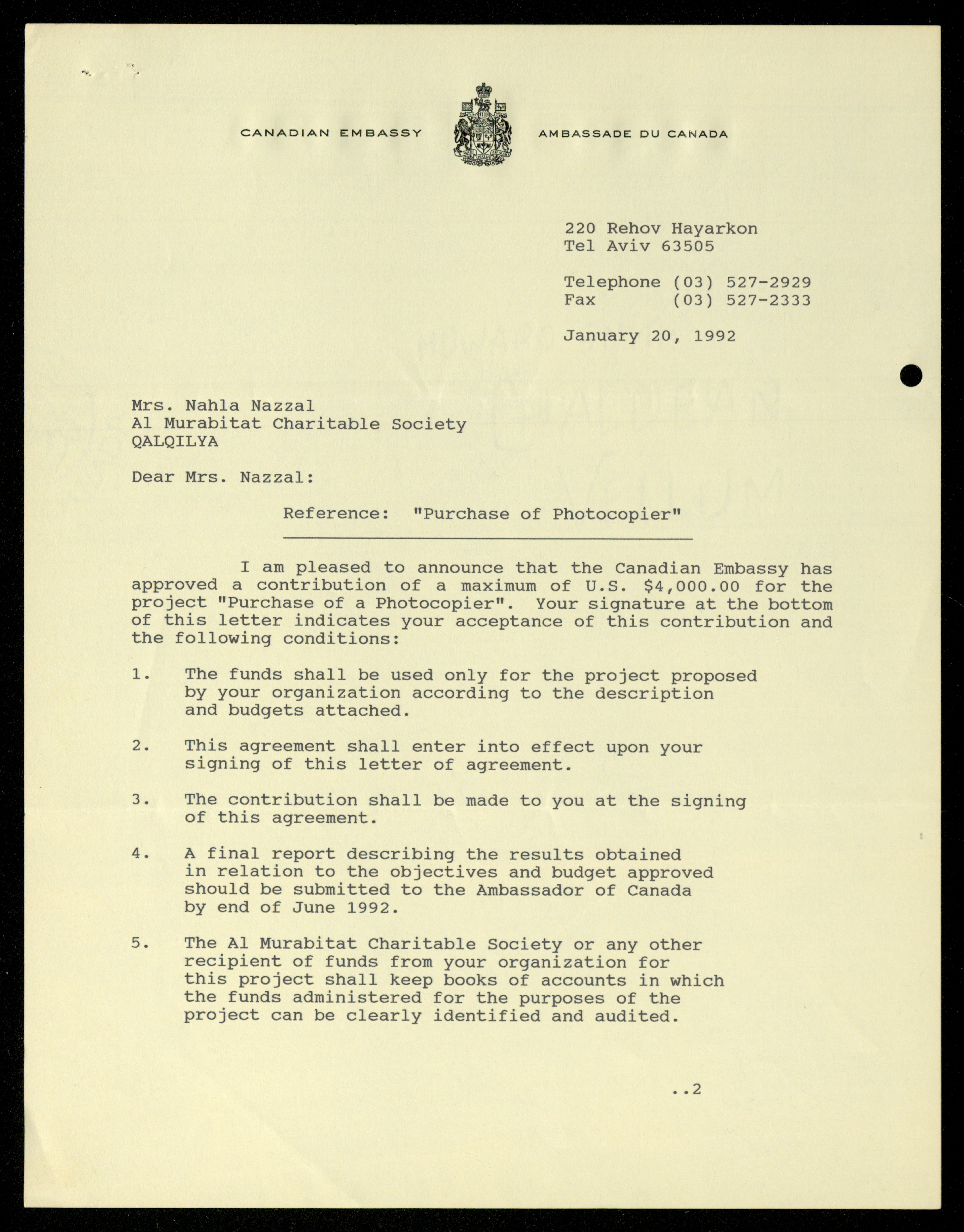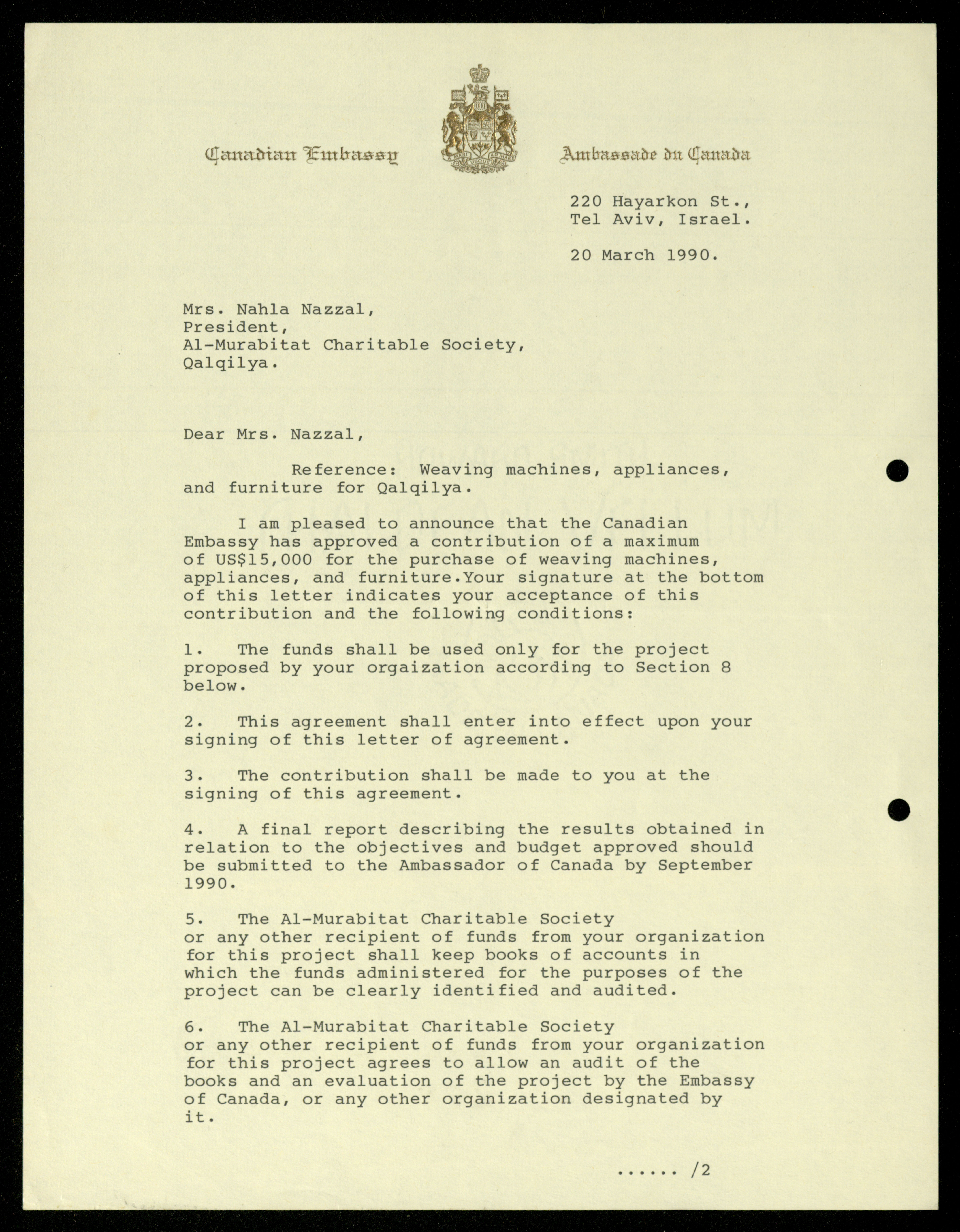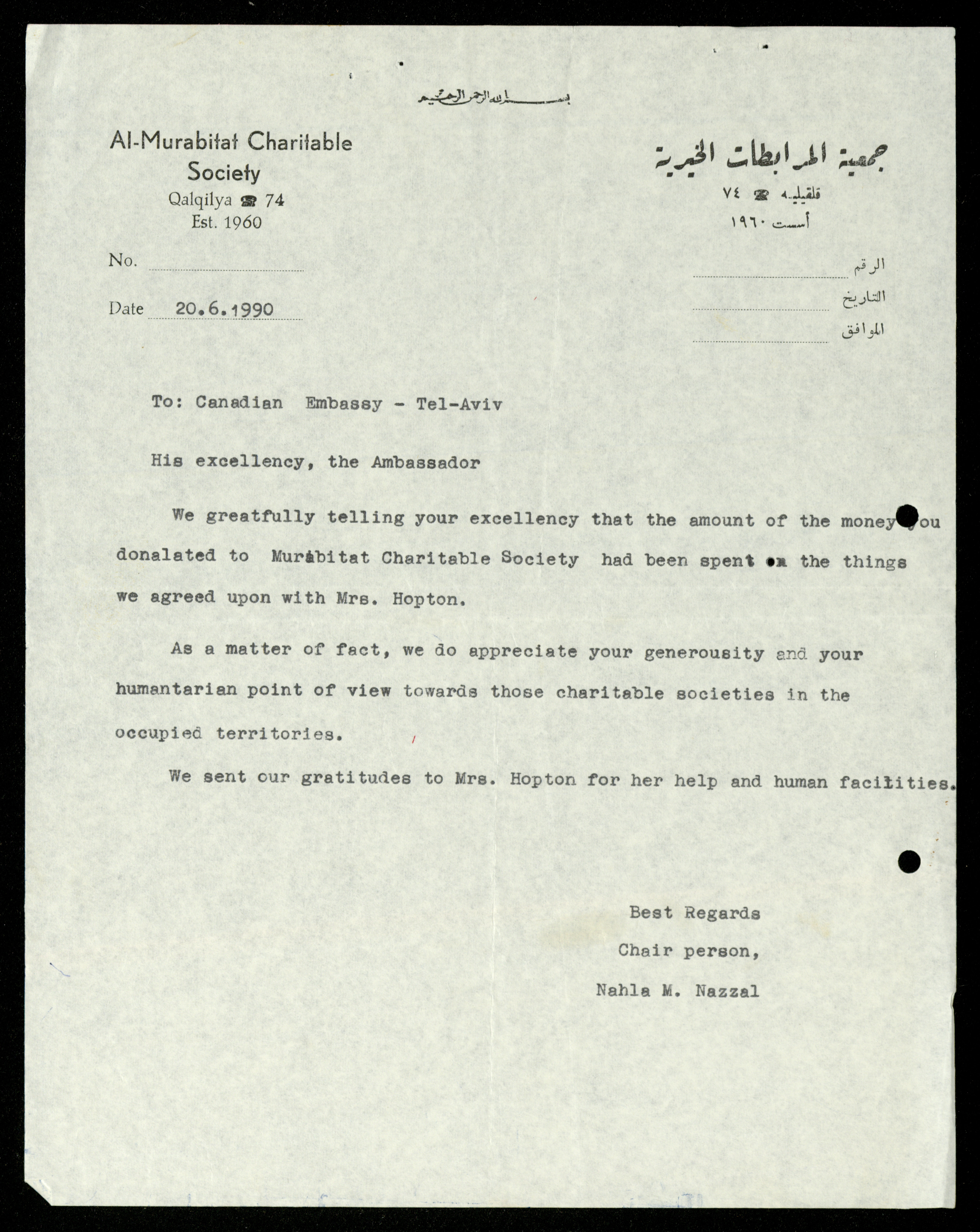 Dated from 1989 to 1992, this document shows the file of the Canadian Embassy in the al-Murabitat Charitable Society in Qalqilya, which contains 24 items, varied between Embassy and Society correspondence, cash checks, identification cards, financial receipts, notes related to the Embassy’s financing of some of the Society's needs.