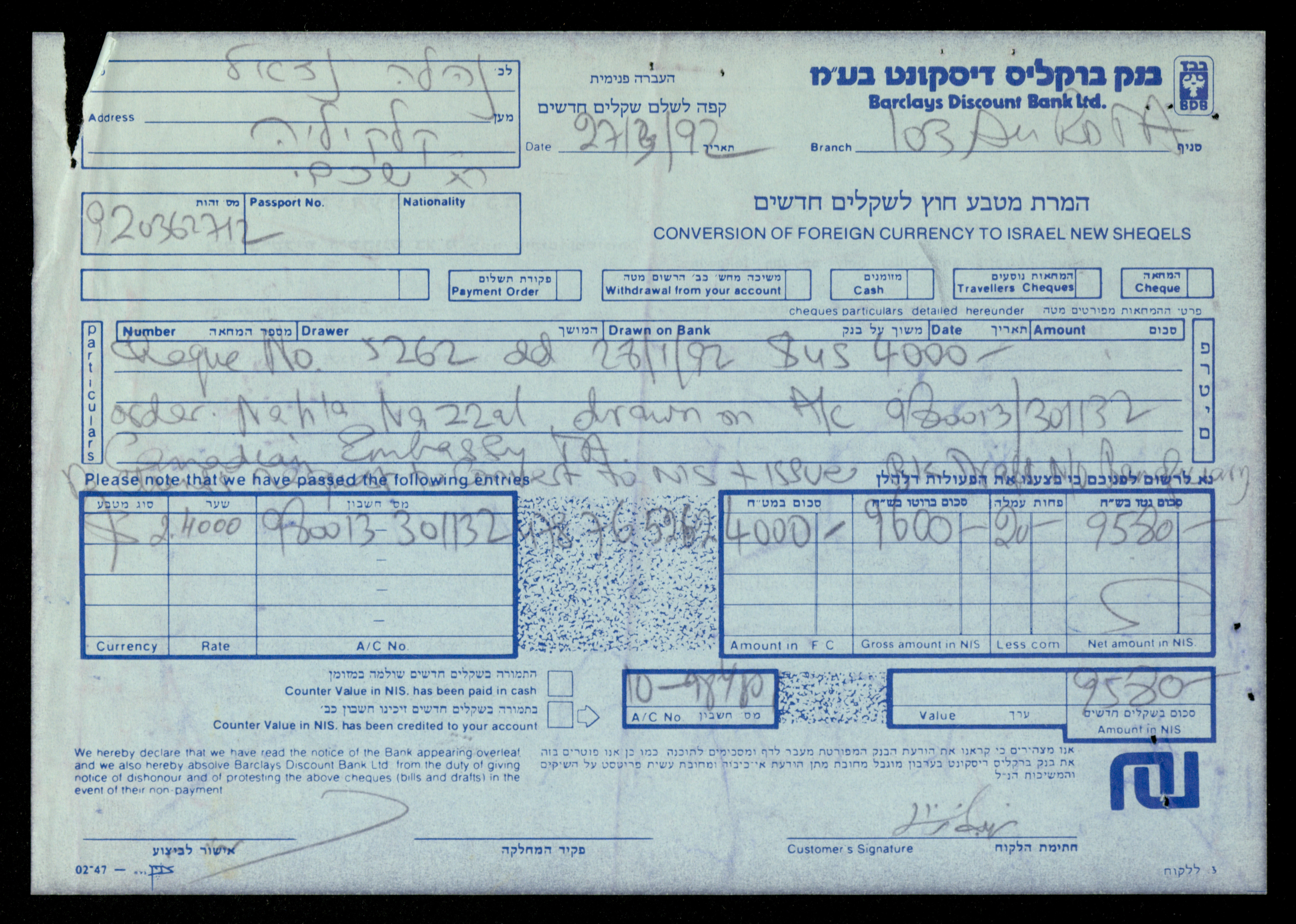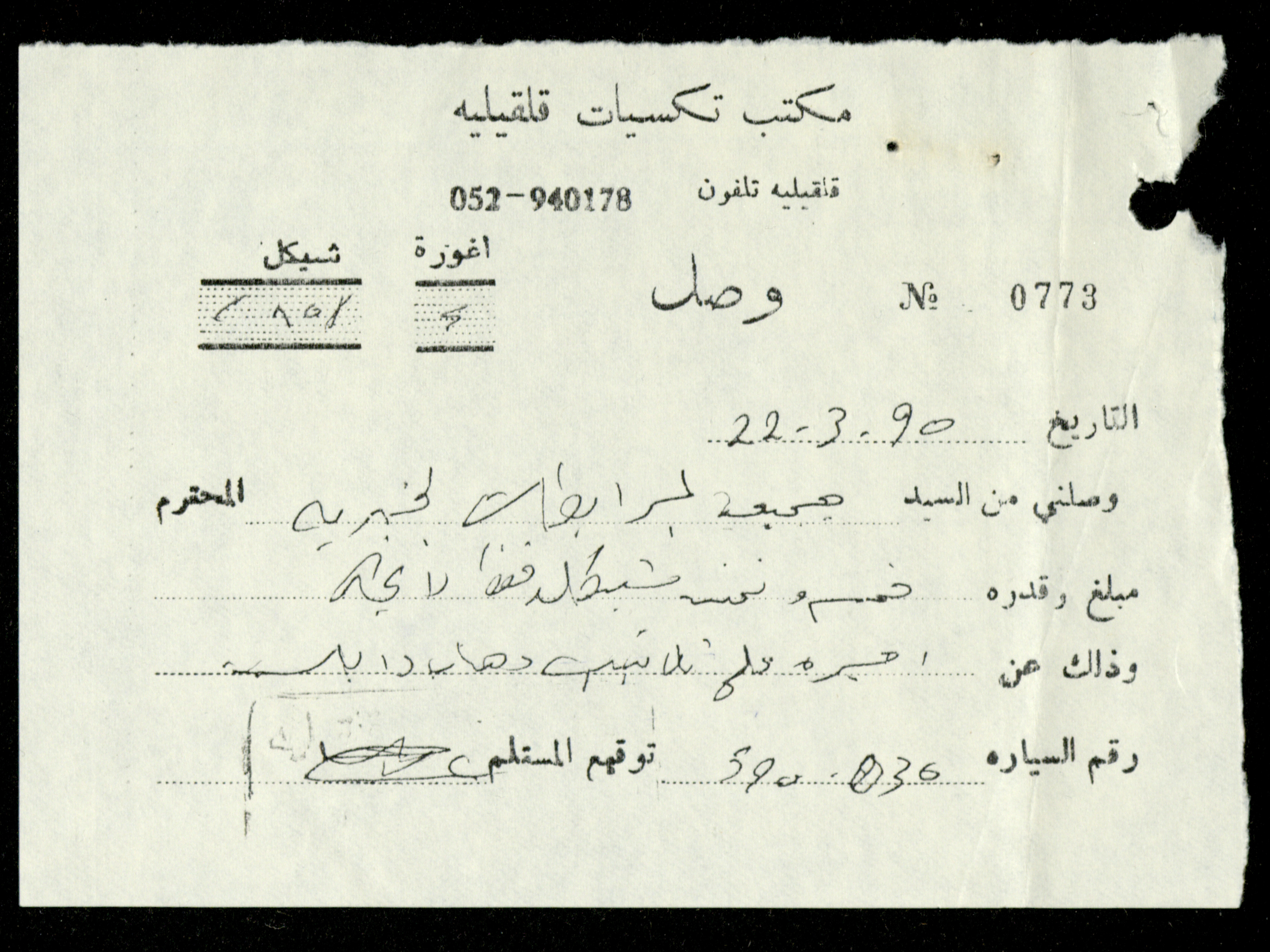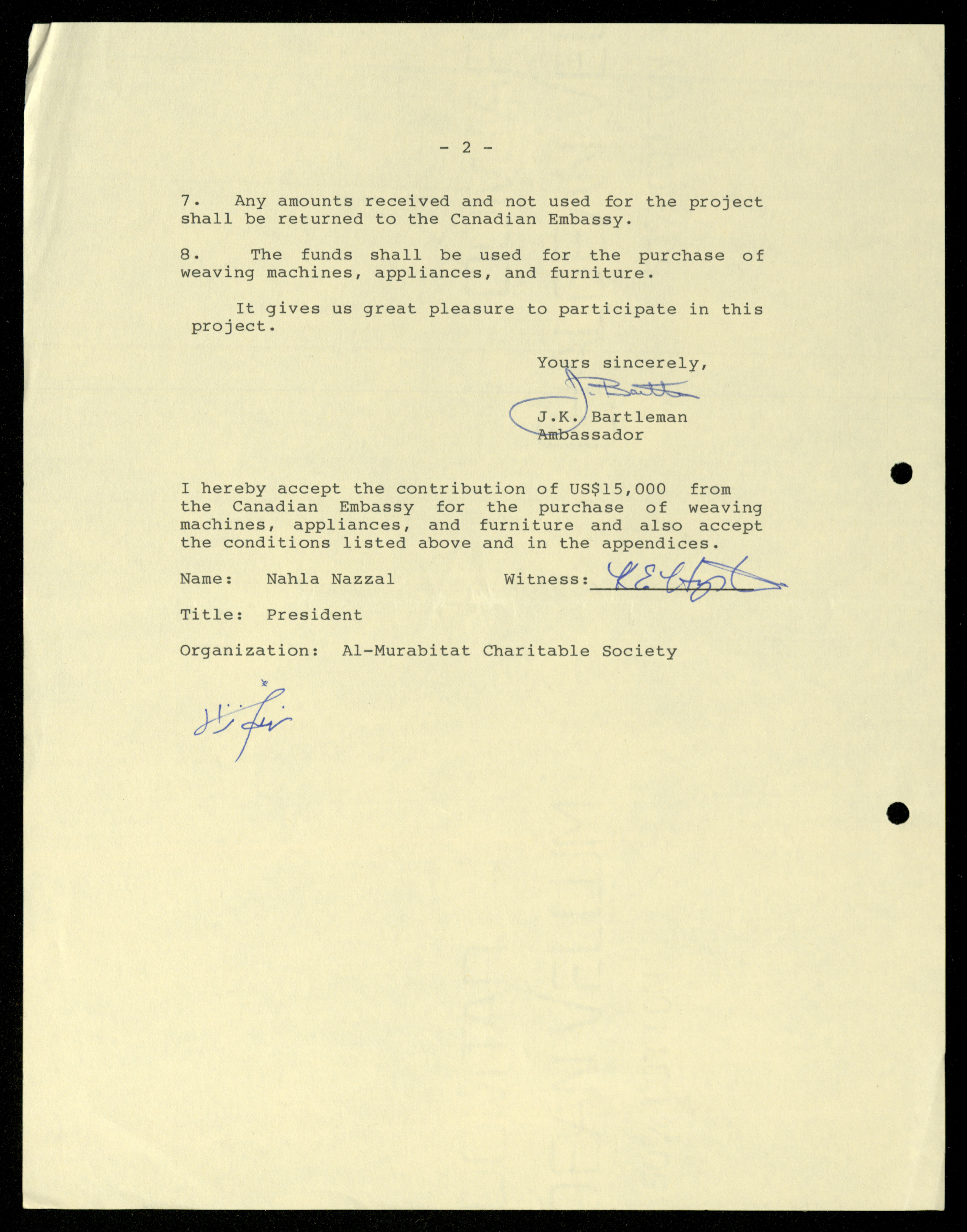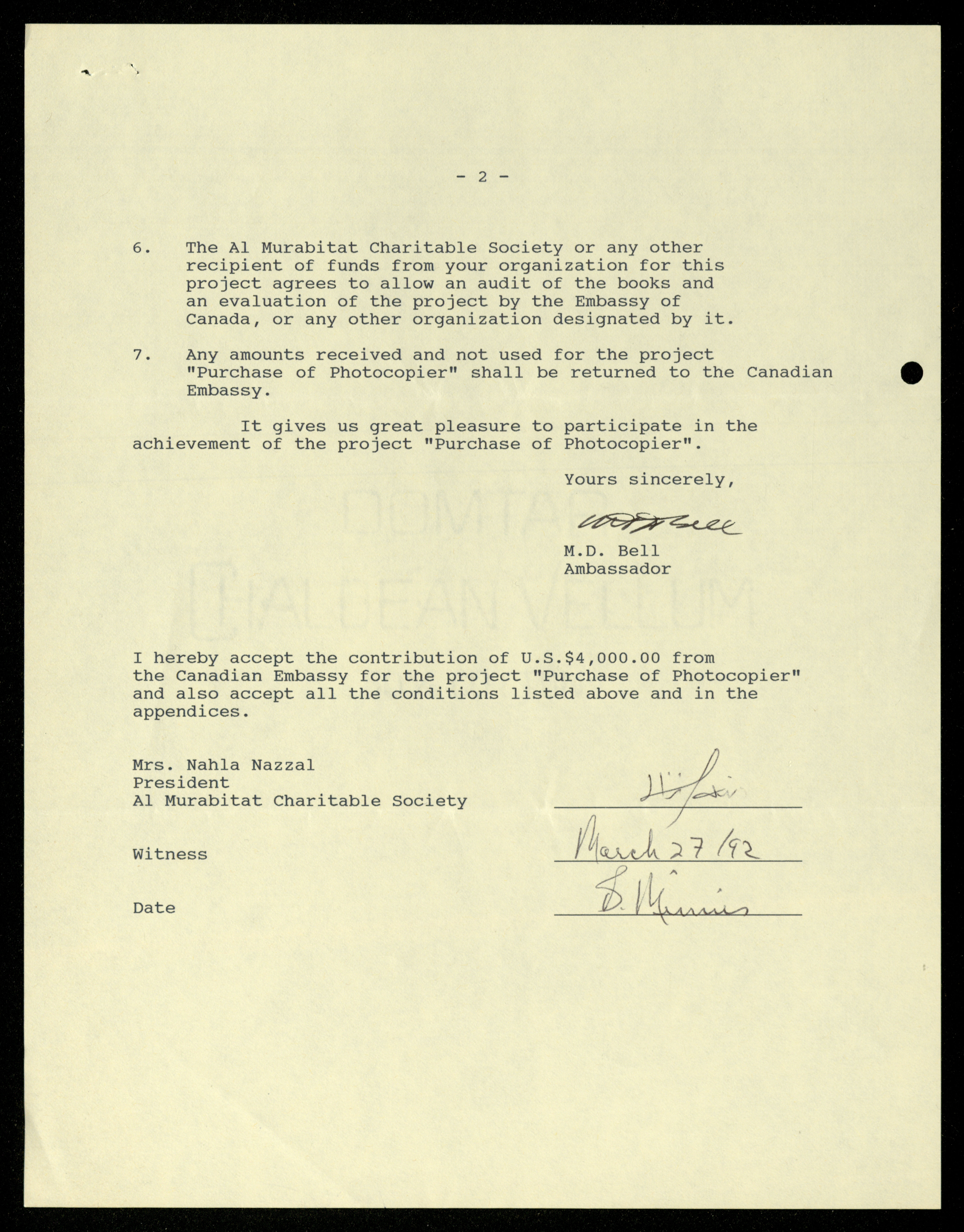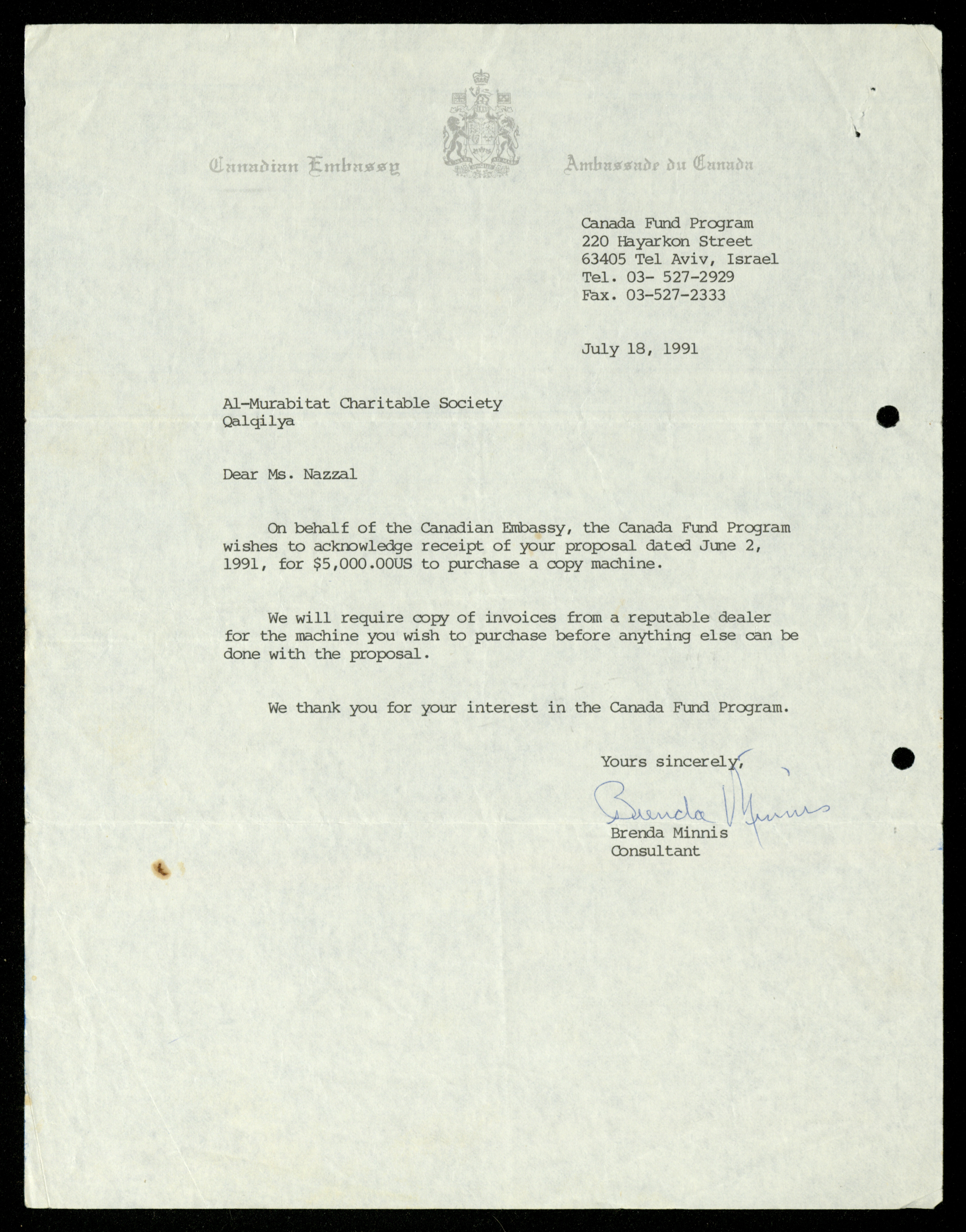 Dated from 1989 to 1992, this document shows the file of the Canadian Embassy in the al-Murabitat Charitable Society in Qalqilya, which contains 24 items, varied between Embassy and Society correspondence, cash checks, identification cards, financial receipts, notes related to the Embassy’s financing of some of the Society's needs.