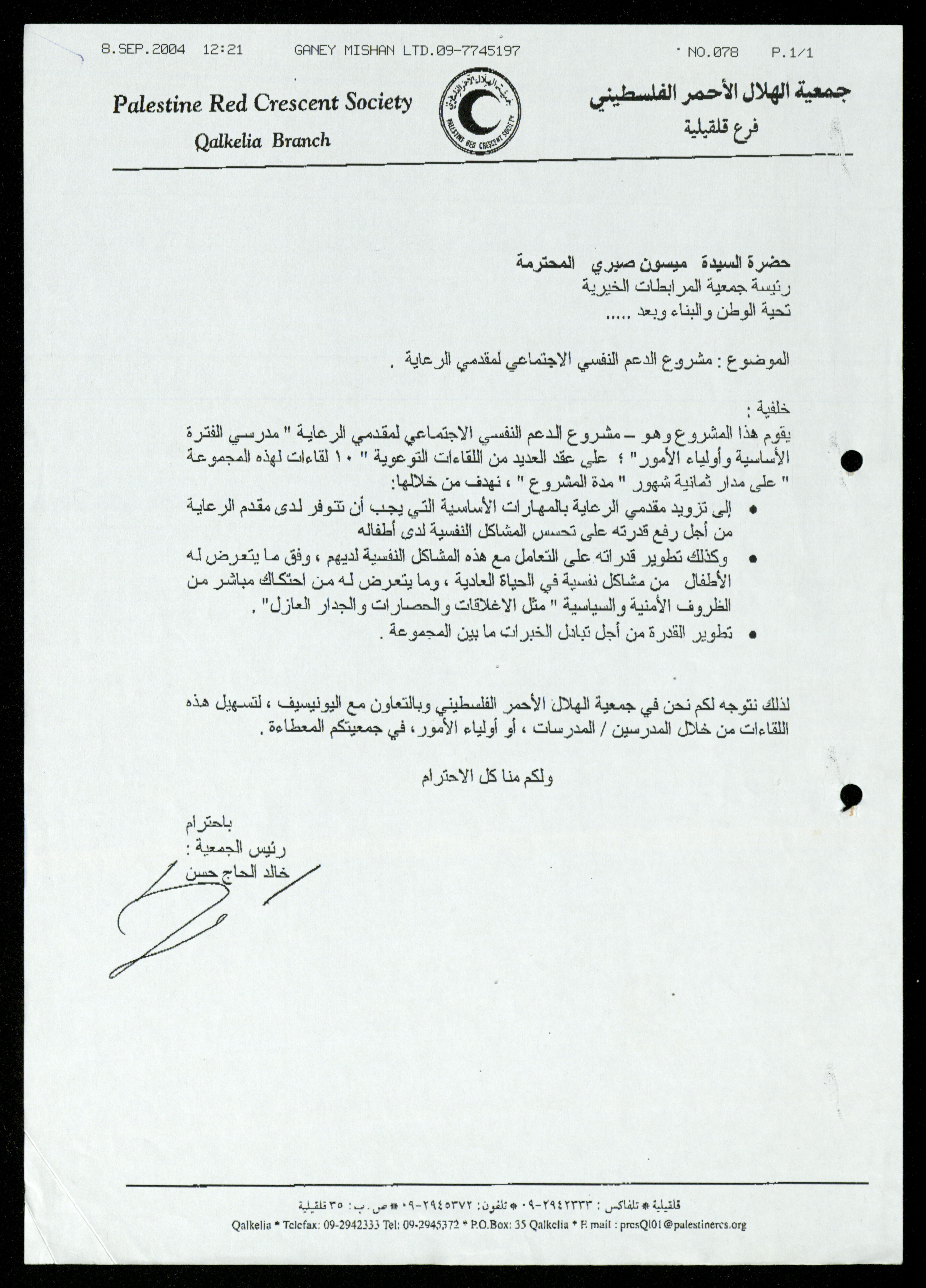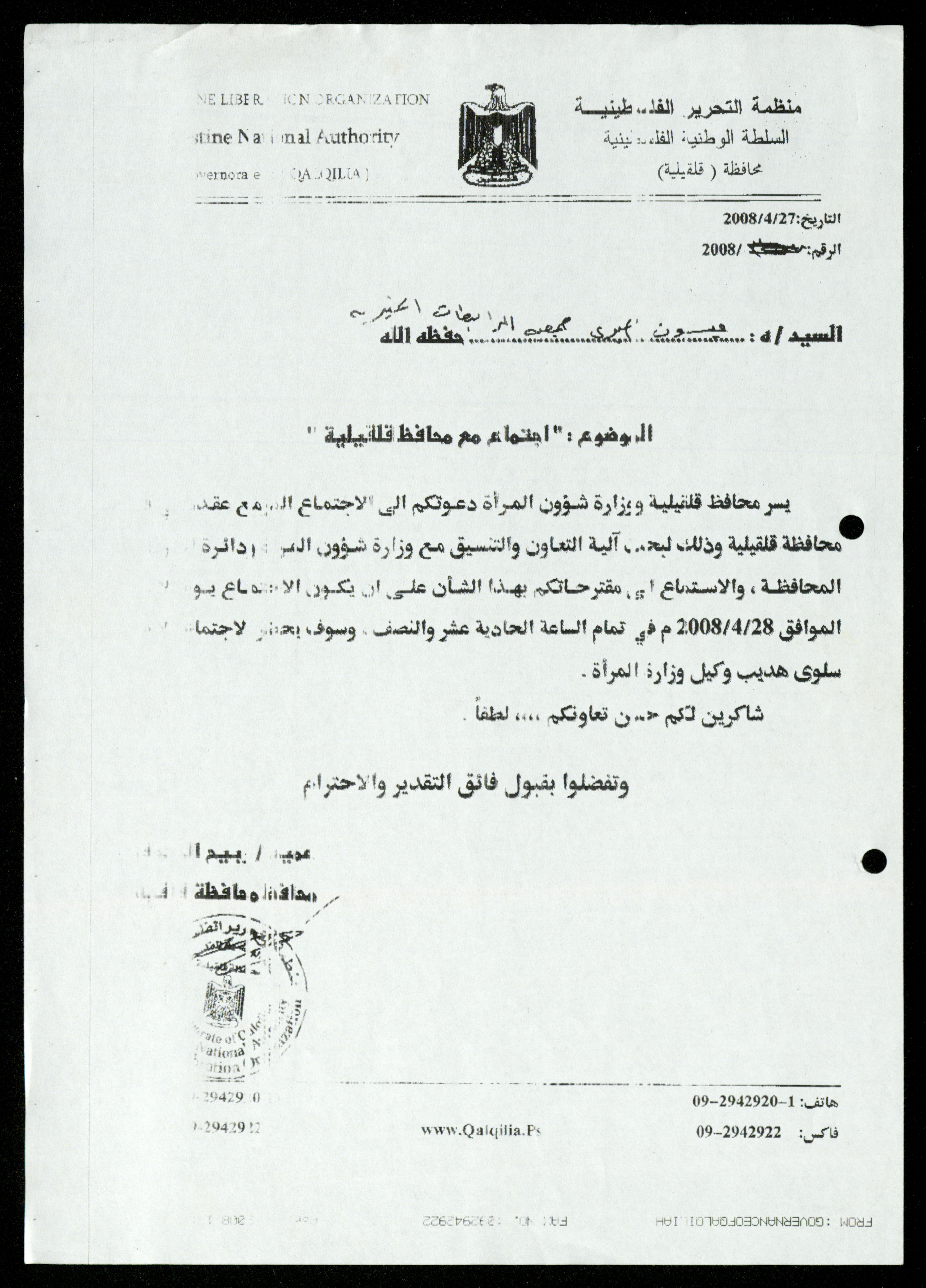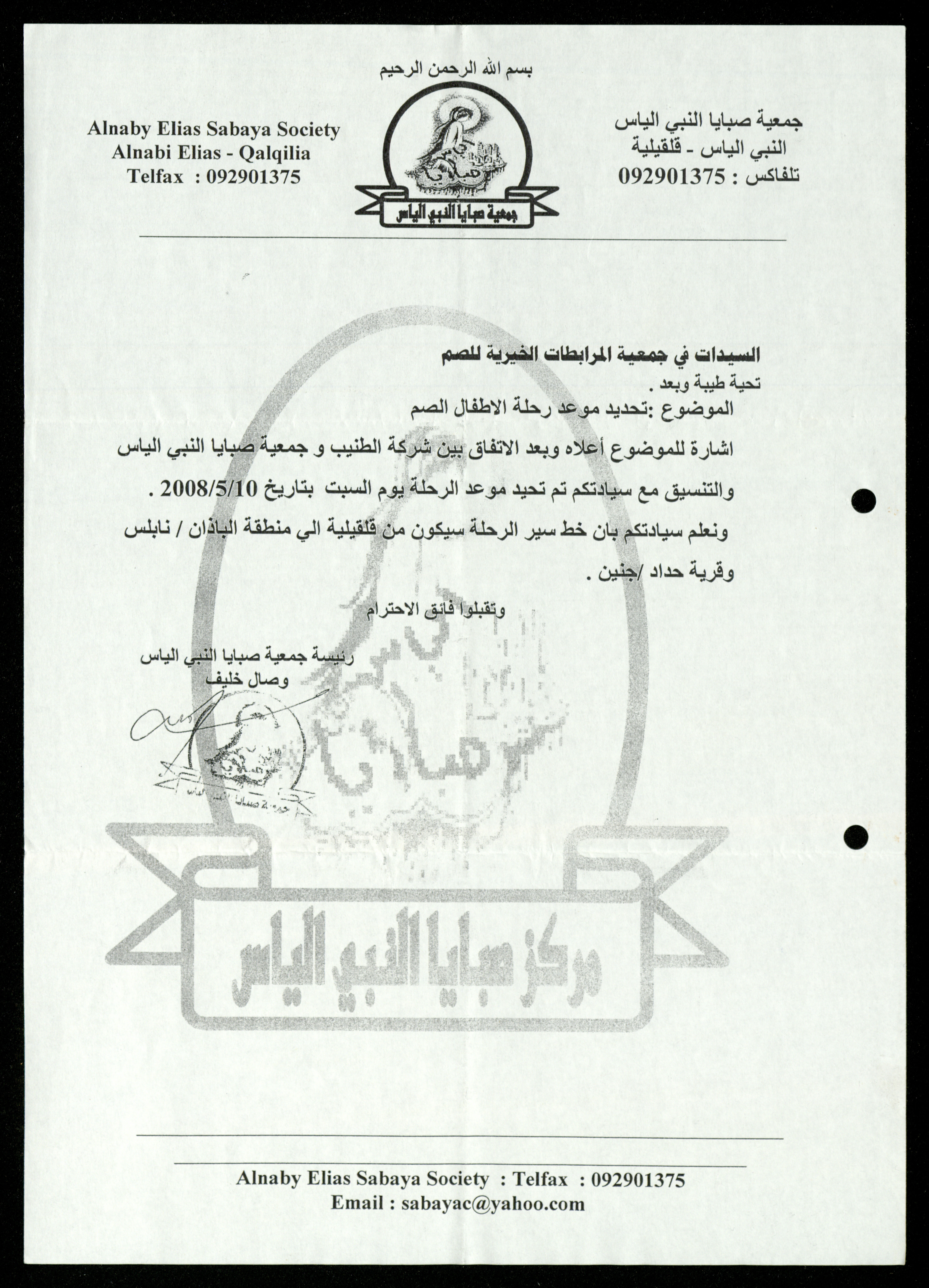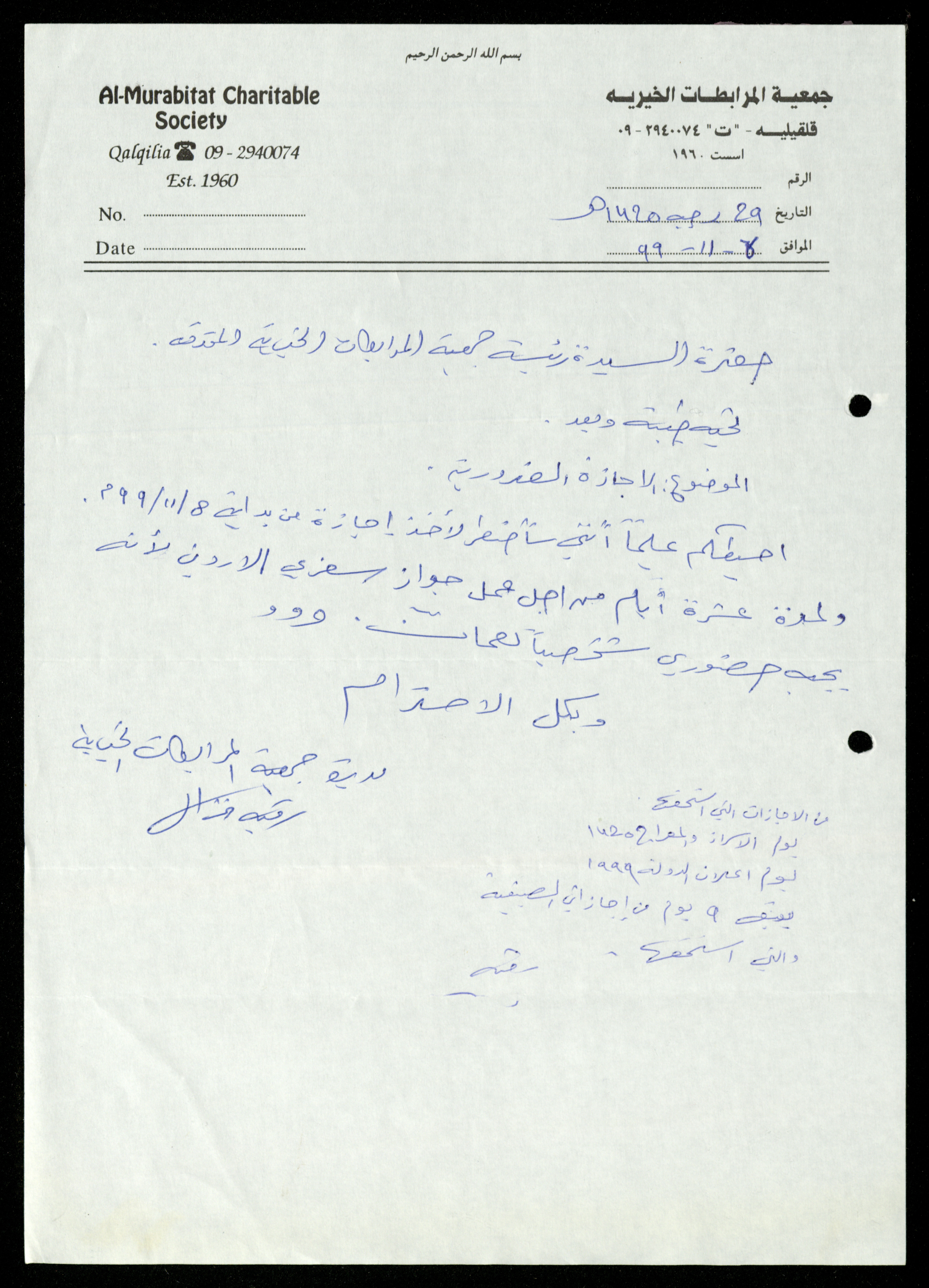 Correspondence File of al-Murabitat Charitable Society, Qalqilya, 1991-2008
