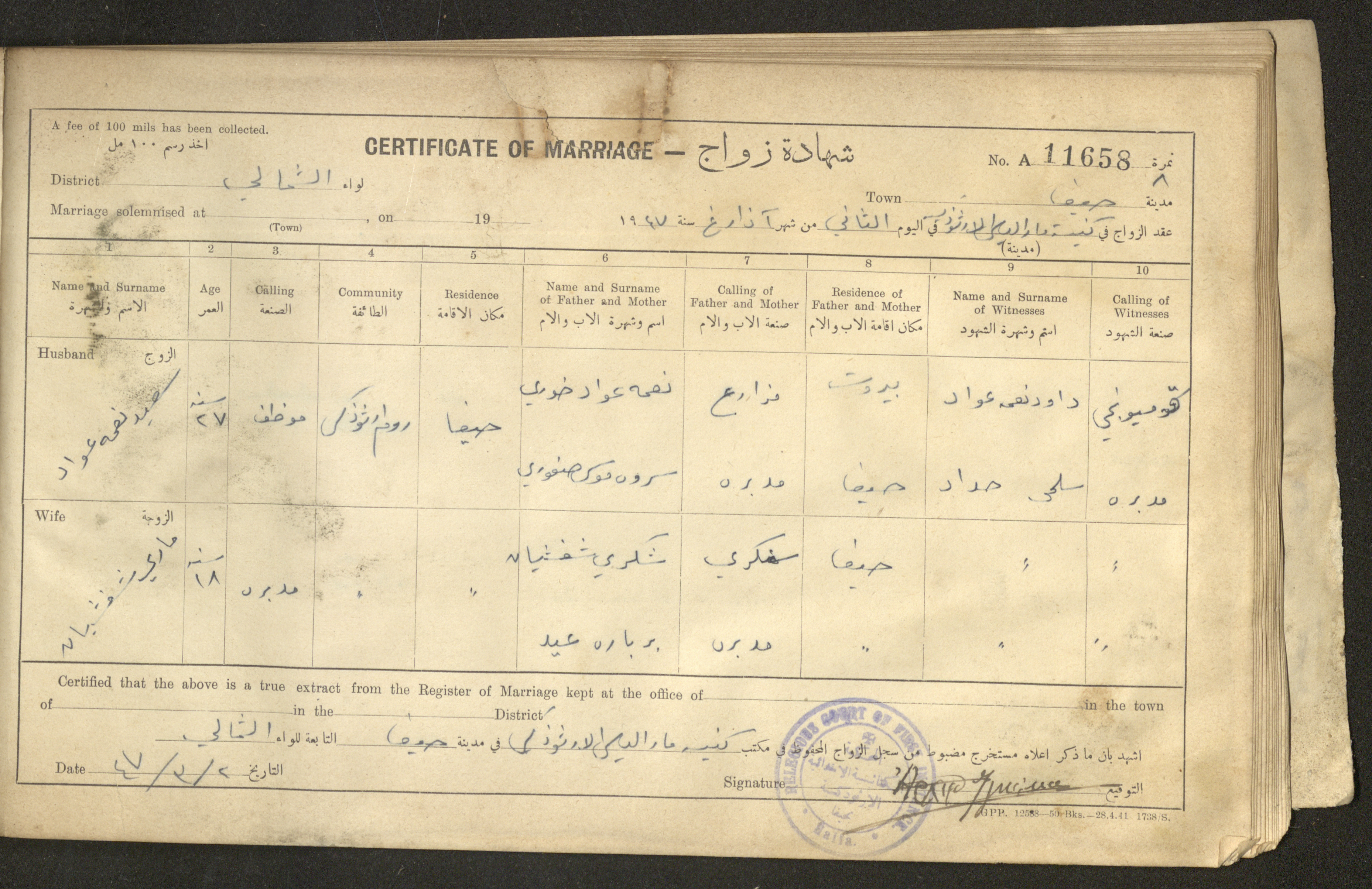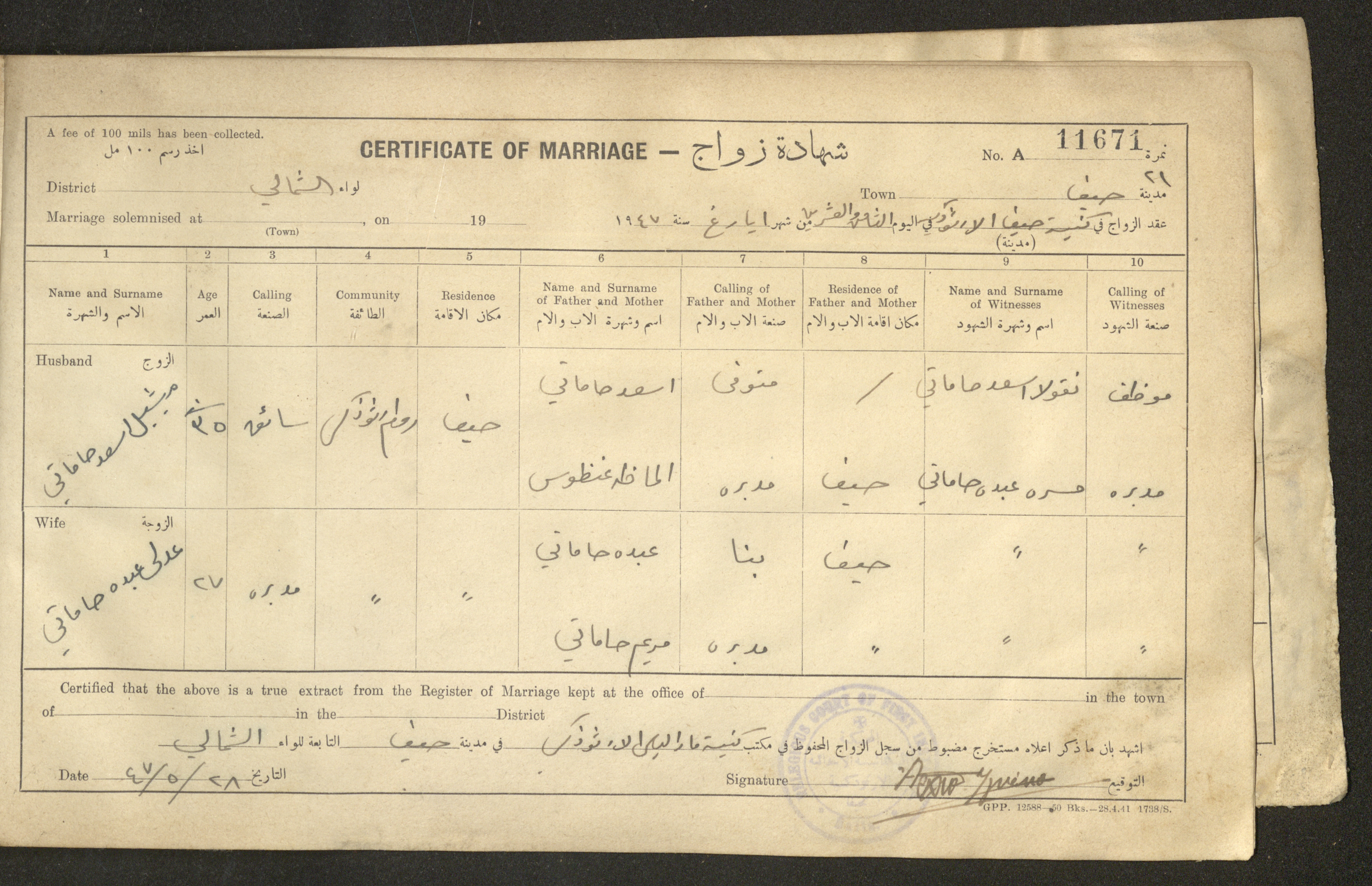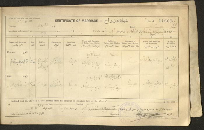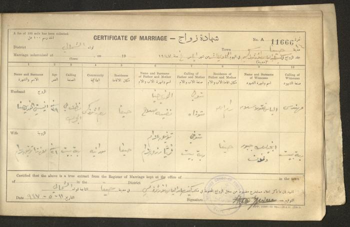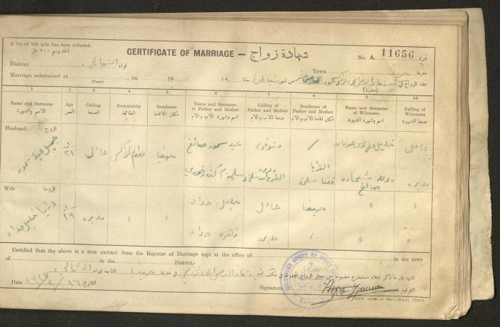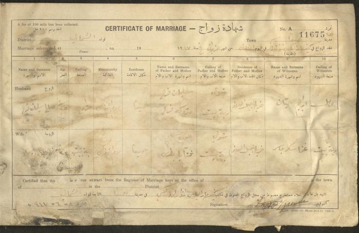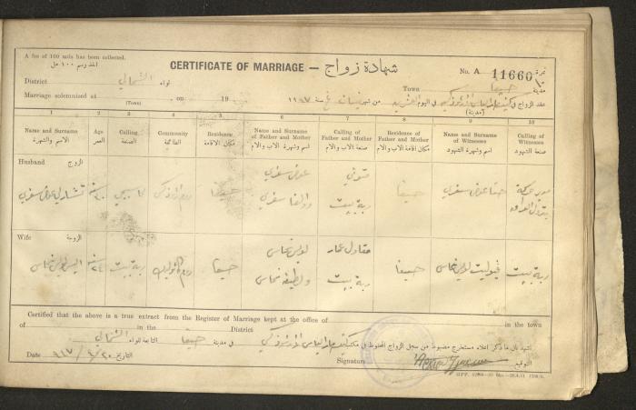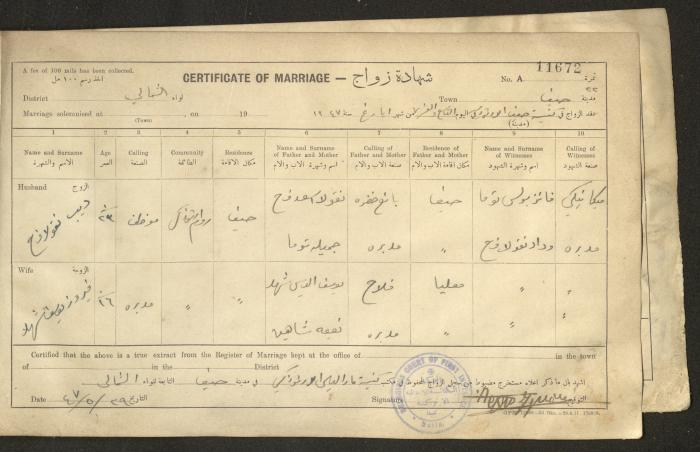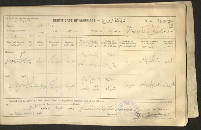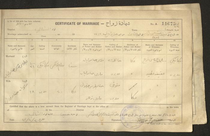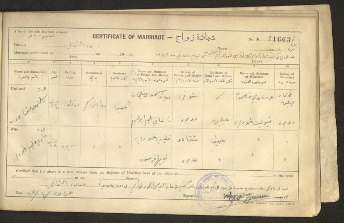 Issued in Arabic and English in 1947, this document shows a register containing certificates of marriages held at the Mar Elias Orthodox Church in Haifa. Each certificate documents the name and surname of the husband, their age, sect and residence, in addition to information about their parents and the witnesses.
