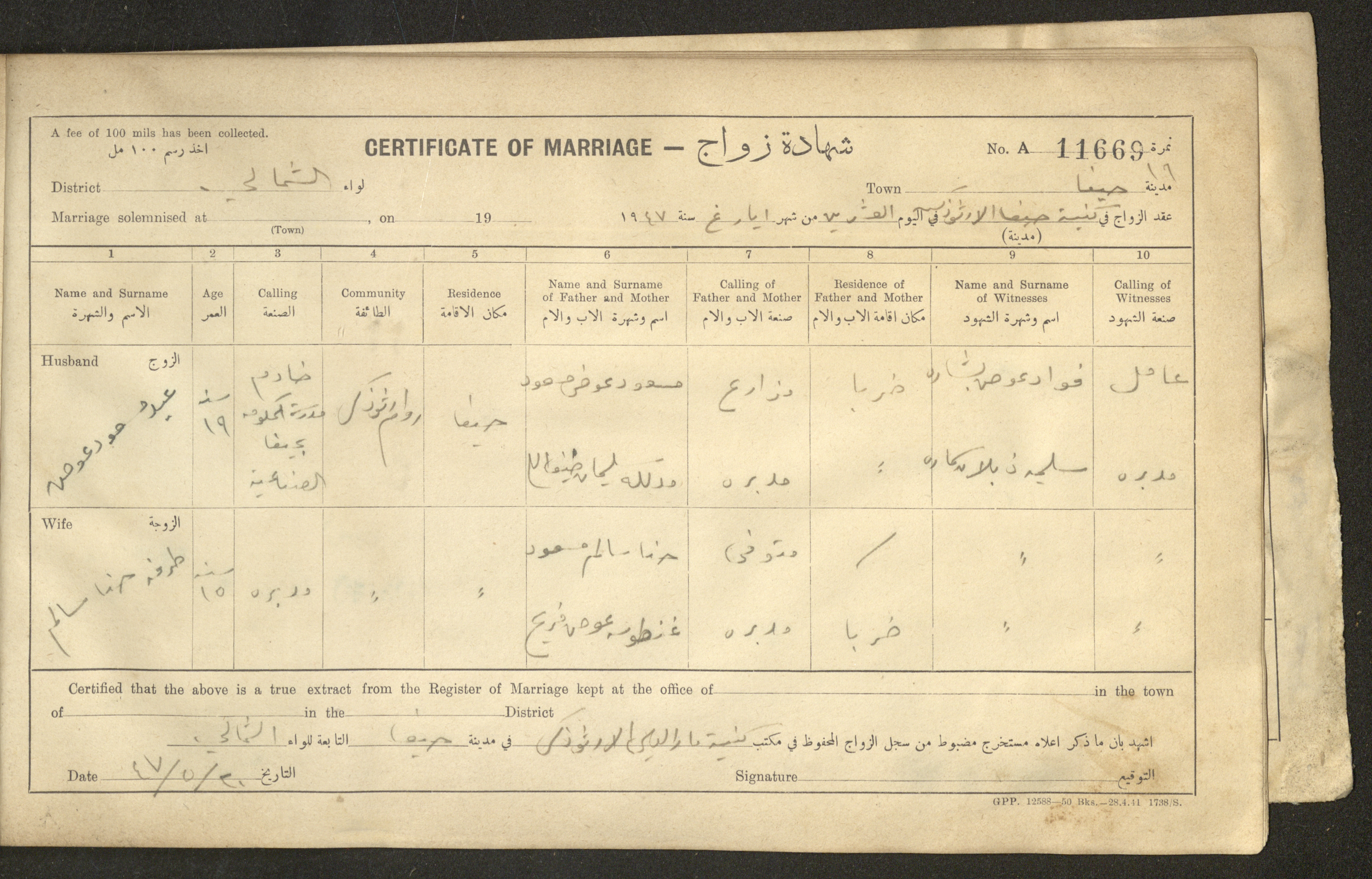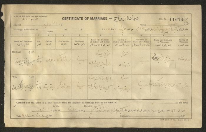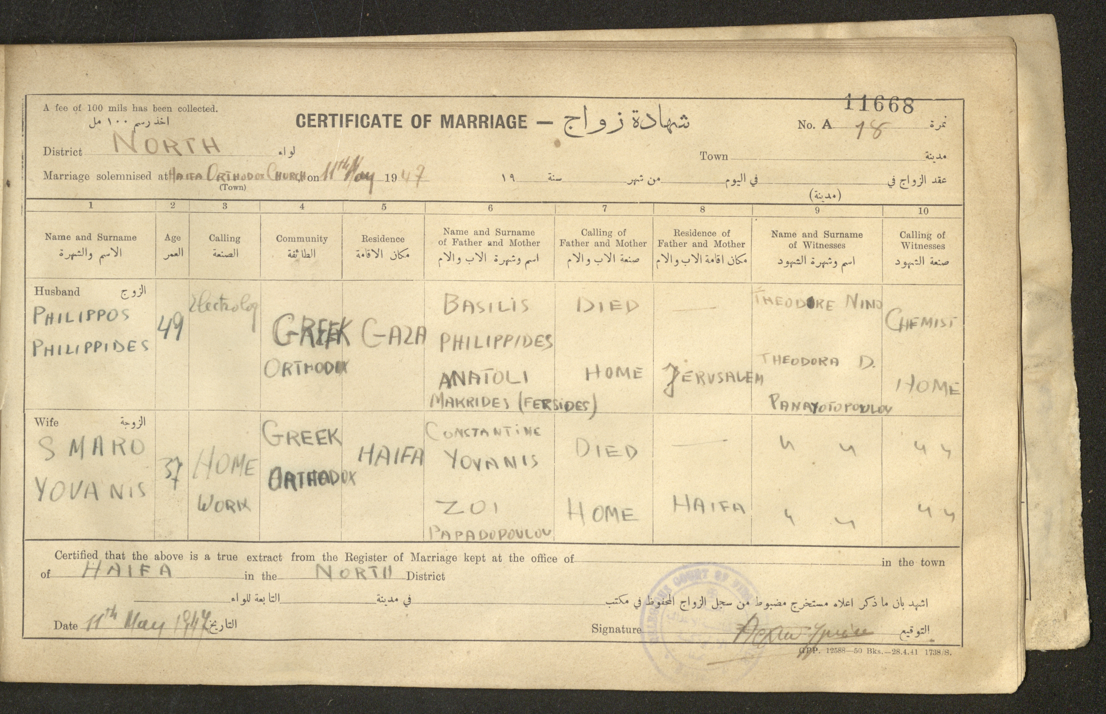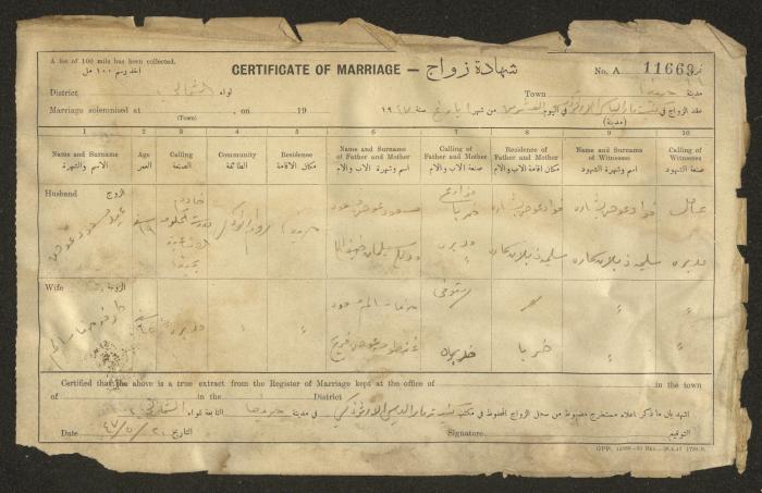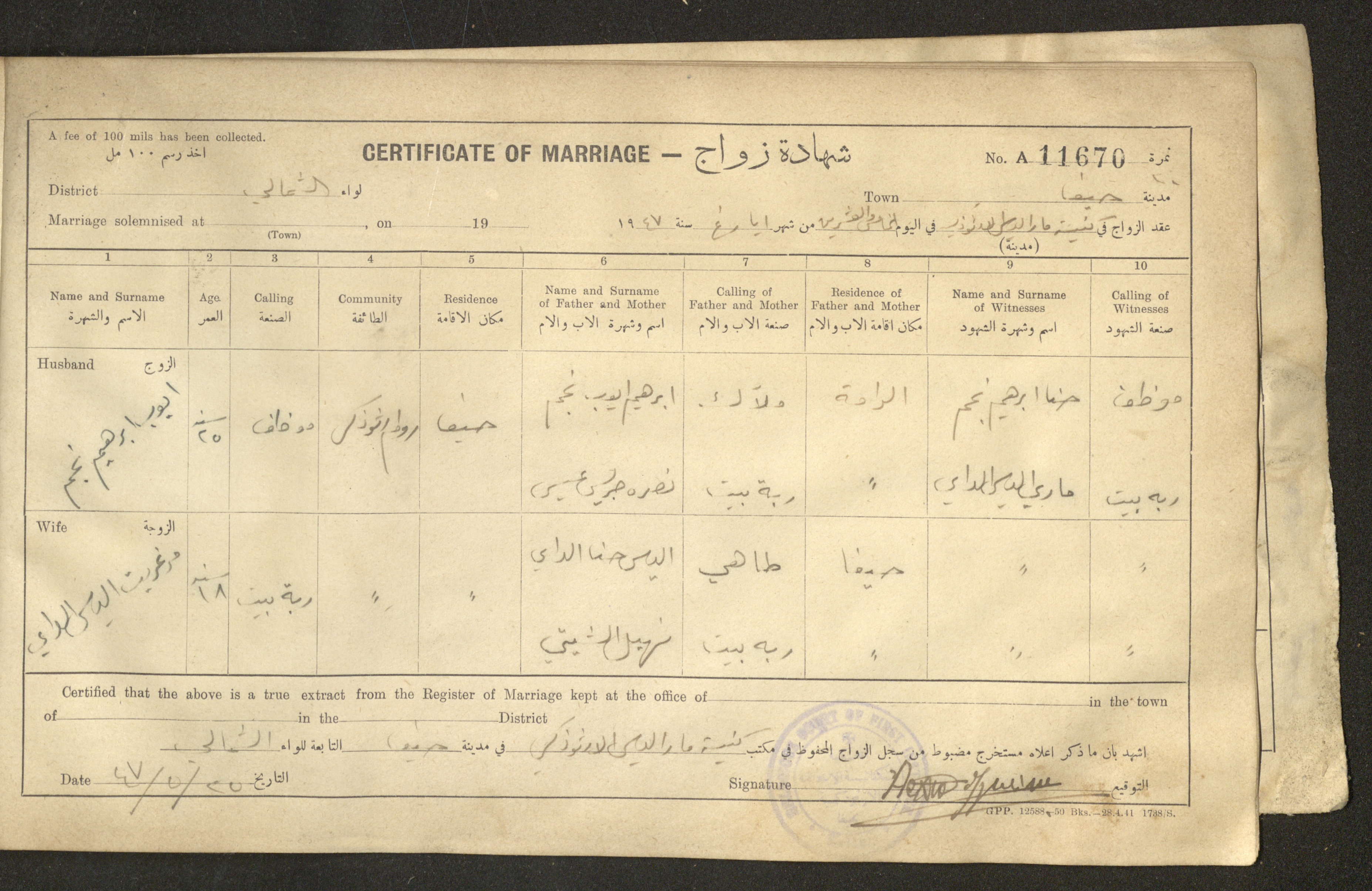 Issued in Arabic and English in 1947, this document shows a register containing certificates of marriages held at the Mar Elias Orthodox Church in Haifa. Each certificate documents the name and surname of the husband, their age, sect and residence, in addition to information about their parents and the witnesses.
