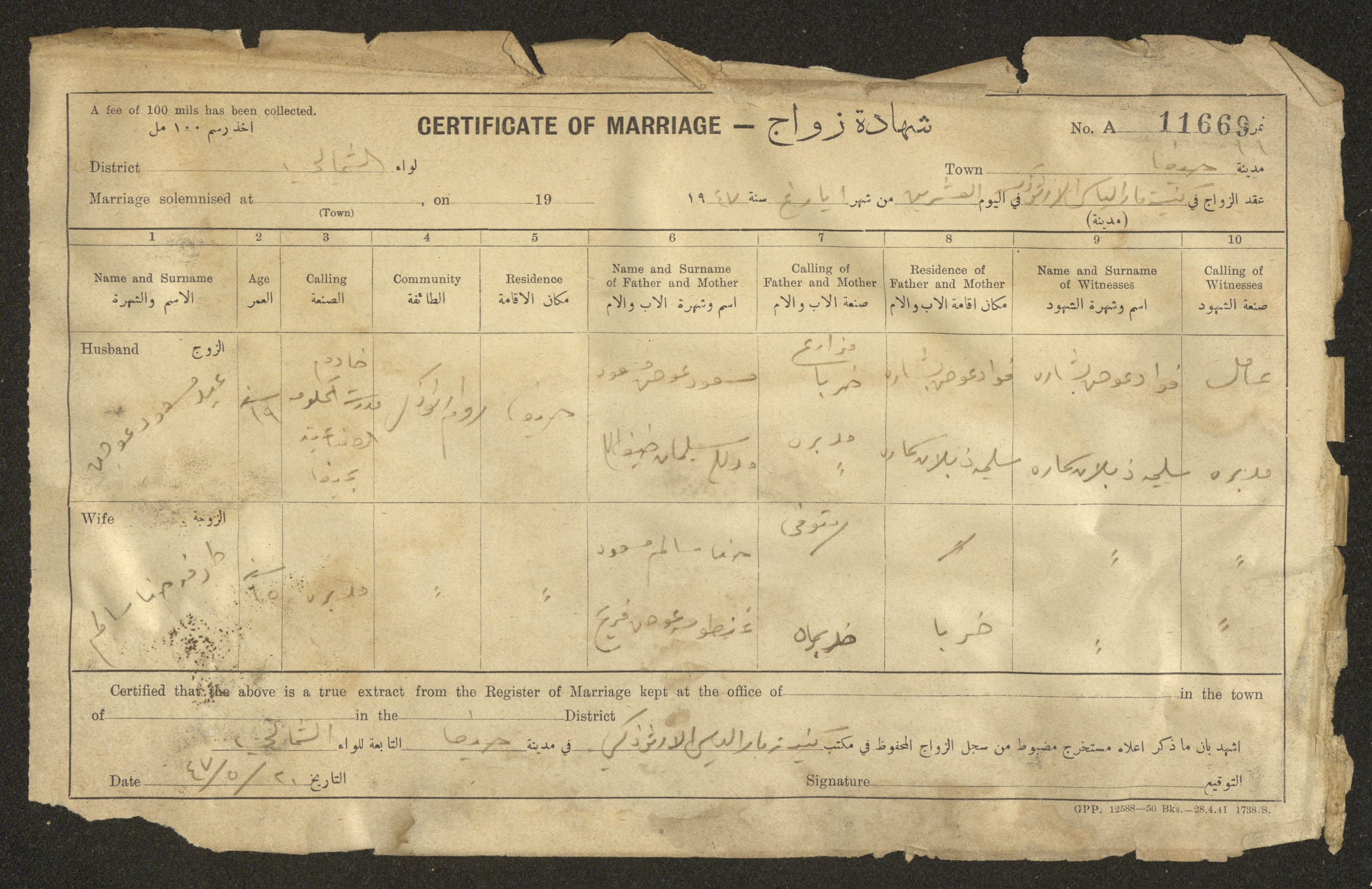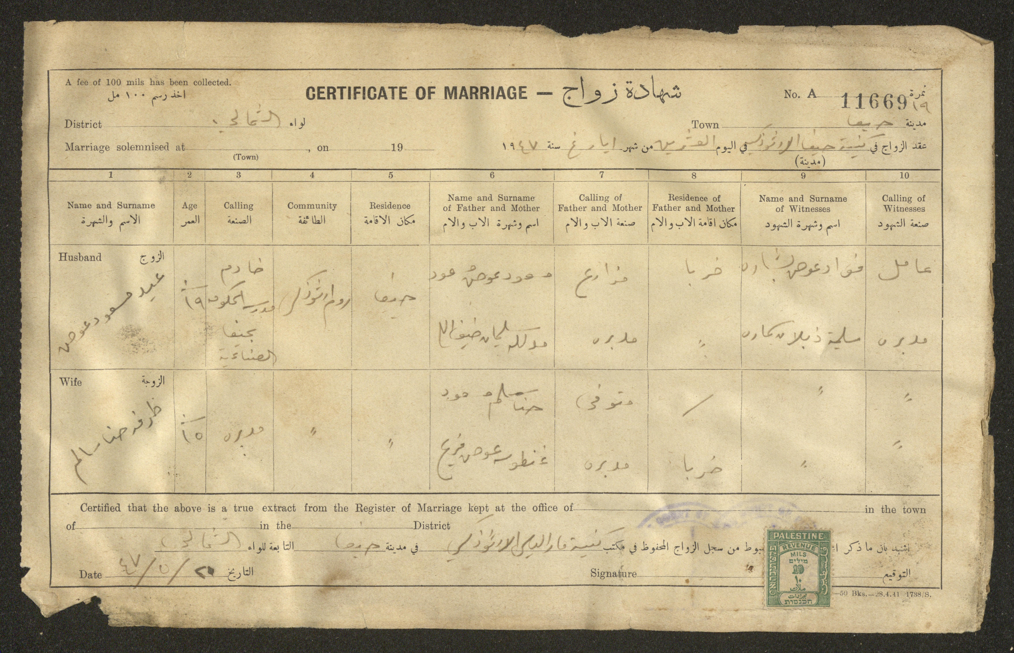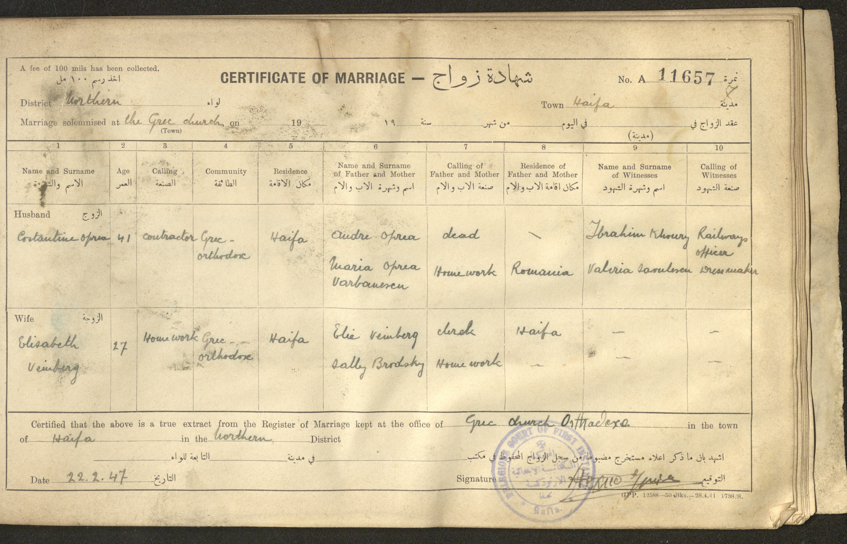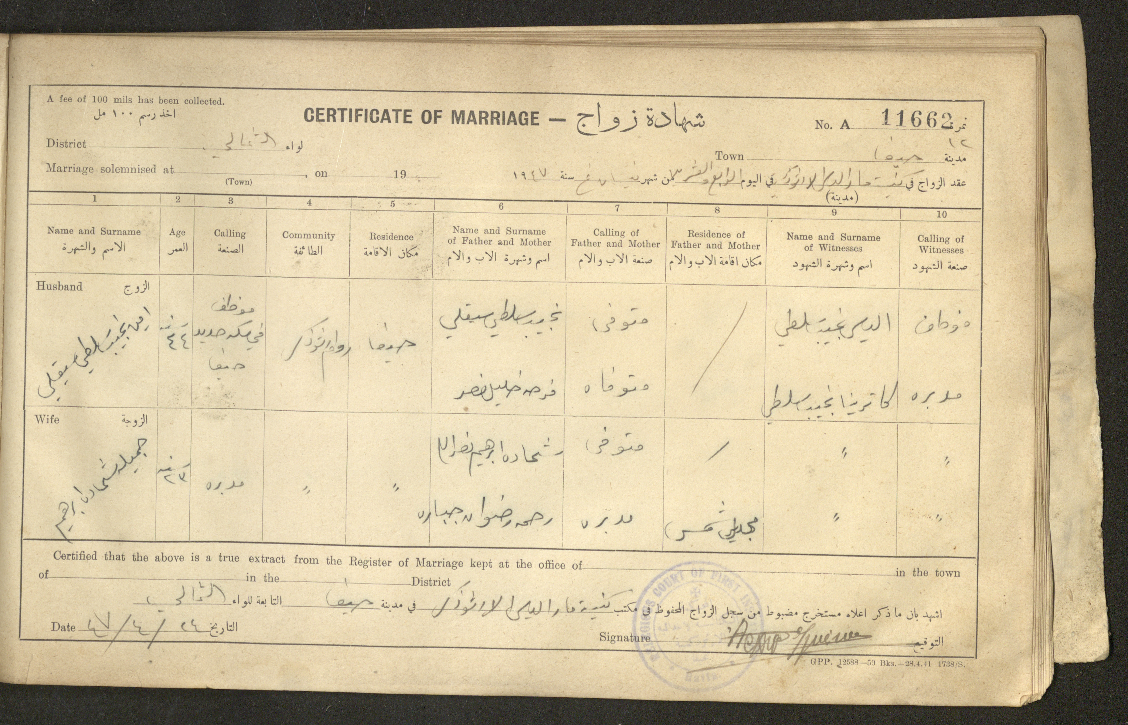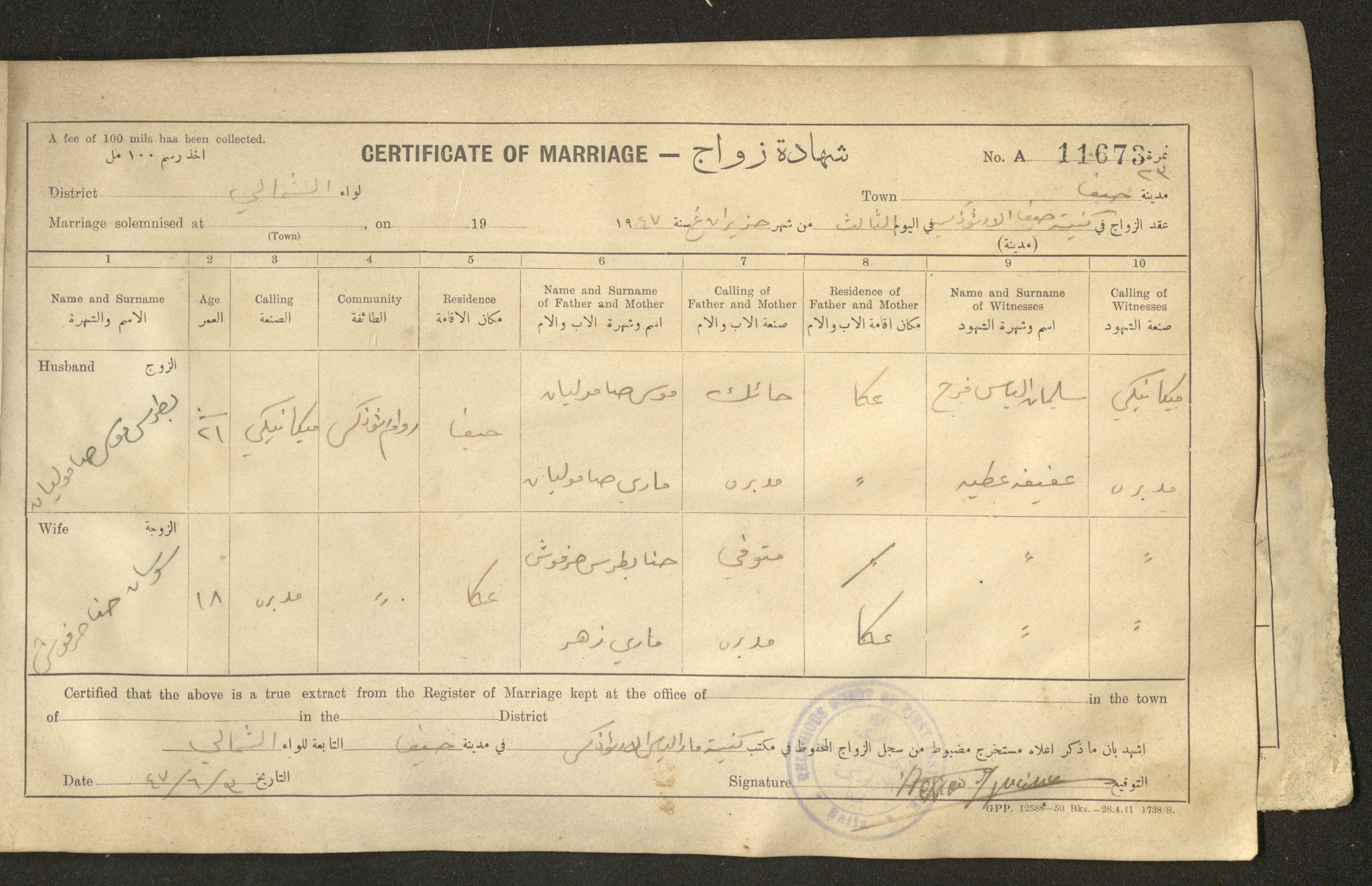 Issued in Arabic and English in 1947, this document shows a register containing certificates of marriages held at the Mar Elias Orthodox Church in Haifa. Each certificate documents the name and surname of the husband, their age, sect and residence, in addition to information about their parents and the witnesses.
