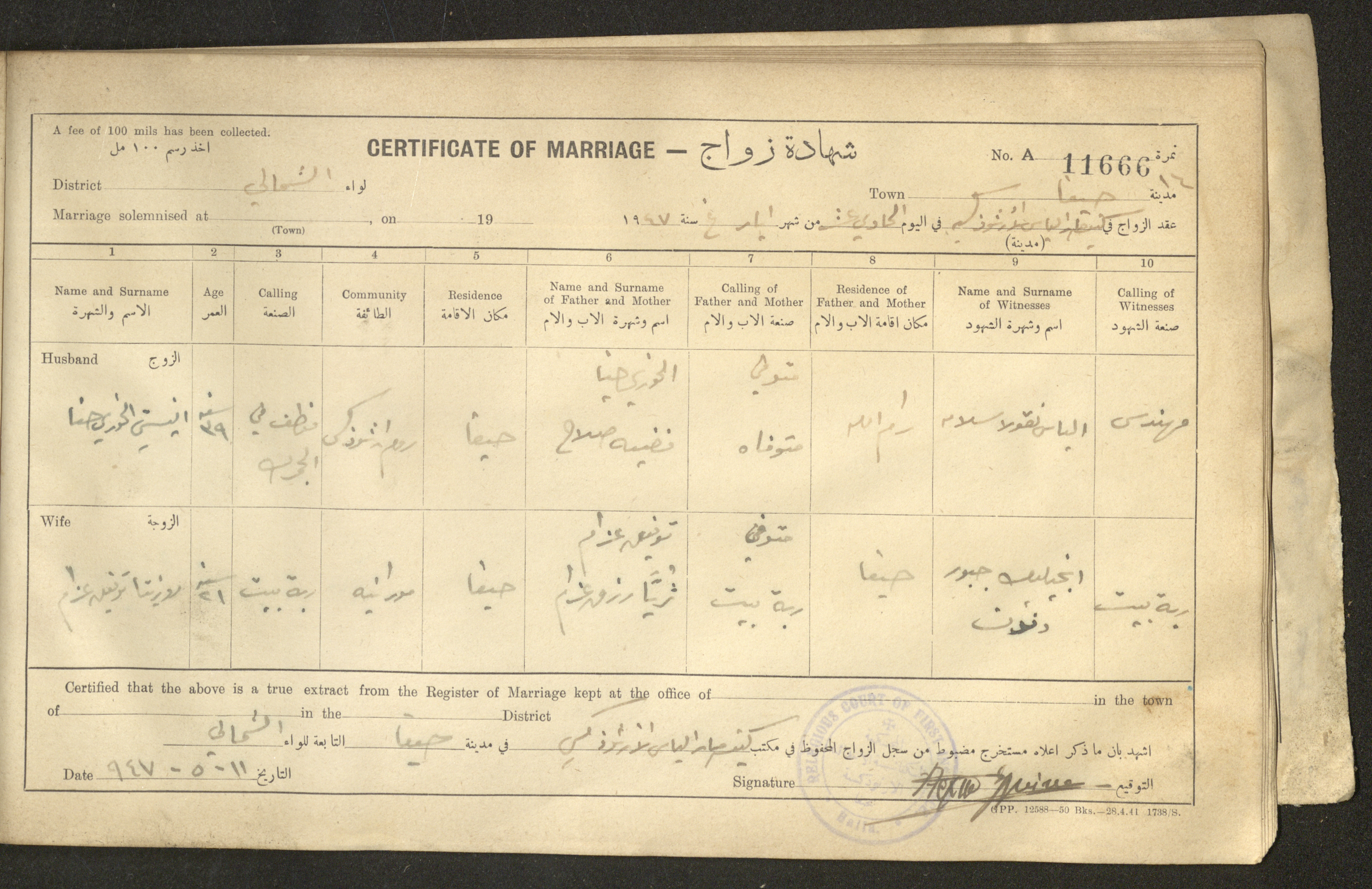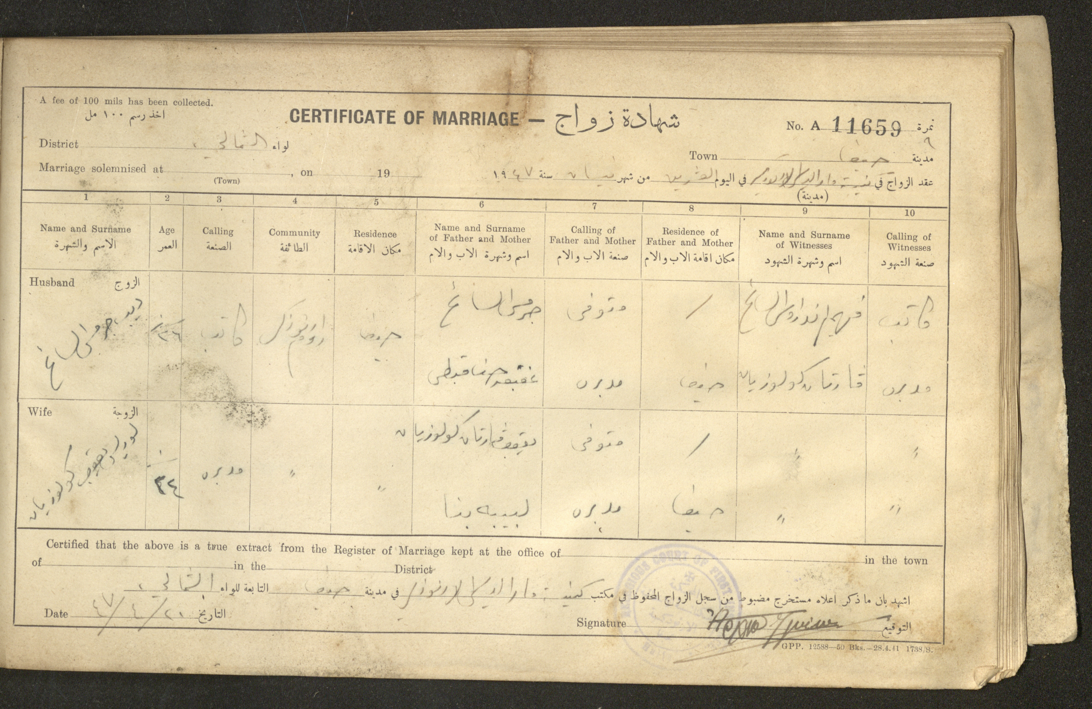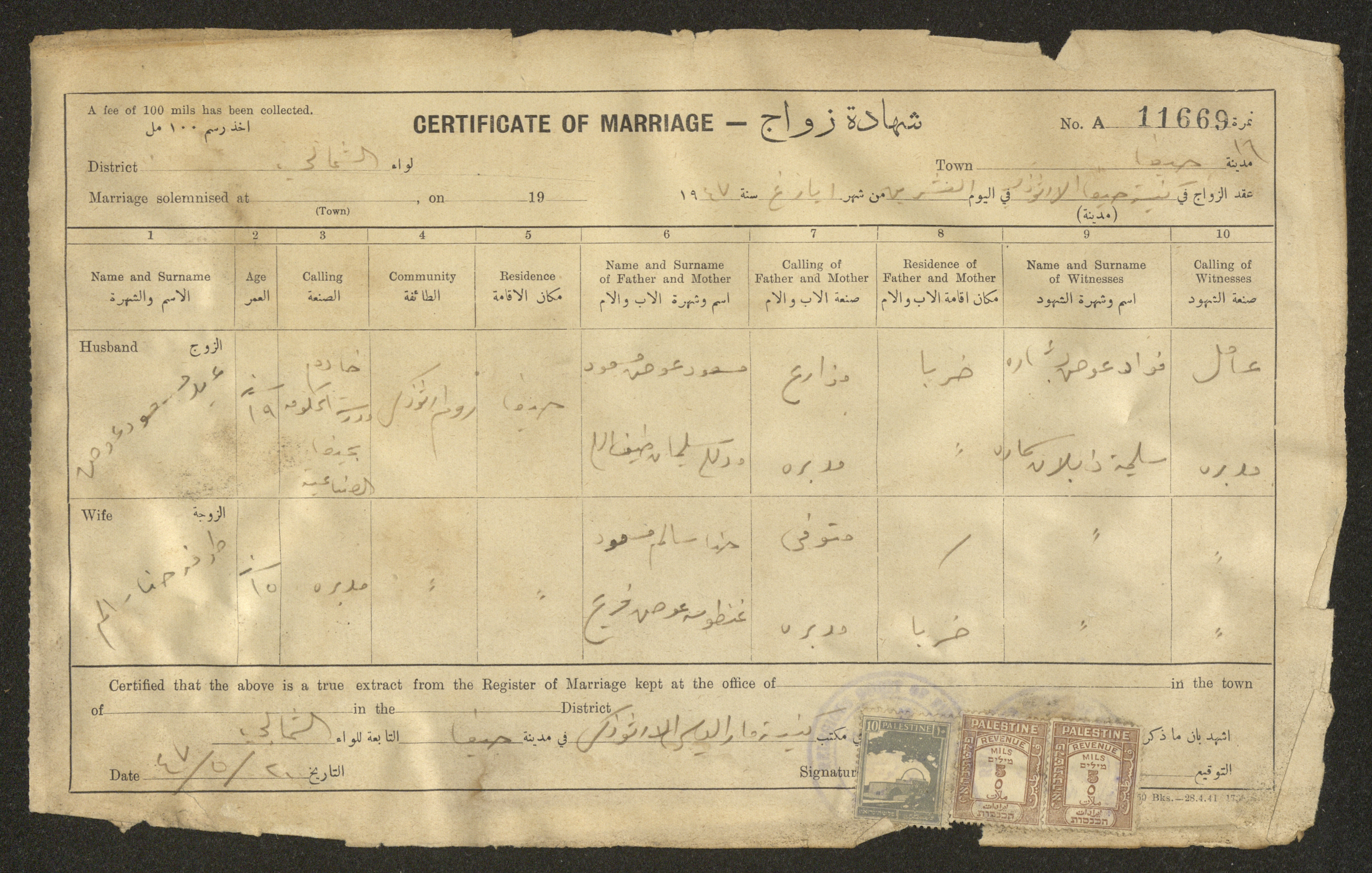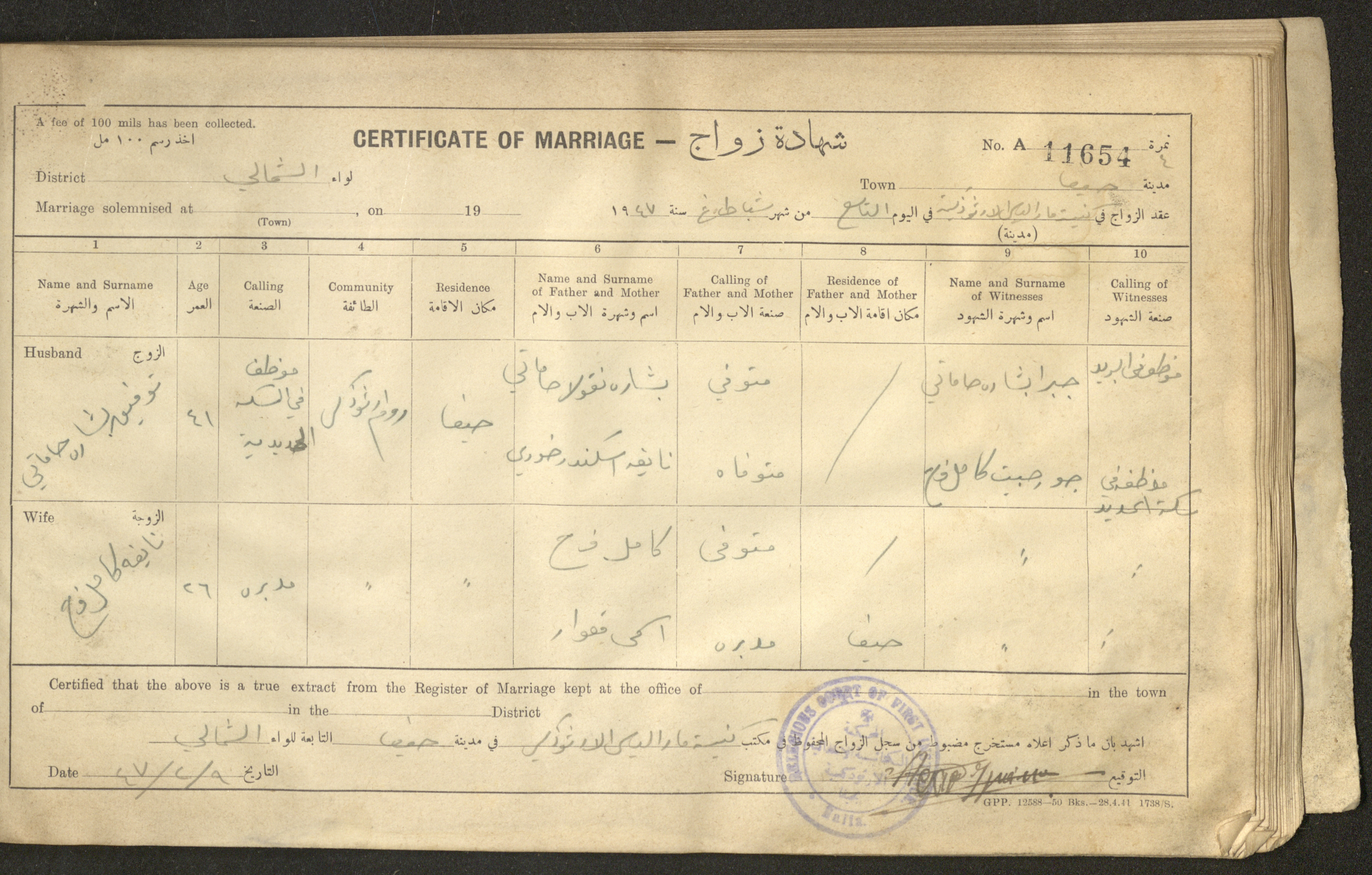 Issued in Arabic and English in 1947, this document shows a register containing certificates of marriages held at the Mar Elias Orthodox Church in Haifa. Each certificate documents the name and surname of the husband, their age, sect and residence, in addition to information about their parents and the witnesses.