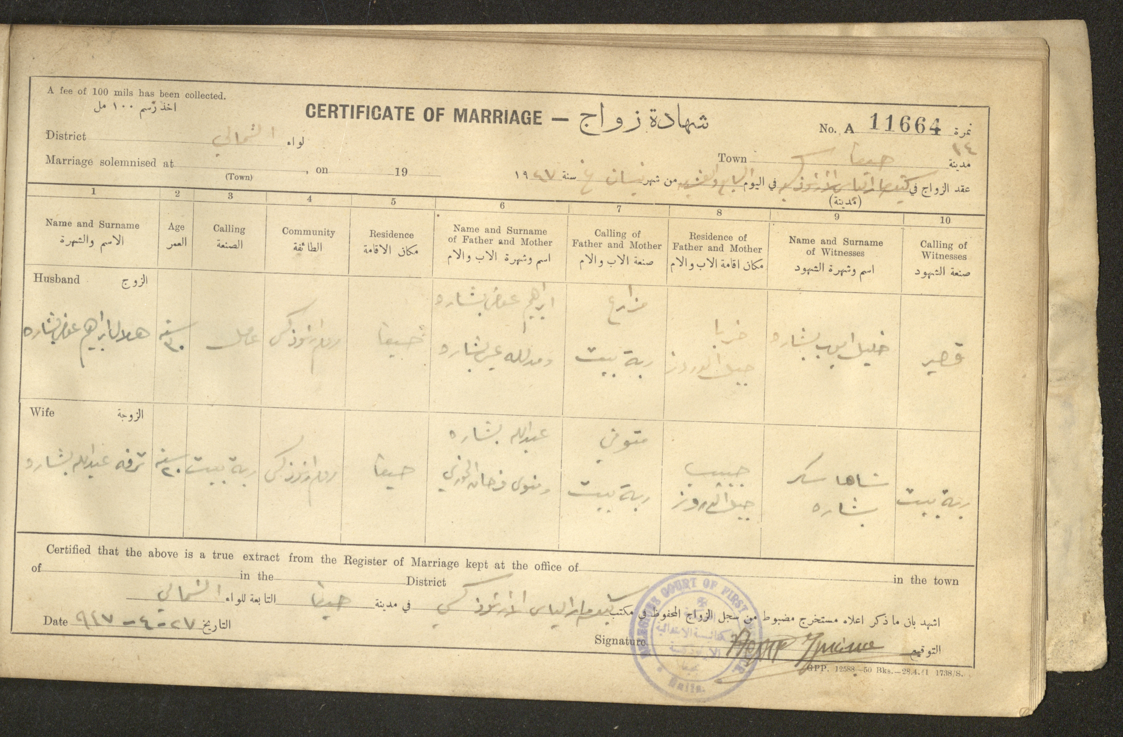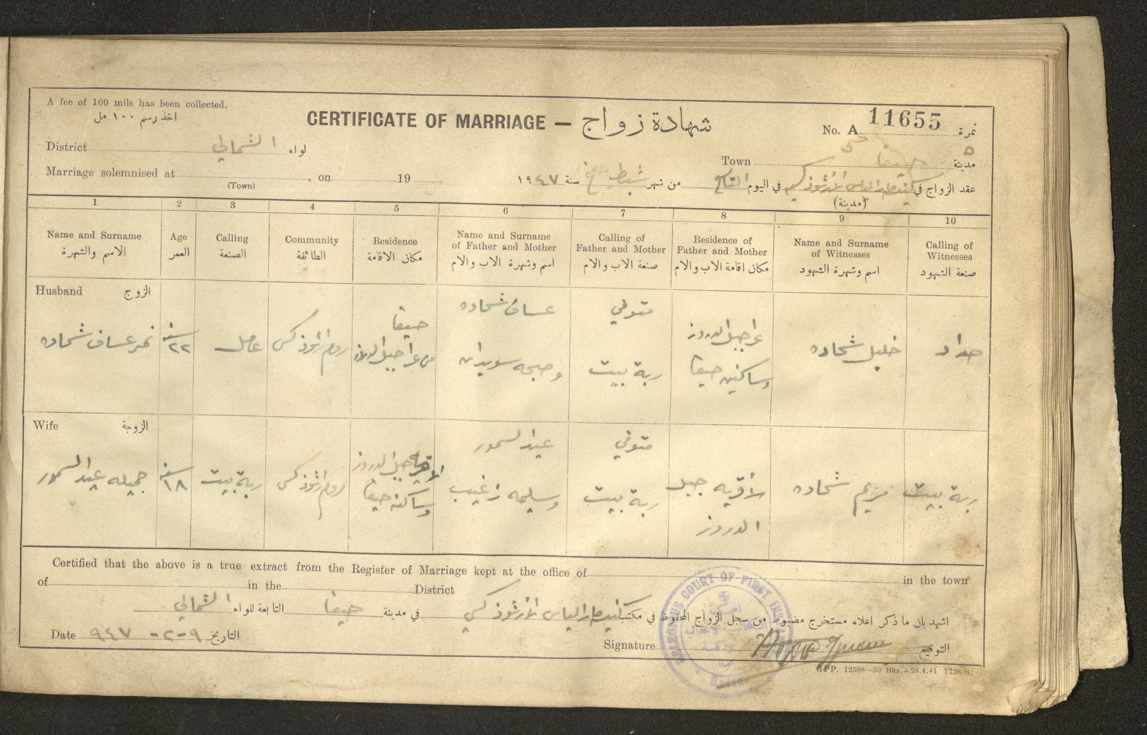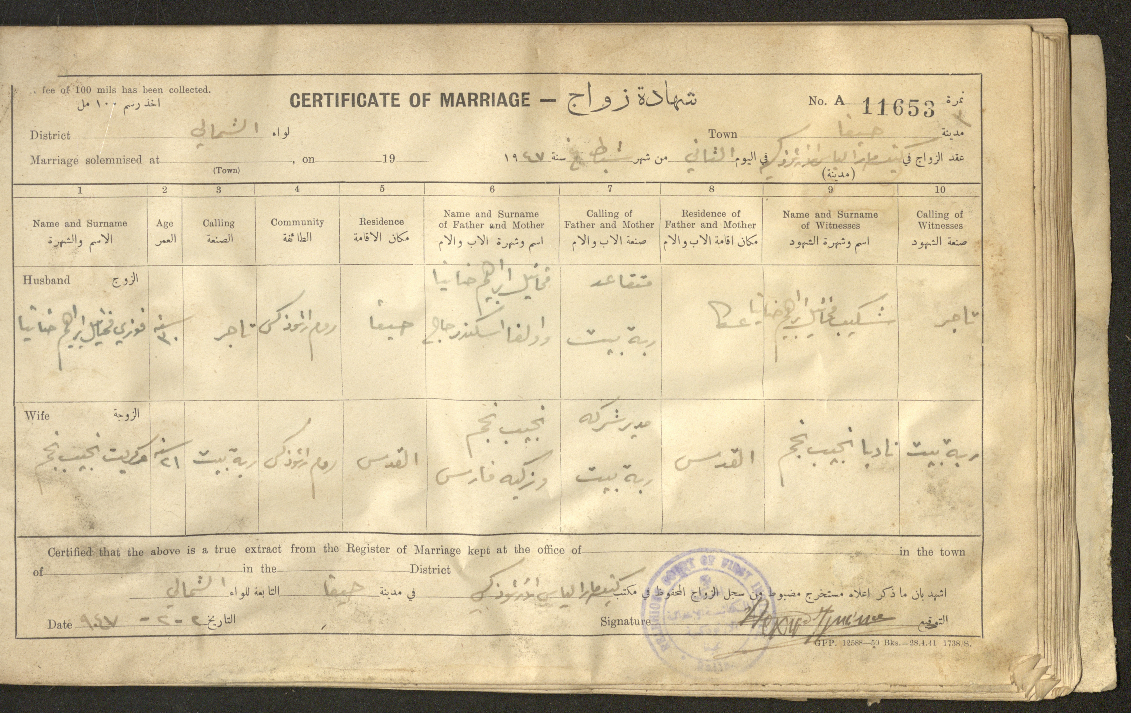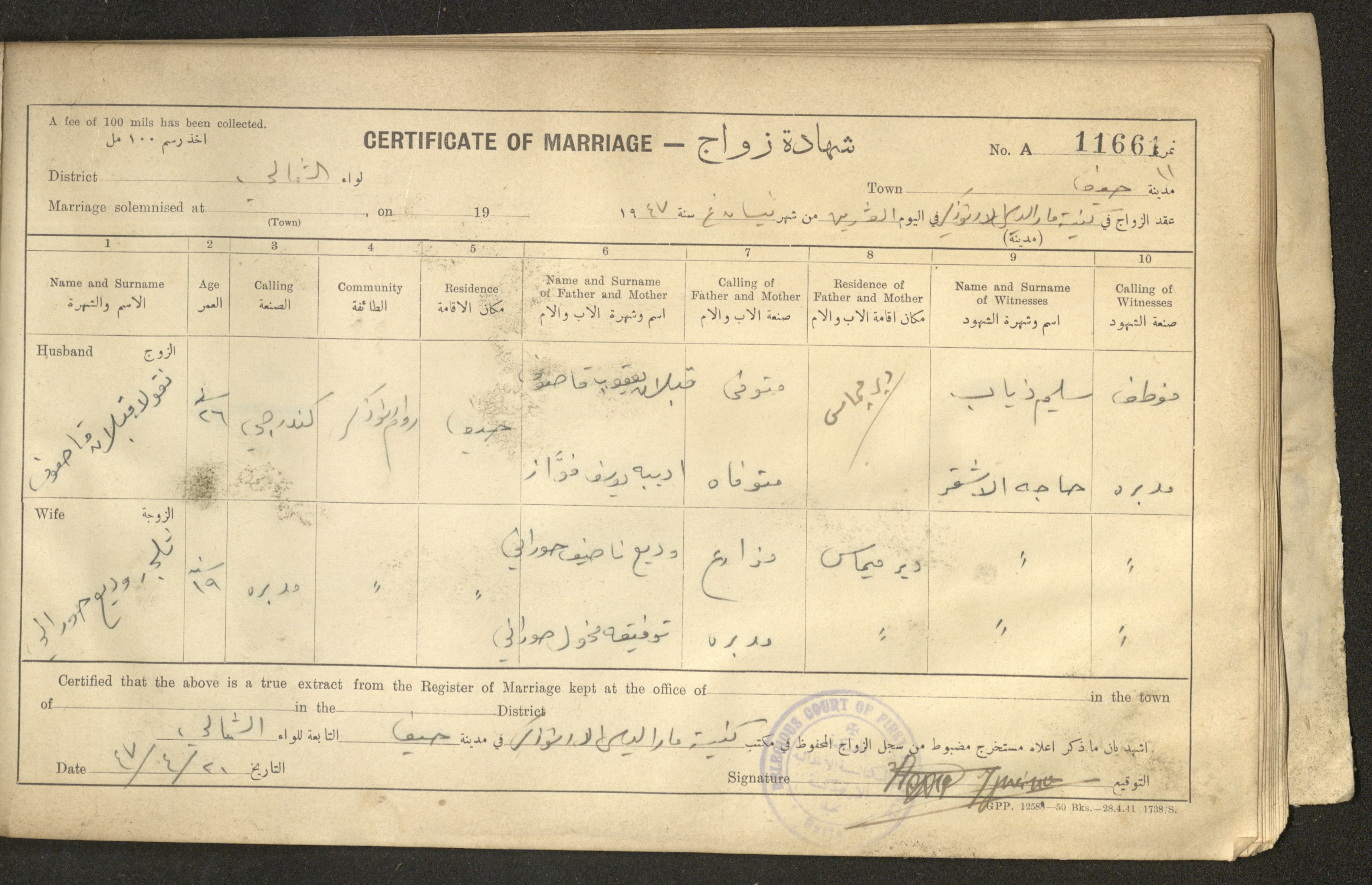 Issued in Arabic and English in 1947, this document shows a register containing certificates of marriages held at the Mar Elias Orthodox Church in Haifa. Each certificate documents the name and surname of the husband, their age, sect and residence, in addition to information about their parents and the witnesses.