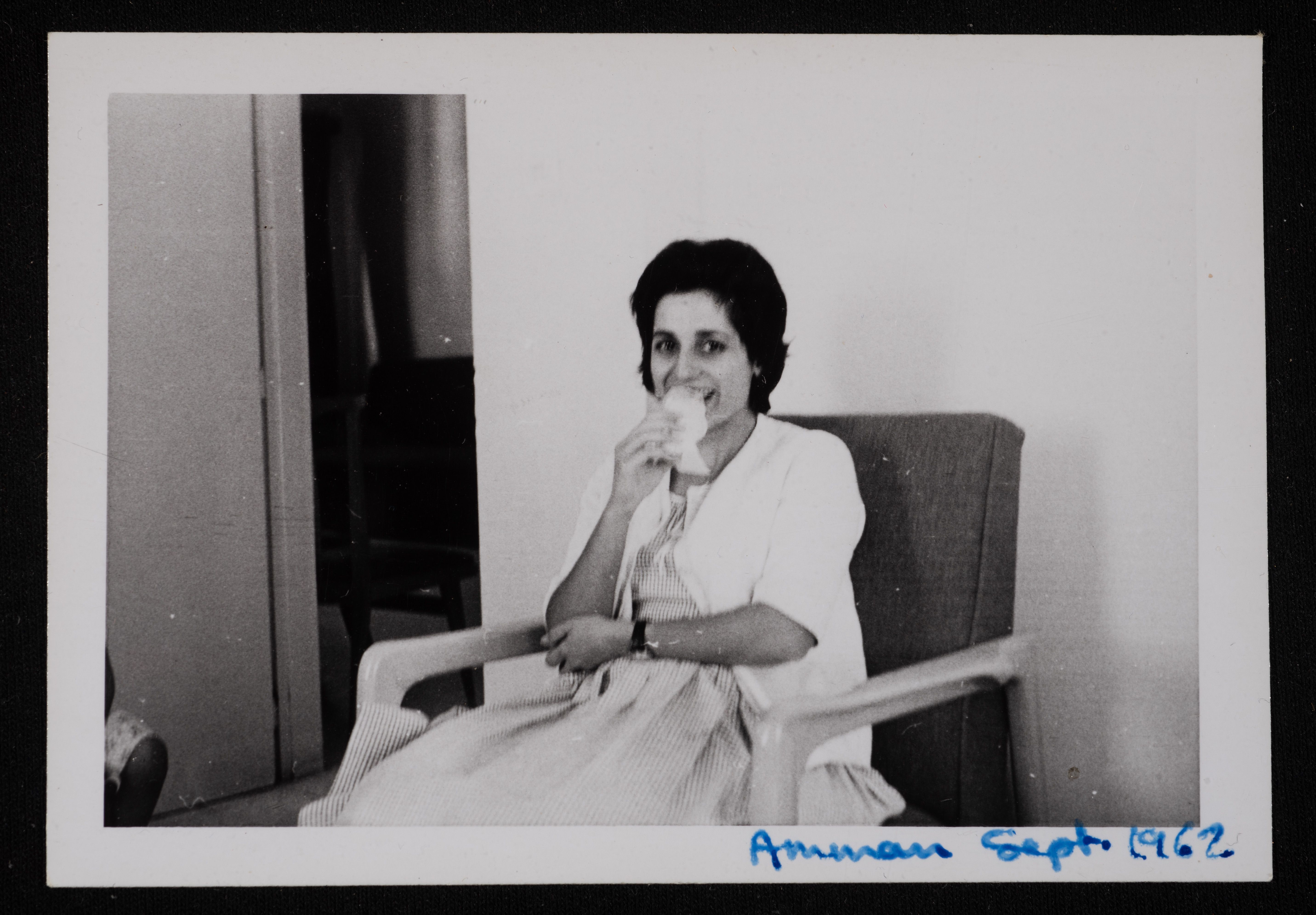 امرأة من عائلة بطشون تتناول المثلجات في منزلها في عمان بعد هجرة العائلة من يافا خلال نكبة عام 1948، التقطت الصورة في أيلول 1962.