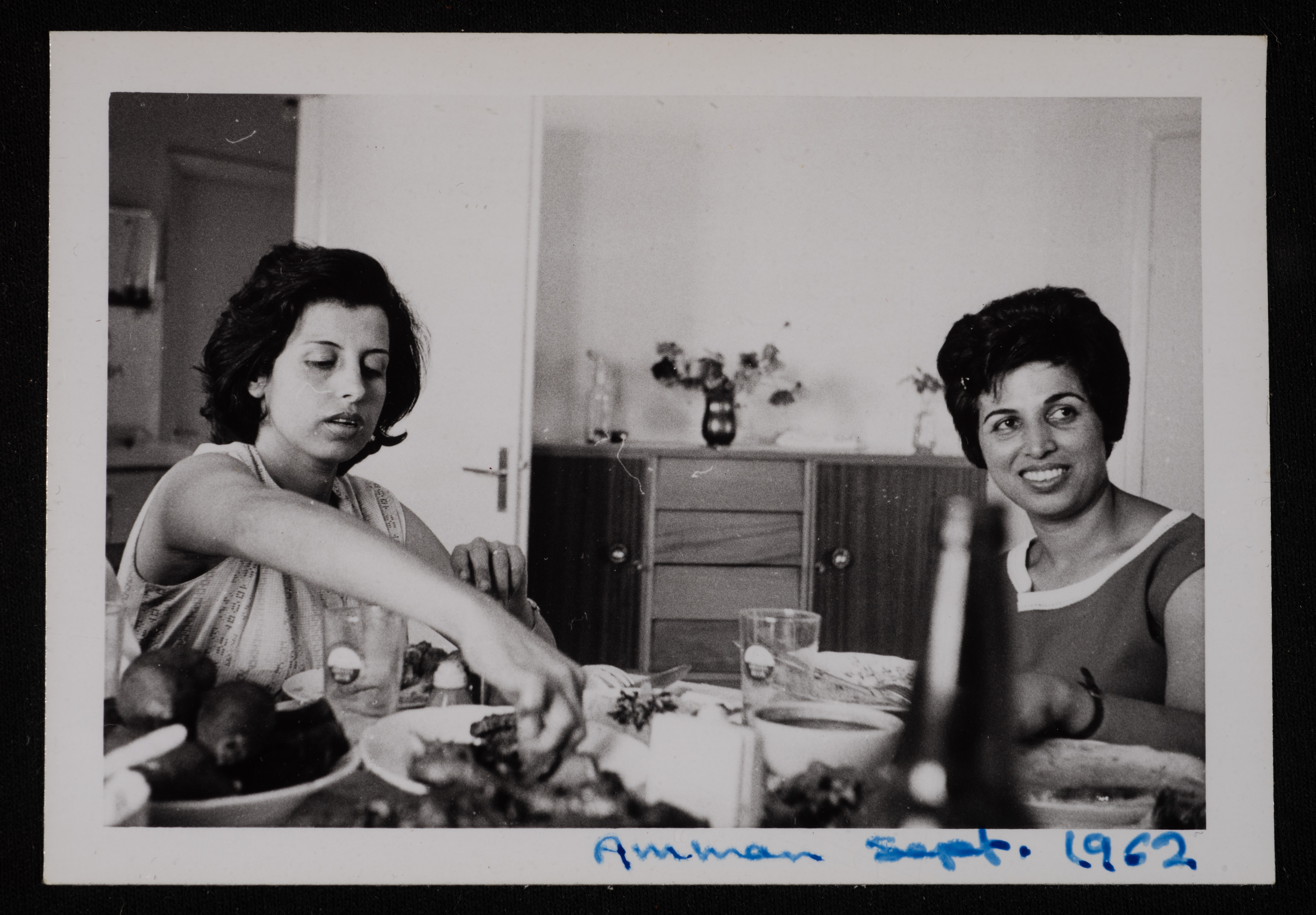 صورة لنهى بطشون وشقيقتها خلال تناولهن الطعام في منزل العائلة في عمان حيث تم تهجير العائلة من يافا خلال نكبة عام 1948، التقطت الصورة في أيلول 1962.