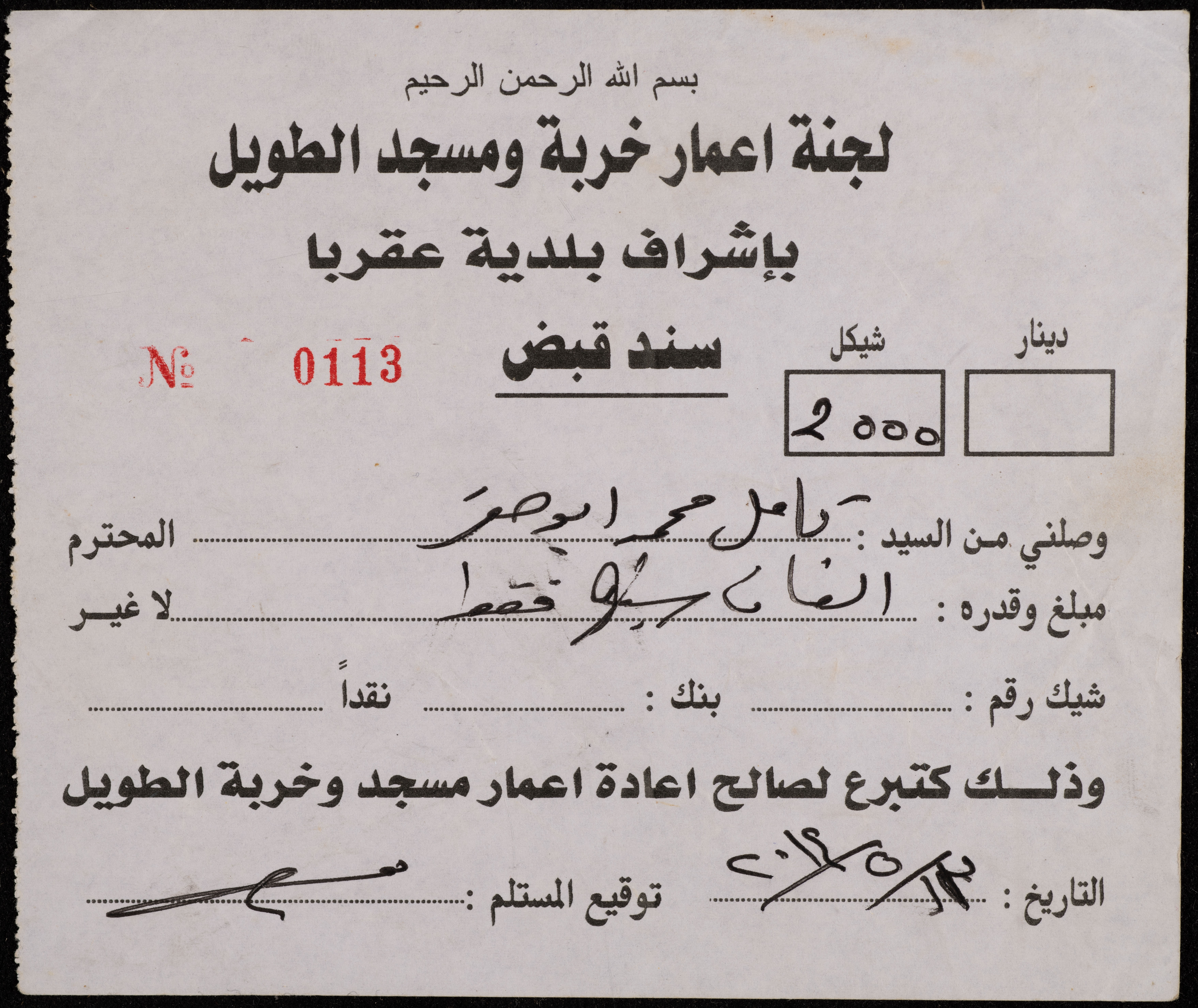 سند قبض صادر عن لجنة إعمار خربة ومسجد الطويل بإشراف بلدية عقربا، بتاريخ 13 أيار 2014، لكامل محمد أبو صقر بقيمة المبلغ الذي تبرع به.