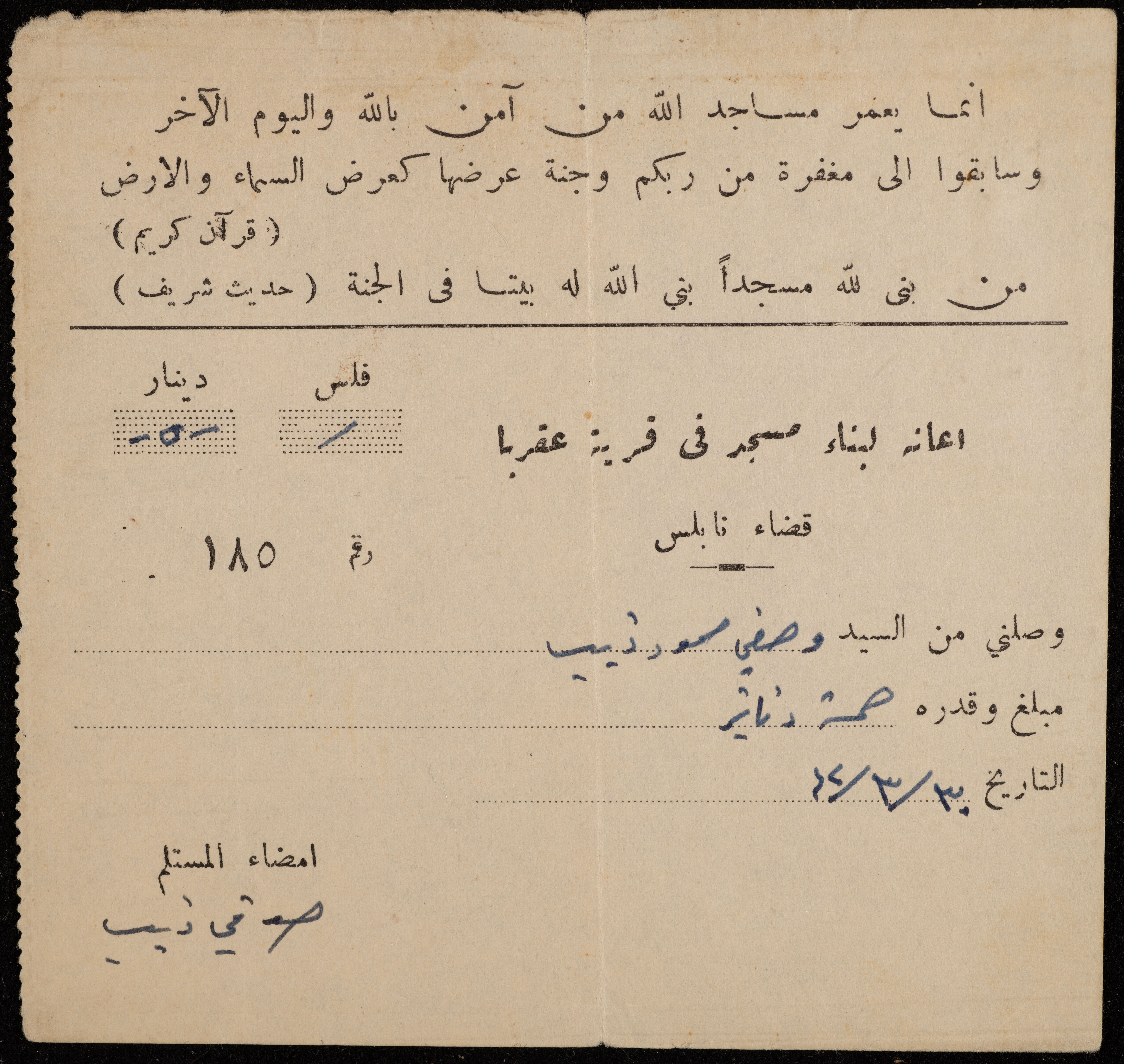 سند قبض صادر عن لجنة إعانة لبناء مسجد عقربا، بتاريخ 30 آذار 1962، لوصفي محمود ذيب، بقيمة المبلغ الذي تبرع به مساهمة في بناء المسجد.
