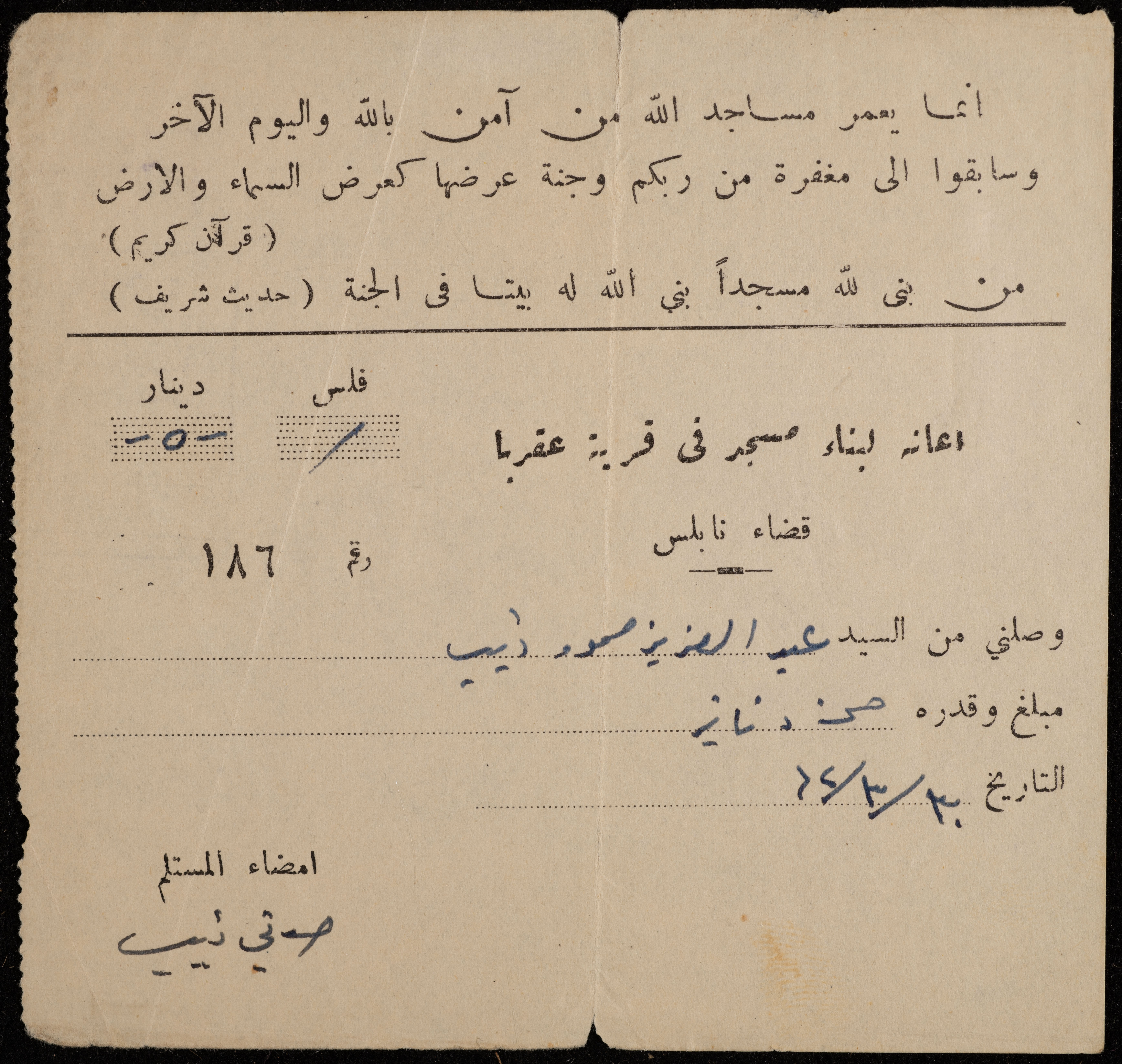 سند قبض صادر عن لجنة إعانة لبناء مسجد عقربا، بتاريخ 30 آذار 1962، لعبد العزيز محمود ذيب، بقيمة المبلغ الذي تبرع به مساهمة في بناء المسجد.