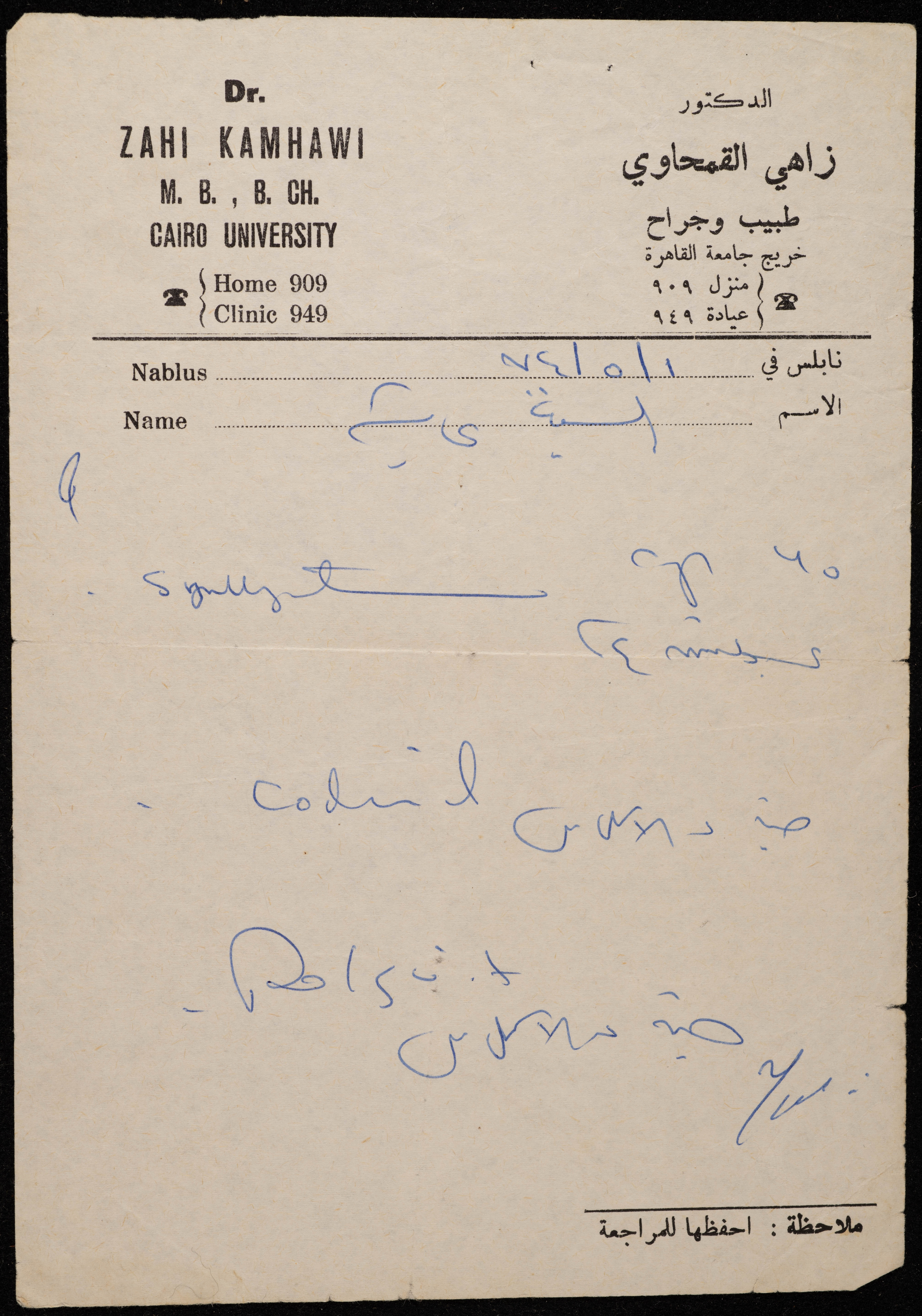 وصفة طبية كتبها الطبيب زاهي القمحاوي، بتاريخ 1 أيار 1974، باسم السيدة عائشة.