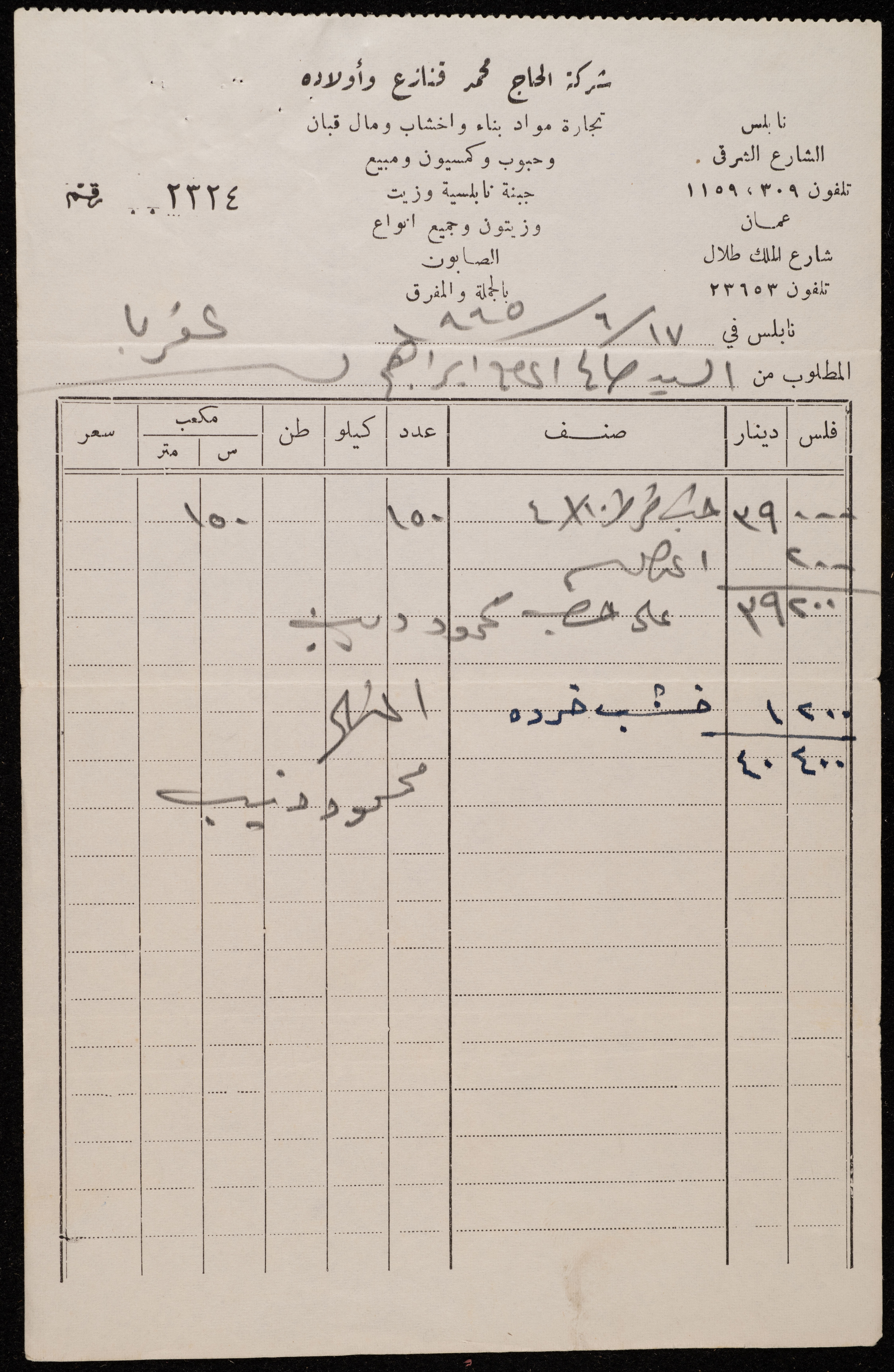 فاتورة صادرة عن شركة الحاج محمد قنازع وأولاده، بتاريخ 17 حزيران 1965، باسم صالح الحاج إبراهيم من قرية عقربا، احتوت على كميات وأسعار الأصناف التي اشتراها.