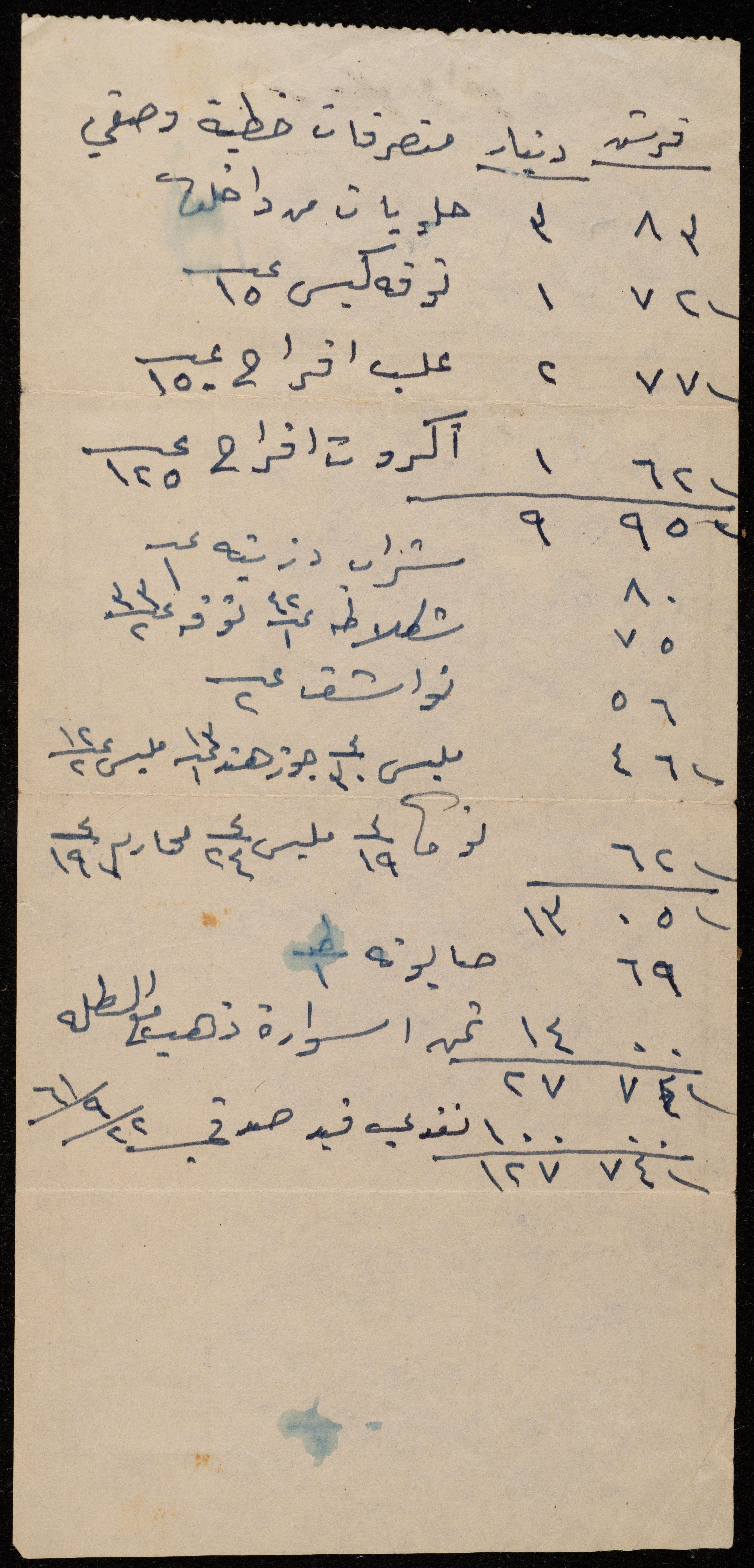 فاتورة صادرة عن محلات ياسر شقو وإخوانه في نابلس، بتاريخ 20 أيلول 1961، لمحمود ذيب من قرية عقربا، احتوت على كميات وأسعار الأصناف التي اشتراها.