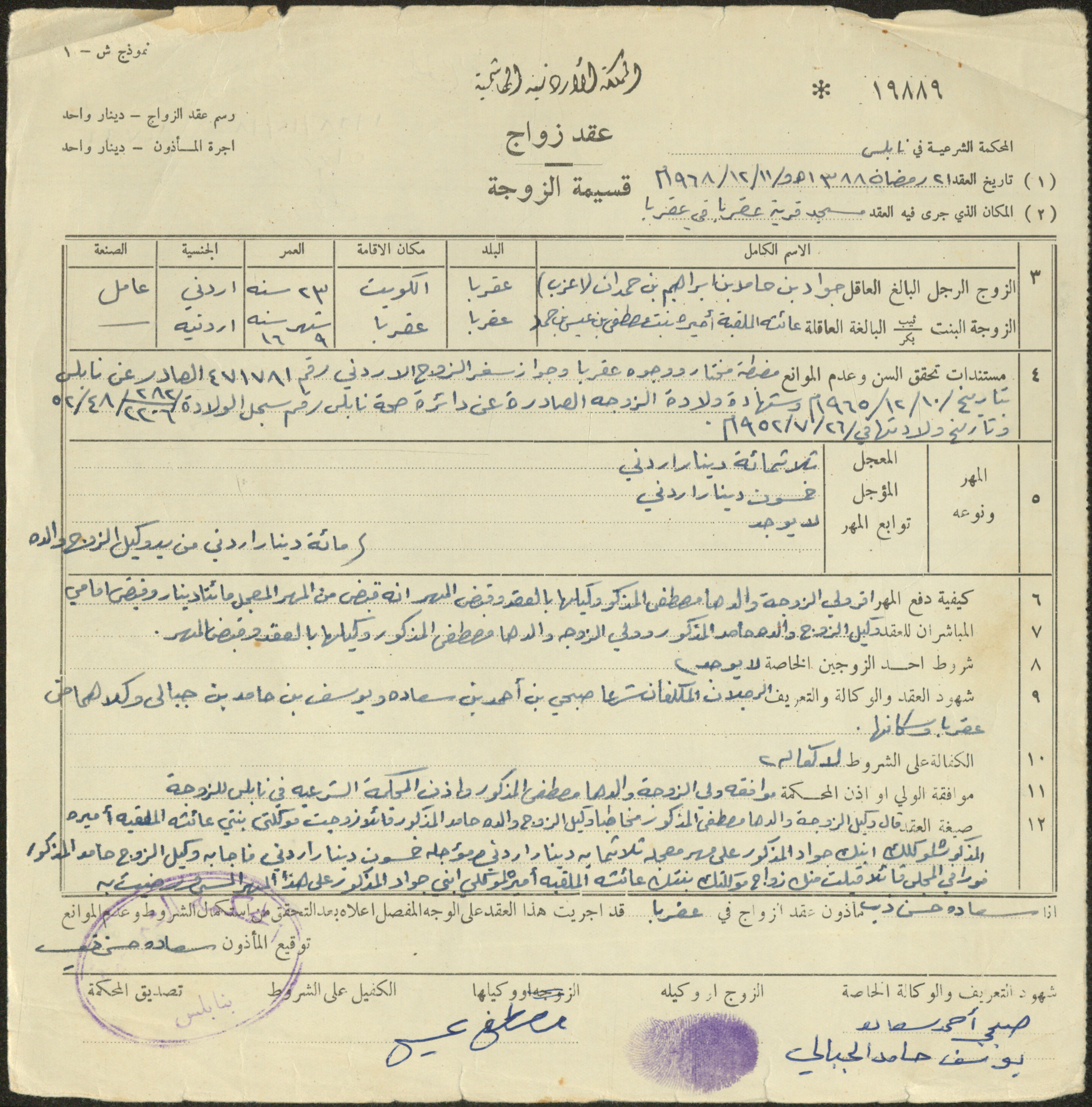 عقد زواج عائشة حمد وجواد حمدان، 11 كانون الأول 1968