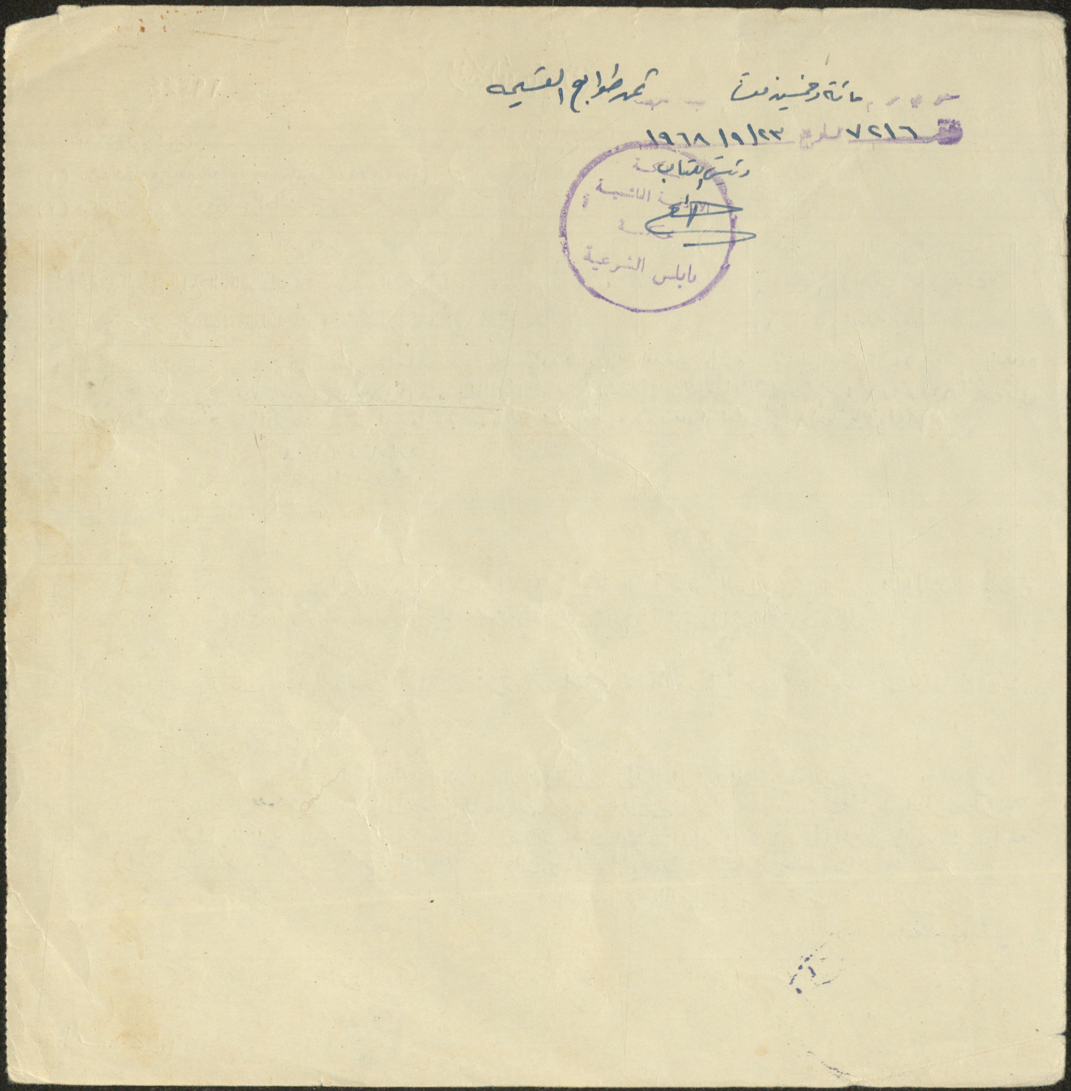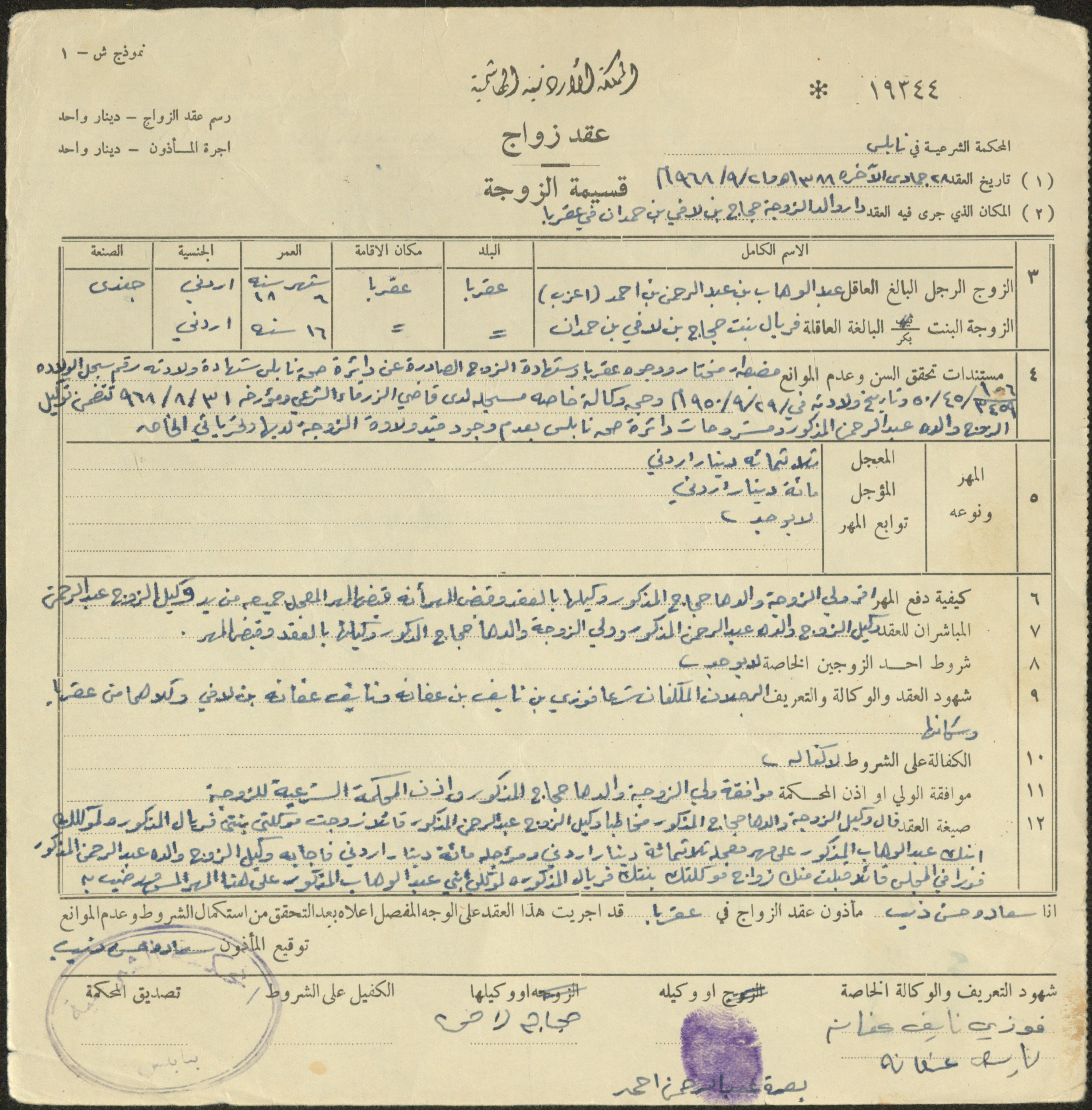 عقد زواج صادر عن محكمة نابلس الشرعية بتاريخ 21 أيلول 1968، أجراه مأذون قرية عقربا الشيخ سعادة حسن ذيب، للزوجين فريال حجاج لافي حمدان وعبد الوهاب عبد الرحمن أحمد.