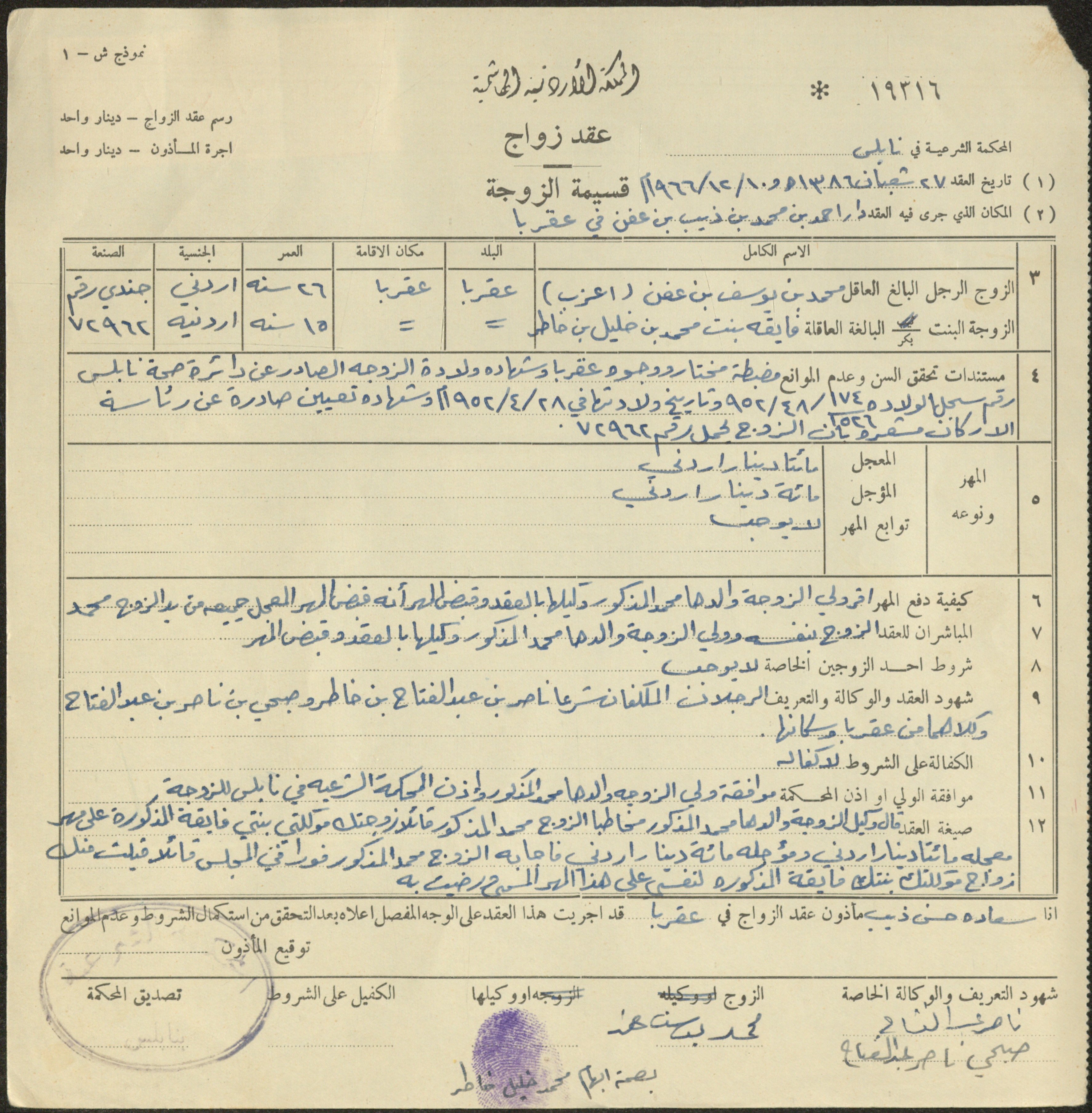 The Marriage Contract of Fayqa Khater and Mohammad Afan, Aqraba, 10 December 1966
