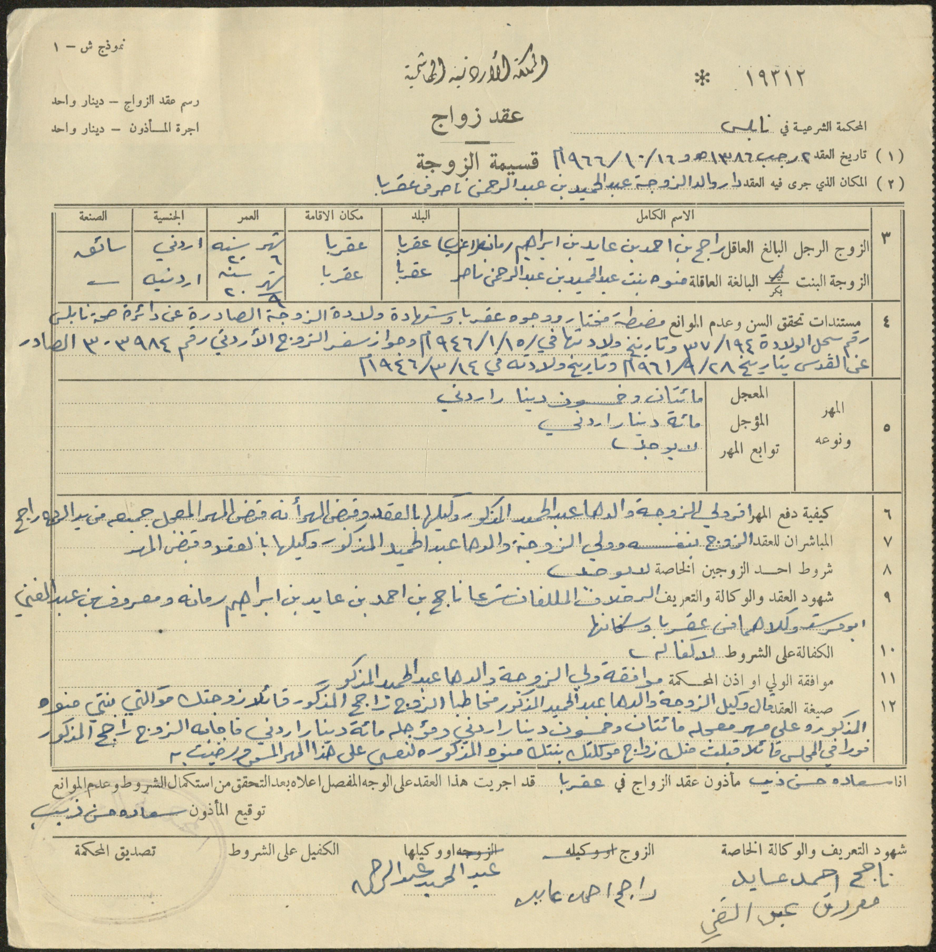 عقد زواج صادر عن محكمة نابلس الشرعية بتاريخ 16 تشرين الأول 1966، أجراه مأذون قرية عقربا الشيخ سعادة حسن ذيب، للزوجين منوة عبد الحميد عبد الرحمن ناصر وراجح عايد أحمد إبراهيم رمانه.