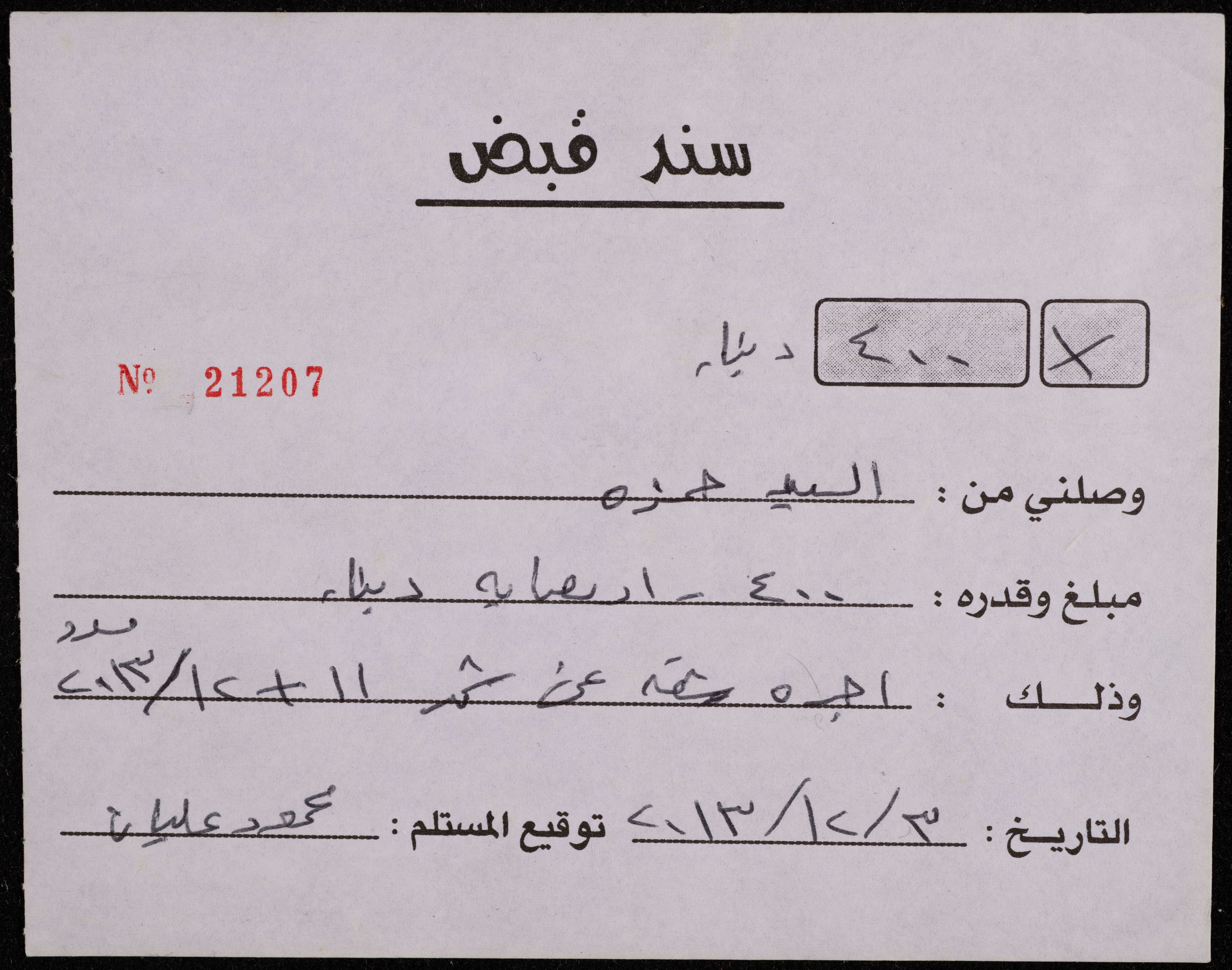 سند قبض صادر بتاريخ 3 كانون الأول 2013، عن محمد عليان لـ "حمزة"، بدل دفعه إيجار شقة عن شهري تشرين الثاني وكانون الأول من ذات العام. وجد السند في مجموعة حمزة عقرباوي.