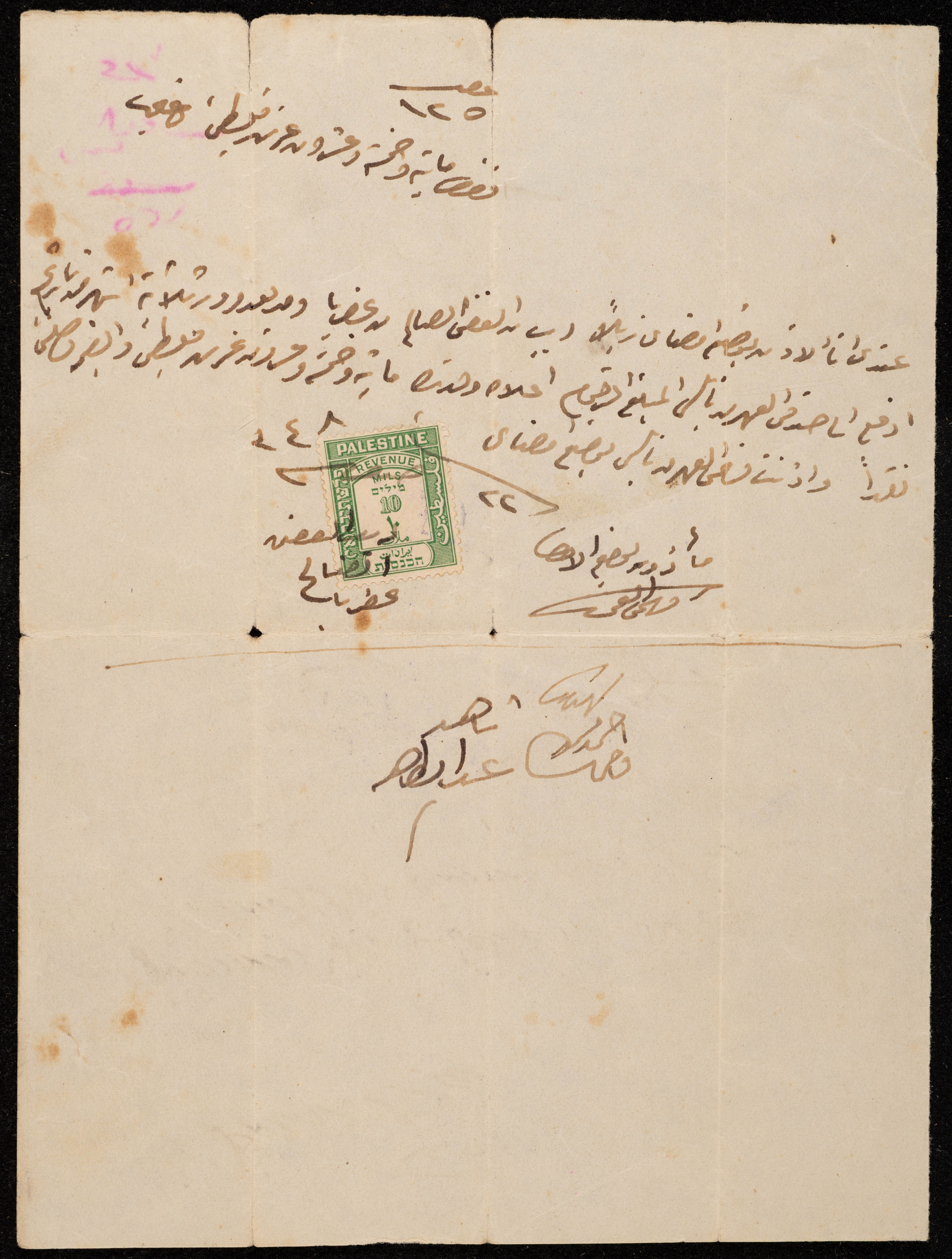 تعهد بالدفع صادر عام 1929 أقر بموجبه ديب العفن الصالح من قرية عقربا، قضاء نابلس، أنه سيدفع مبلغ 125 قرشاً فلسطينياً لصدقي العمد من مدينة نابلس بعد ثلاثة أشهر.