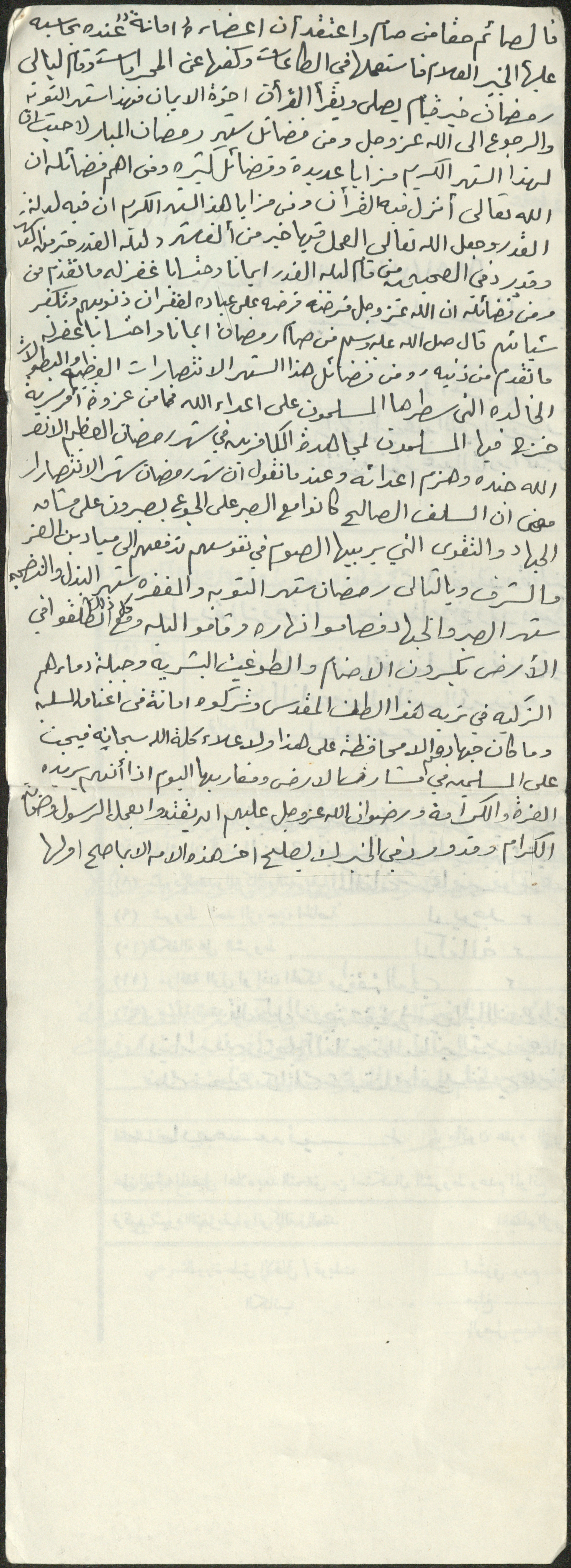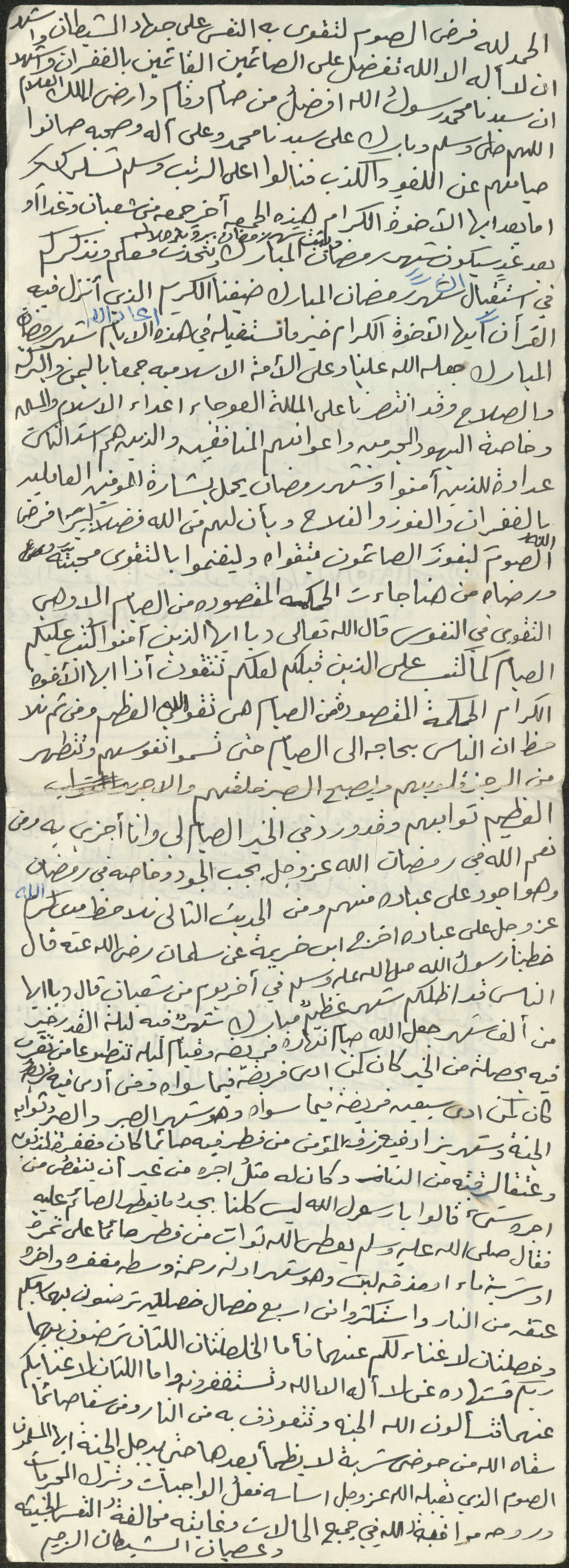نص خطبة صلاة جمعة للشيخ سعادة حسن ذيب المراشدة، إمام وخطيب مسجد في قرية عقربا ما بين عامي 1962 و2002، تحدث خلالها عن فضائل شهر رمضان.