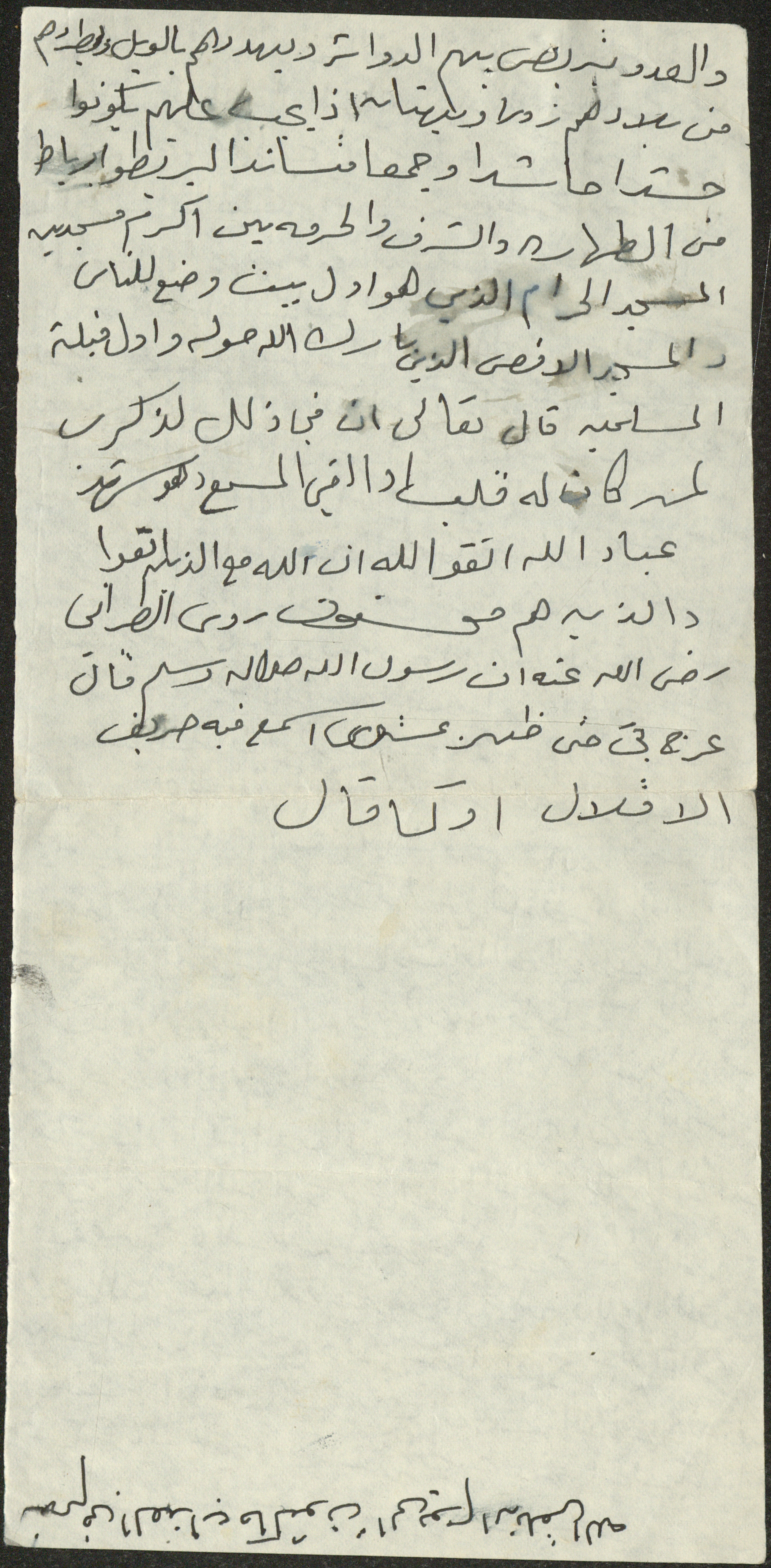 نص خطبة صلاة جمعة للشيخ سعادة حسن ذيب المراشدة، إمام وخطيب مسجد في قرية عقربا ما بين عامي 1962 و2002، تحدث فيها عن يوم القيامة.