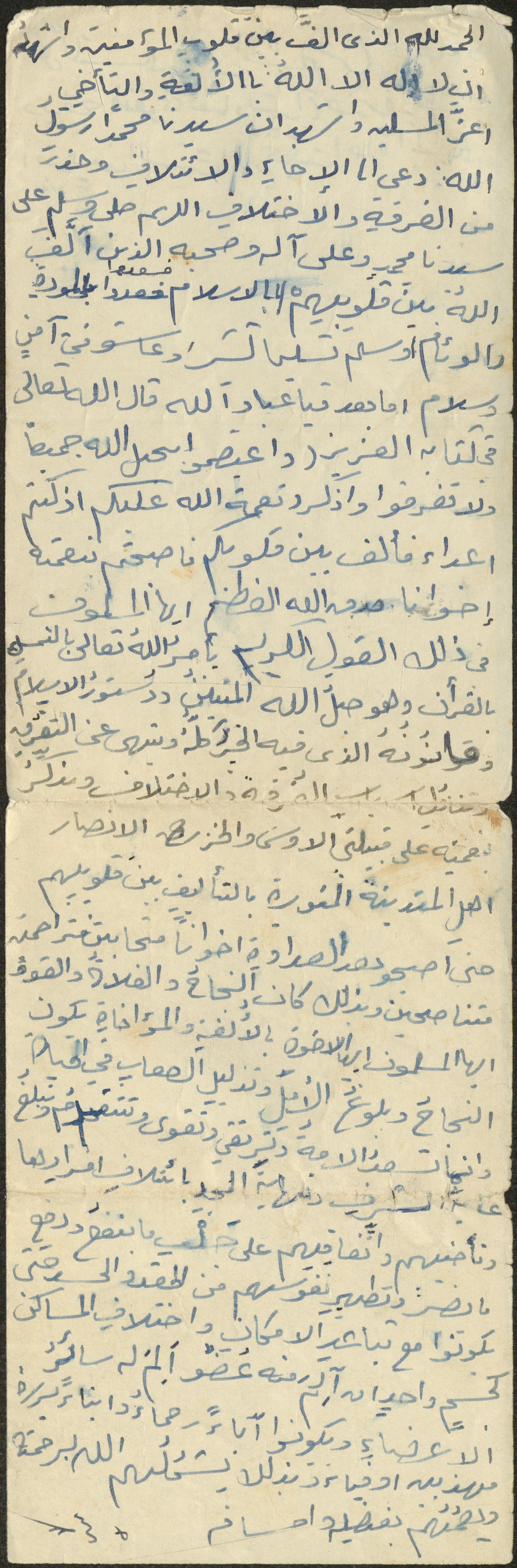 This document shows the text of a Friday Khutba by Sheikh Sa'adeh Hasan Theeb al-Marashdeh, the imam and khatib at Aqraba Mosque from 1962 to 2002, in which he urged Muslims to foster a sense of brotherhood and unity among themselves.