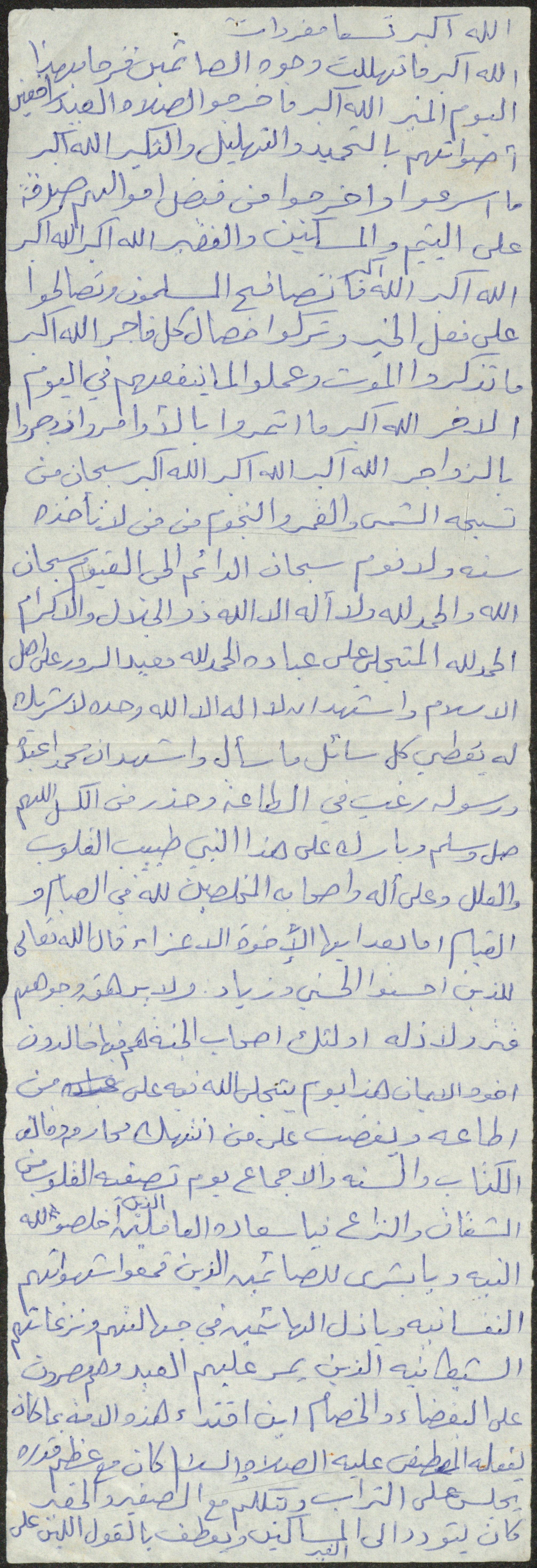 This document shows the text of a Khutba by Sheikh Sa'adeh Hasan Theeb al-Marashdeh, the imam and khatib at Aqraba Mosque from 1962 to 2002, which he gave on the first day of Eid al-Fitr.