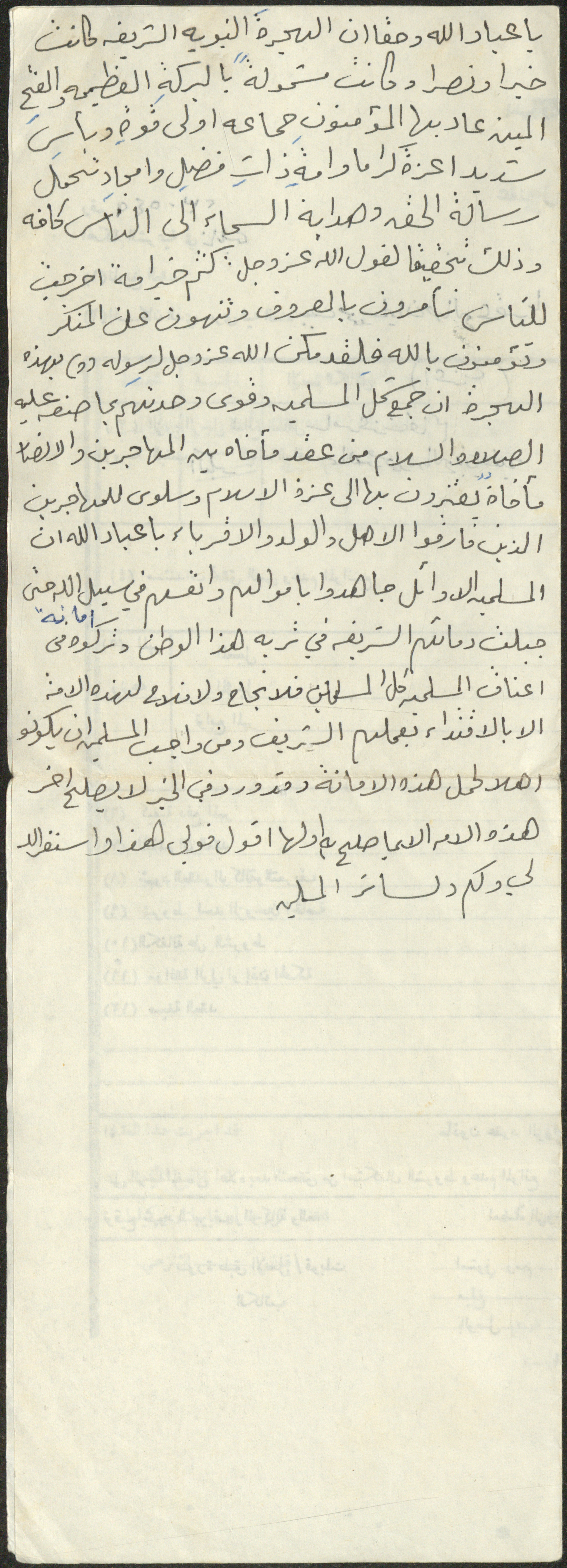 نص خطبة صلاة جمعة للشيخ سعادة حسن ذيب المراشدة، إمام وخطيب مسجد في قرية عقربا ما بين عامي 1962 و2002، تحدث فيها عن العبرة من الهجرة النبوية من مكة المكرمة إلى المدينة المنورة.