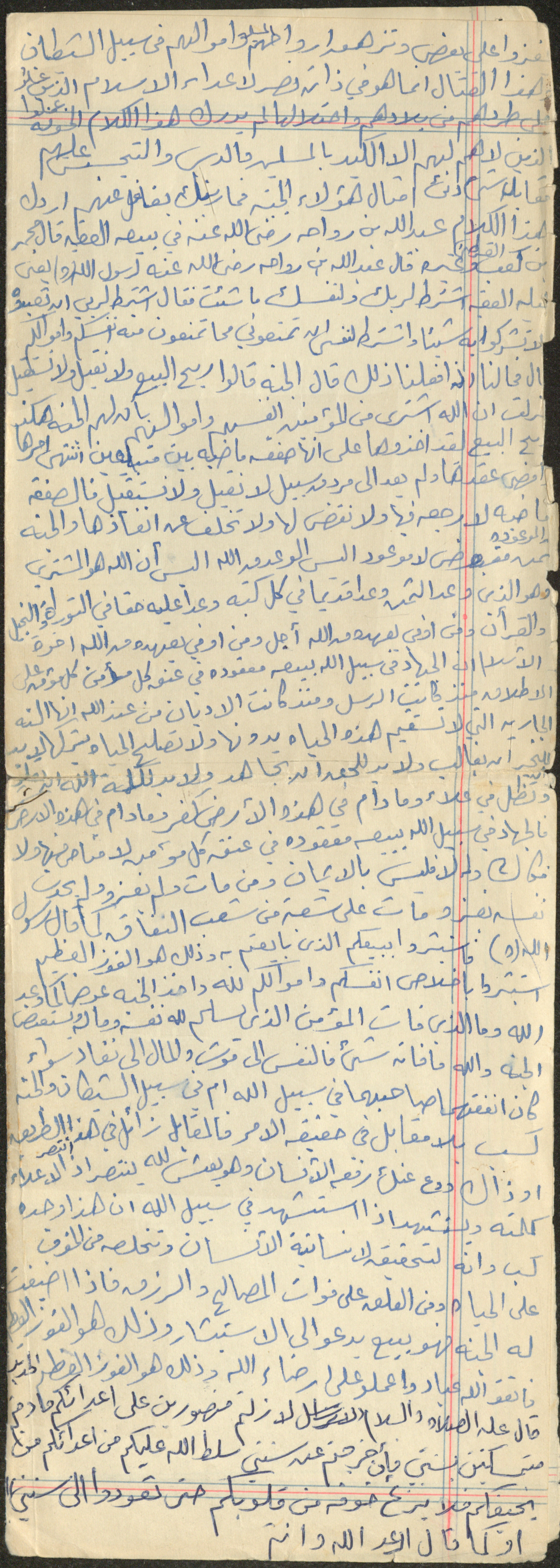 نص خطبة صلاة جمعة للشيخ سعادة حسن ذيب المراشدة، إمام وخطيب مسجد في قرية عقربا ما بين عامي 1962 و2002، يؤكد فيها على أهمية الجهاد في سبيل الله.