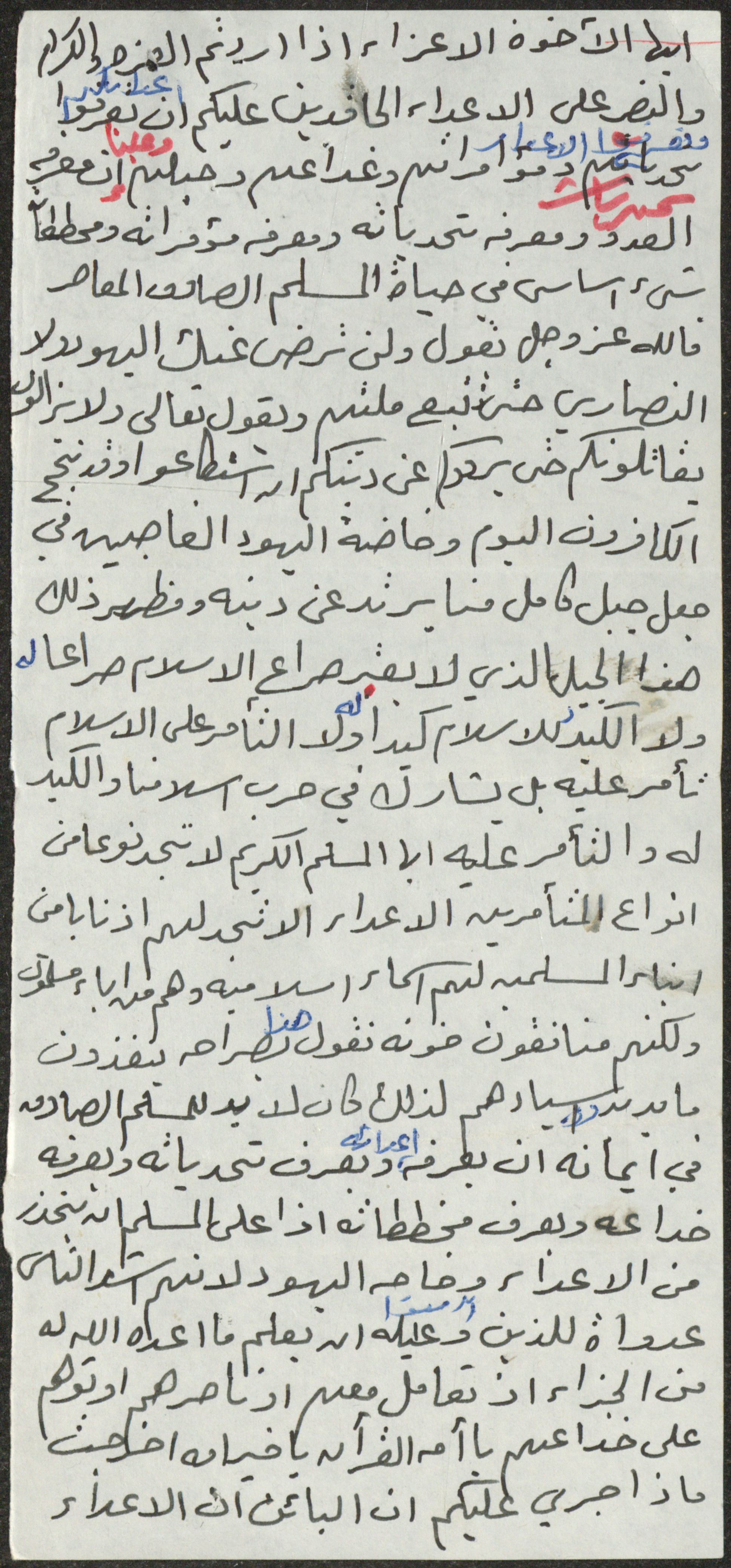 This document shows the text of a Friday Khutba by Sheikh Sa'adeh Hasan Theeb al-Marashdeh, the imam and khatib at Aqraba Mosque from 1962 to 2002, in which he emphasized the necessity to be aware of the enemies of Muslims.