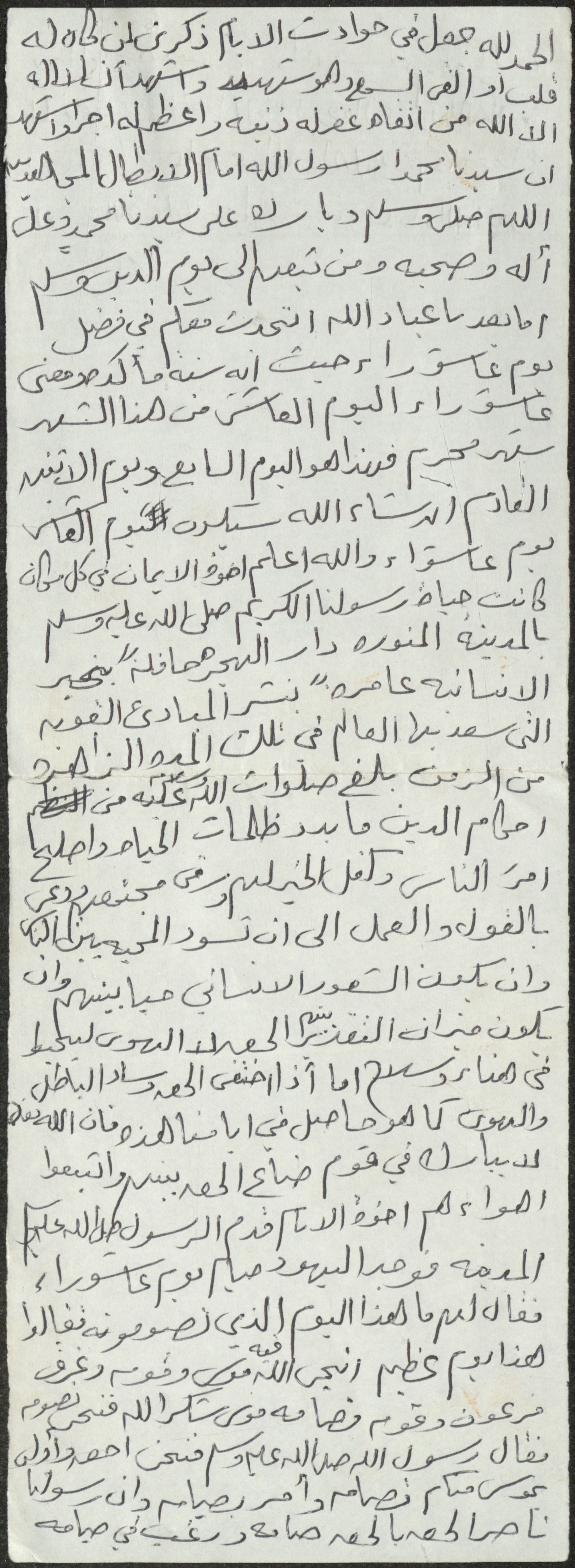 نص خطبة صلاة جمعة للشيخ سعادة حسن ذيب المراشدة، إمام وخطيب مسجد في قرية عقربا ما بين عامي 1962 و2002، تحدث فيها عن يوم عاشوراء وفضله.