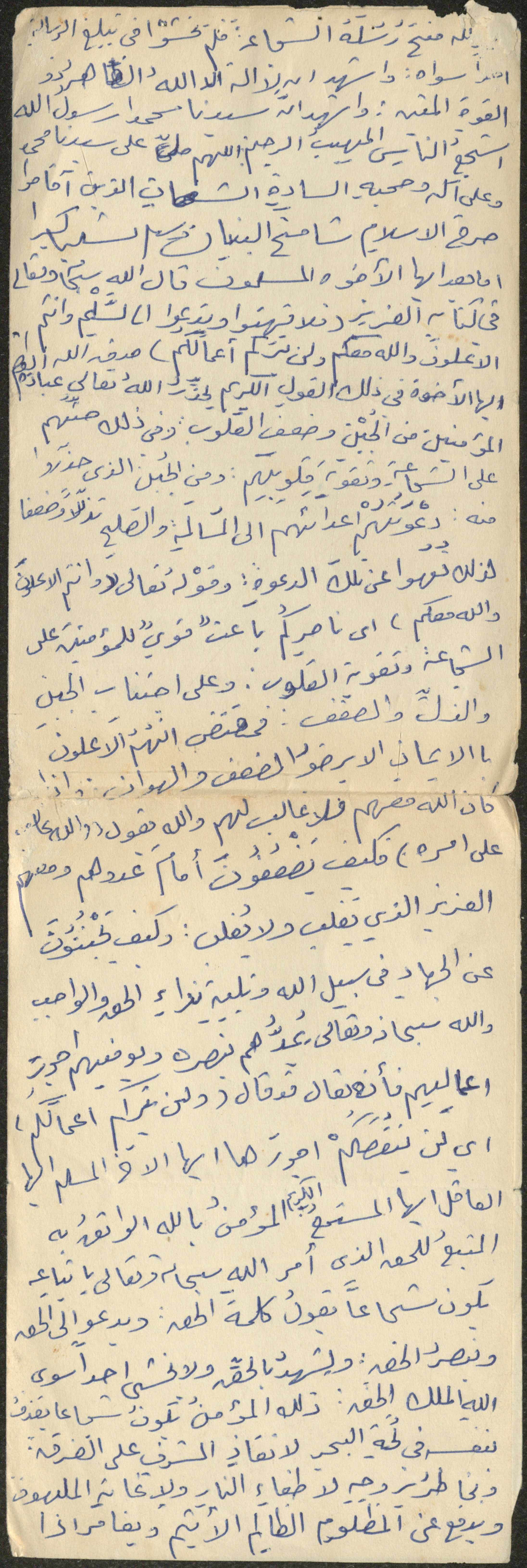 نص خطبة صلاة جمعة للشيخ سعادة حسن ذيب المراشدة، إمام وخطيب مسجد في قرية عقربا ما بين عامي 1962 و2002، يحذر فيها المؤمنين من الجبن وضعف القلوب أمام أعداء الإسلام.