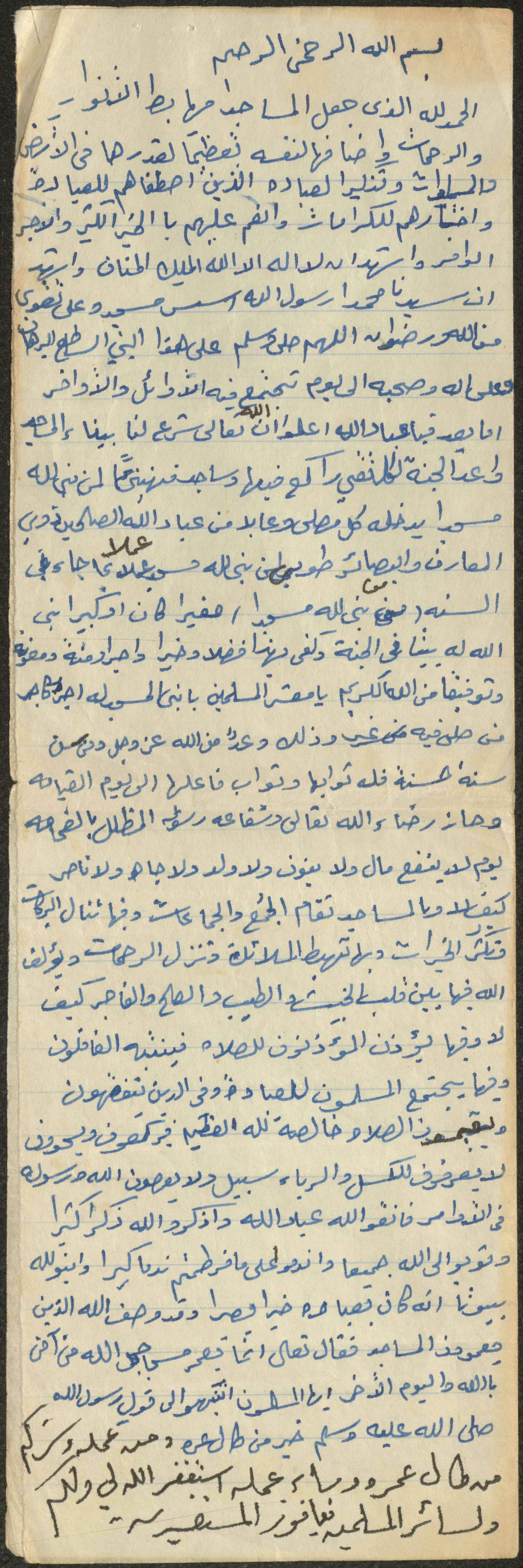 نص خطبة صلاة جمعة للشيخ سعادة حسن ذيب المراشدة، إمام وخطيب مسجد في قرية عقربا ما بين عامي 1962 و2002، تحدث فيها عن أهمية بناء المساجد.